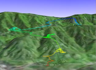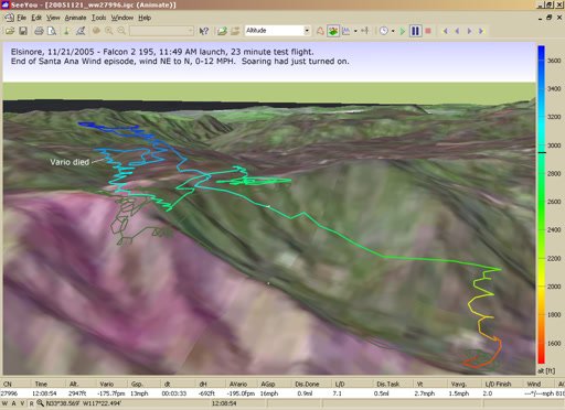 Fun flying on my 225. Cloudbase 5700. went to Crestline, then Pine. Save from 3100 out front. Landed quite low, but OK. Tim C. blew launch w/Fusion at UM (I didn't see it). |