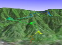 Cycling in again, a little less North. Soared at ridge-top height near launch for a few passes. Followed zero-sink straight out over the big house below launch, then went across to the South spine, somewhat low. Caught an actual thermal over the spine and climbed from 2400 to 3400 in it with about 15 circles. Dove to the LZ and did a left-hand approach, for something different. I flew up the cleared slot, basically pointed at launch. I turned left and crossed the trees, then left again into the slot between the trees and the hillside. Left around the last trees put me in the same spot I'd been hitting with the right-hand approaches. The drawbacks to this left-hand approach are the downhill glide, losing sight of the target, and tending to float near trim downwind of the trees. But not a big deal, really. Normal. |