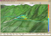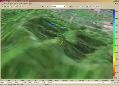 Finally a non-sledder to get a screenshot of! There were some PGs working over by Regionals. I headed East down the spine) to the radio towers (which are KFRG, we found out Thursday - the owner visited the top of Marshall) Not much going on over there and I had to kind of save it from low out in front of Marshall. Flew around soaring easily but not really getting up for about 45 minutes, straight up forever. Left it at 6700 (with Len in a PG a little above me) and dove to the back ridge, where it was blowing North, so I turned tail for Marshall. Landed at the LZ in nil wind a bit after that. It turned catabatic as I folded the glider up. Beautiful, clear, comfortable day. A great 1:05 flight. Good. Minor left, worse VGT. Twisted RT up 2, lowered Left outboard sprog 1. Three missed stitches in a row at left tip LE. |