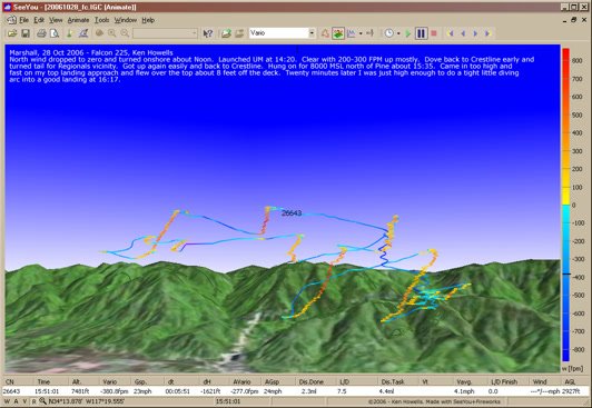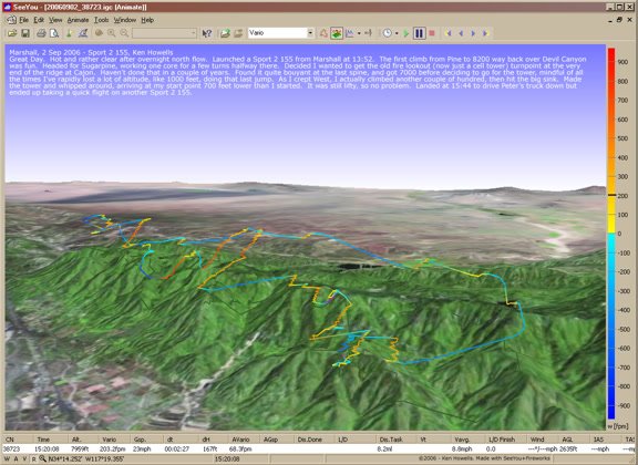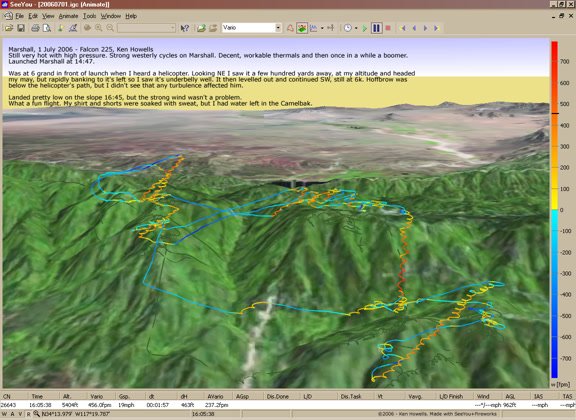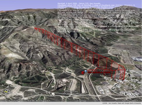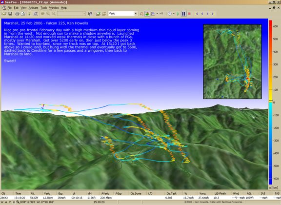 Good clear, windy, warm day. Reportedly 25 at Crestline launch mid-afternoon. Launched the 225 from the upper SW launch at Marshall, elevatoring up 150 feet after about 6 steps. Got a few hundred over, drifting back fast. Got 4100+ at Cloud Peak and Regionals. Spiralled down to Regionals then took a surprisingly long time getting back up from about halfway between Cloud Peak and the 750. Wind was blowing the thermals apart or downwind, but the faces weren't all that soarable. Headed for a medium gaggle east of Marshall and then got up and went over to Cloud again. A nice narrow but well-defined core came through and I got to 5600 drifting halfway back to Crestline, with a couple of HGs below me helping to mark the core as it drifted quickly. Parked in front of Crestline and Paivika and slowly ascended to above 6000. Went to Pine with Hoffbrow for a while, then back to Regionals and Marshall. Was only getting 4250 most of the time at Marshall. Top landed into moderately strong but smooth flow, just after Randy, at 5:41. |