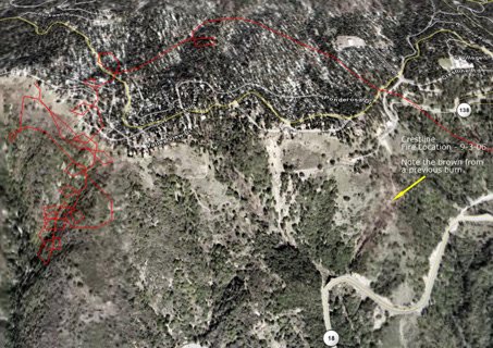 Similar to Saturday, but stronger base wind. Gusting to around 20 at Crestline. I launched a Sport 2 155 at 14:51, did a few passes over launch, and then was at 6350 at 14:58. Headed to the Interchange, climbed to 6800, then the next spine, got to 6900. Went to the spine out in front of Strawberry Peak, but the wind was blowing the cores apart. I kept getting lone circles of 100-200 up, and eventually dipped down below 6000 while working back west of the Cliffhanger. Decided to run out the spine on the east side of Waterman Canyon and see if I could catch a nice core that I could climb with for a long time while it drifted toward Strawberry. At 15:25 was at 5200 over Arrowhead Peak vicinity and 9 minutes later was at 7700 over strawberry, thermalling with a Moyes topless. That thermal was 300-600 FPM for the most part; it weakened at about 7k and I really had to hunt to stay with the core, but then it picked up again - weak inversion? After I actually circled Strawberry I headed west along the ridge, looking for a new goal. I was really noticing how the whistling of the pip pins and streamlined corner fittings sounded like sirens, and actually was scanning the highway below for an accident and actual sirens. I was past the Cliffhanger when I spotted the smoke from the small fire near the Mountain Disposal yard, about 3/4 mile east of launch. I pointed toward the LZ, straight across Waterman Canyon (I was still at about 7k), and once I'd cleared the east spine of Marshall I dove for the LZ, where the white X was out and a number of pilots were fighting their way down to land. I considered landing on Marshall to wait out the fire, which wasn't growing and was in an accessible spot, but didn't want to be stuck on Marshall if things went badly. I noticed that there was no traffic going up Hwy. 18. So I got a 1:05 flight, got some altitude and made a goal. Many pilots had their flights cut quite short. [img_assist|nid=351|title=Crestline 9-3-06 - Google Earth view of fire location|desc=An area that burns every couple of years.|link=node|align=left|width=100|height=71]The fire was at the top of a steep ravine that has power lines running up it ( 34?13'56.84N 117?17'55.37W ). When I was living in Crestline, less than 1/2 mile from that spot, the ravine burned twice. The cause was the power lines getting overheated on a hot day (the rare need for A/C in Crestline) and igniting a pole or snapping and lighting the brush. That wa probably the cause of today's fire. In fact, the Google Earth image of the area features a brown slash in that same area from a fire sometime before the snap was taken. A spotter plane and some helicopters were active over the fire for a while, but the airspace was reopened around 17:00 and some groups of pilots got to get late-day flights in. Then there was a police helicopter circling low east of the LZ chasing target shooters. The Site Monitor did a great job coordinating with the chopper pilot on the aircraft radio. Good overall. On the stiff side VGT, but OK. A couple of wear holes on bag near zipper, 4 feet aft of handles. |