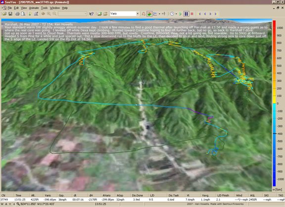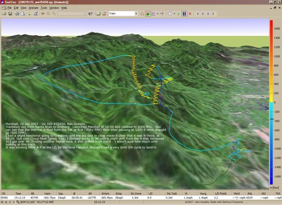 Launched in a lull between crossing-right cycles. Got under Steve and Mike below Cloud and flailed trying to find their thermals, so headed out front to find my own. Got up starting SE of the 750, went to below Marshall at 3600, but it wasn't happening there. Dove VGT into the headwind did a 270 via wingover SW of the 750 and went in and landed, quite short of the HG spot. Sweet. No turn. |