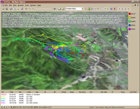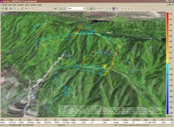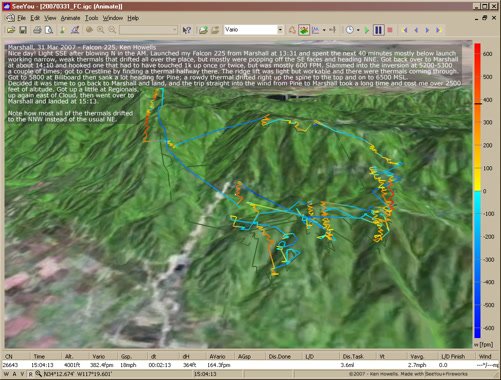Clouds starting to bank up, lower and coming from the West. Windier, 15 MPH and more SW. Cooler and moister. Flew in shirtsleeves, would have been better with a jacket. Thermalling with a crowd all near the same altitude. Went to SE side of Cloud Spine and worked a slow one alone to above Marshall. It was getting bumpier by the minute. Di was assisting a Falcon with wheels - I almost yelled that it was bumpy, but decided they knew what they were doing. After landing (a super sweet no stepper with no vertical velocity - like stepping off a curb - due to smooth SW 15 in LZ) the Falcon pilot, Andy and new hang 2 from New England, remarked that he hadn't really enjoyed it because it was pretty bumpy. His son had a long tandem with Rob. Sweet. VdVGT=57. Nice thermalling slow. |