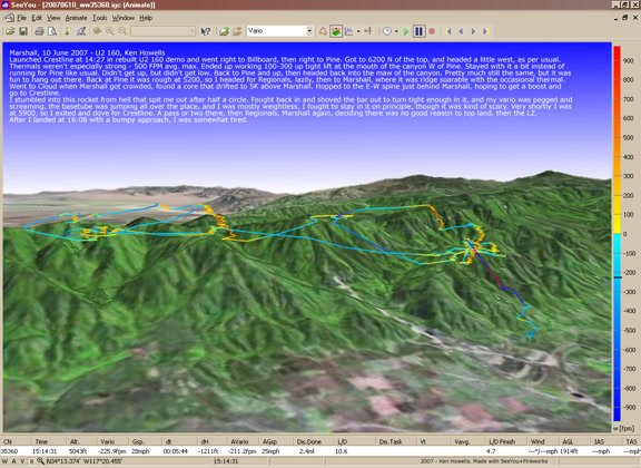 Nice day. Light SSE after blowing N in the AM. Launched at 13:31 and spent the next 40 minutes mostly below launch working narrow, weak thermals that drifted all over the place, but mostly were popping off the SE faces and heading NNE. Got back ovar to Marshall at about 14:10 and hooked one that had to have touched 1k up once or twice. Slammed into the inversion at 5200-5300 a couple of times. Got to 5200 and drifted halfway back the spine from Marshall to the 18 and was about to turn back when my vario beeped. I circled and fought to stay in a tiny one that got me to 5500, so I pointed at Crestline at MinSink, straight downwind. The ridge lift was light ubt workable and there were thermals coming through. Got to 5800 at Billboard with two HGs and a rigid wing all bunched-up, then went for Pine. Sank a lot and worked the tip of the SE spine enough to dive for the main spaine, and a rowdy thermal drifted right up it to the top. I tried to shake me off, but I persisted and was rewarded with getting to 6500. Decided it was time to go back to Marshall and land, and the trip straight into the wind from Pine to Marshall took a long time and cost me over 2500 feet of altitude. Got up a little at regionals, up again east of Cloud, then went over to Marshall, where there was sink. I did a left turn into a big arcing approach and landed at 15:13. There were a lot of pilots out flying, and I'll bet most of them had satisfying flights, especailly those who launched after 14:00. |