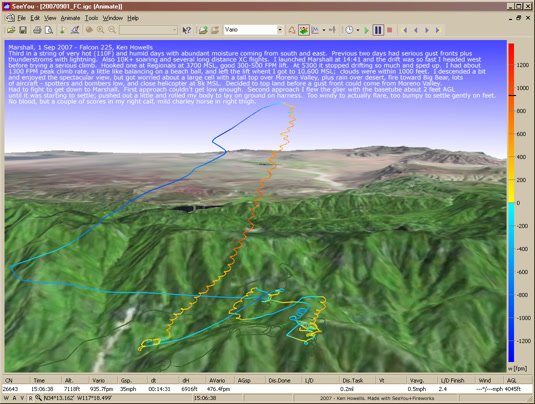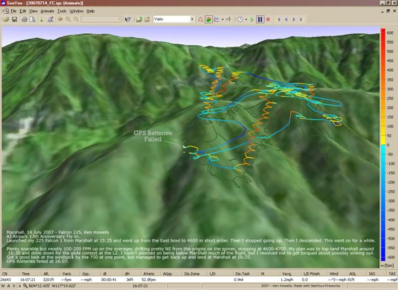 Ridge soared, ran from 500 FPM down. Missed it below Cloud Peak. Most soared > 1 Hr. Launch and airtime estimated - look up in GPS tracks, maybe. |