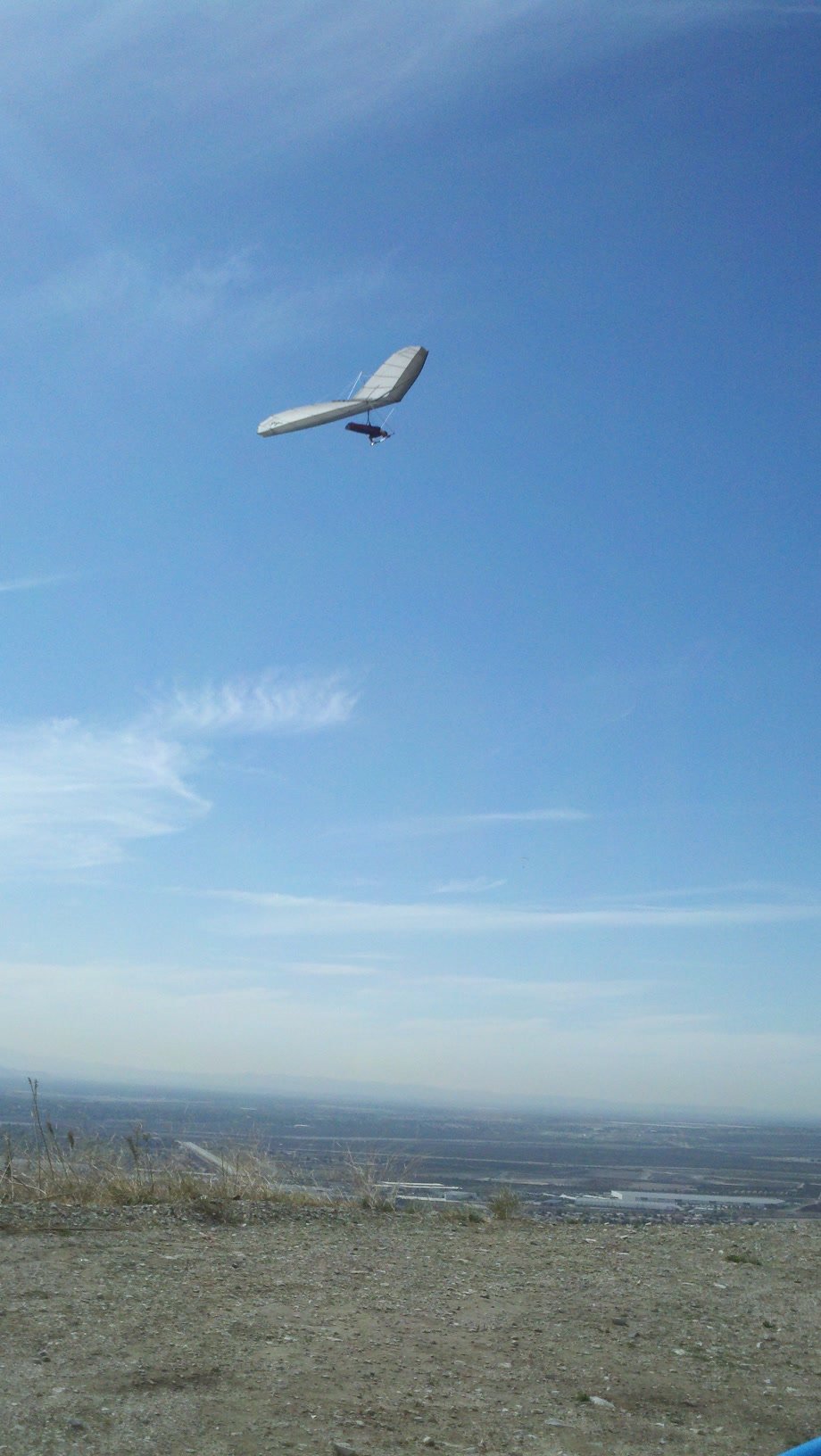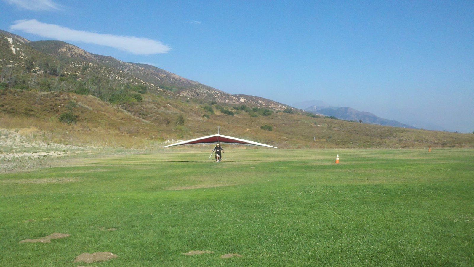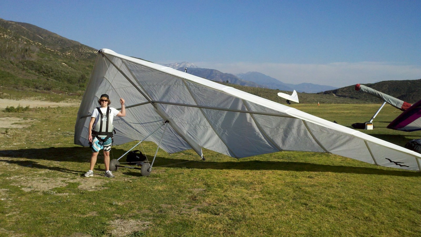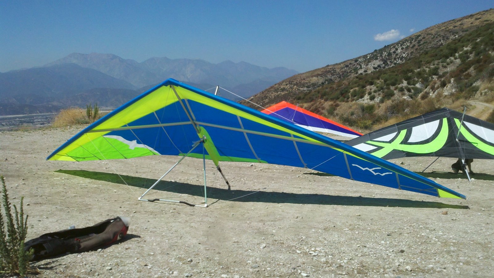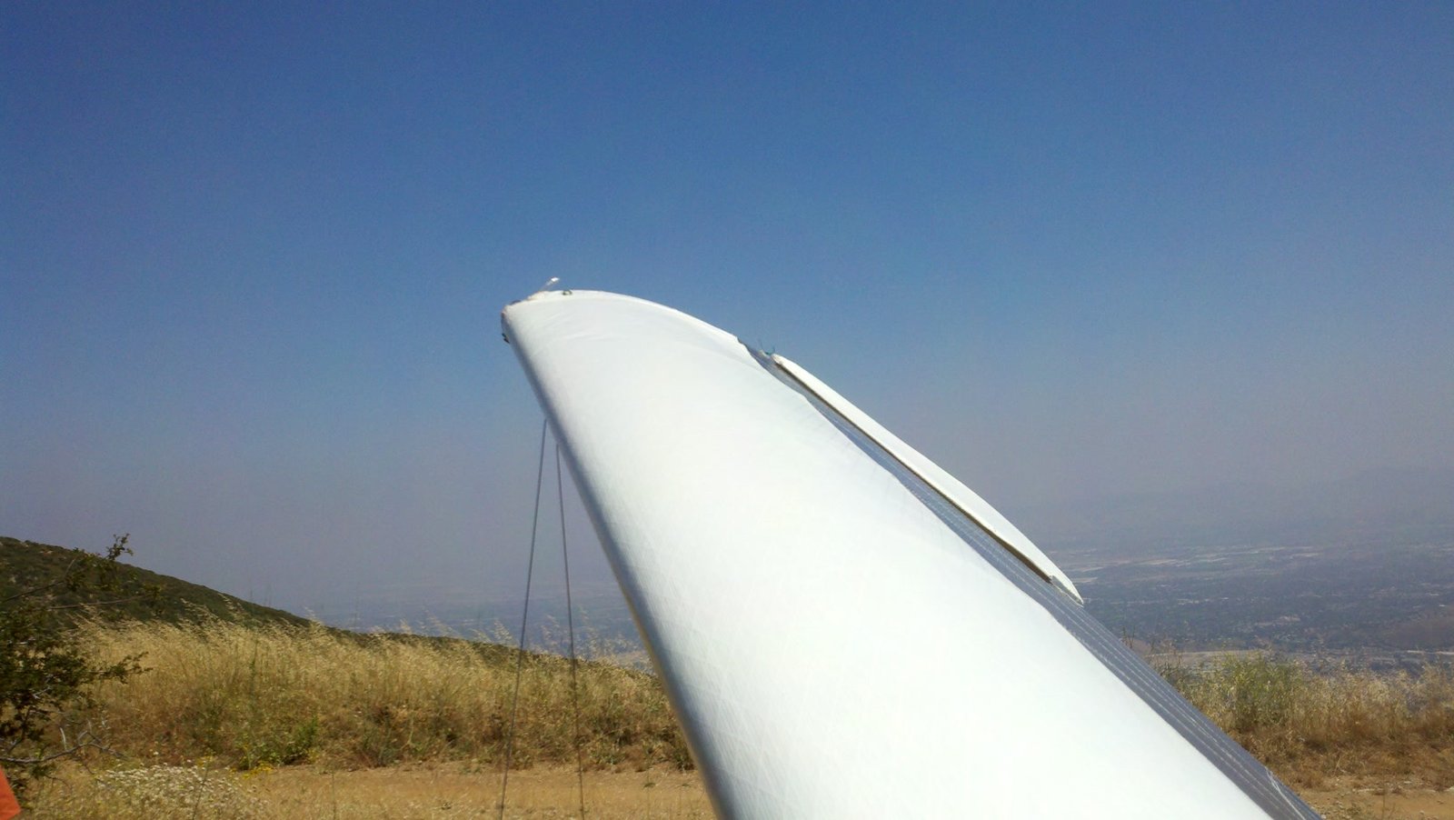 Clear and warm onshore day between Santa Ana episodes. Calm at the LZ and already a steady 5-10 SW at Regionals. Quite soarable. Nosecone wasn't attached so I flew straight to the LZ and landed. I had been ready to start my preflight and stopped to take a couple of pictures first, then re-started the preflight with the hang loop instead of at the nose area. Flew without attaching nosecone. |