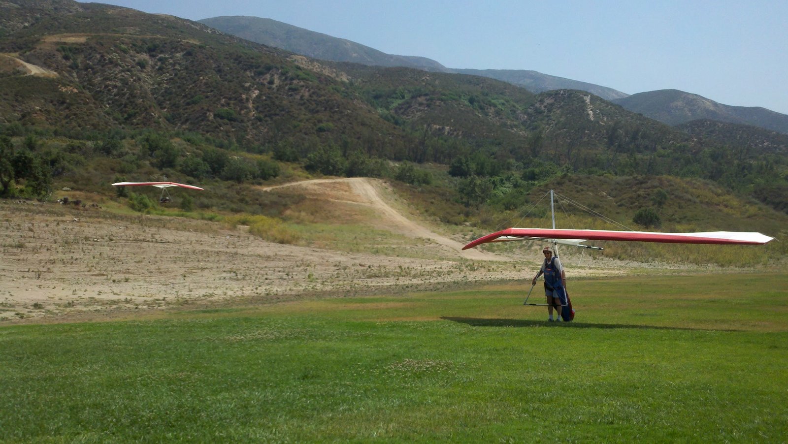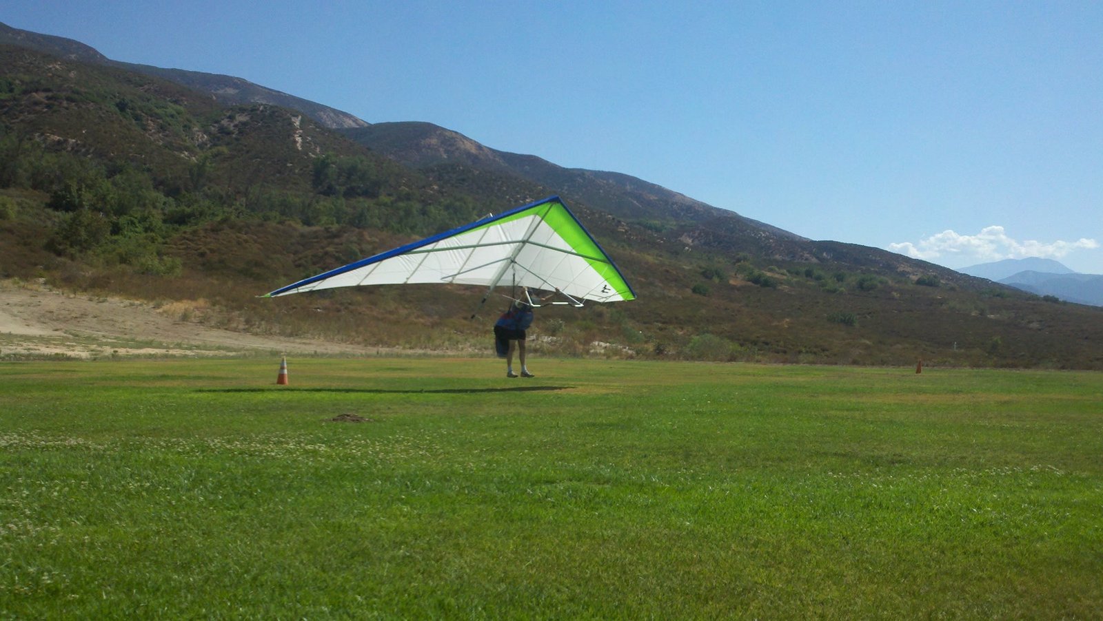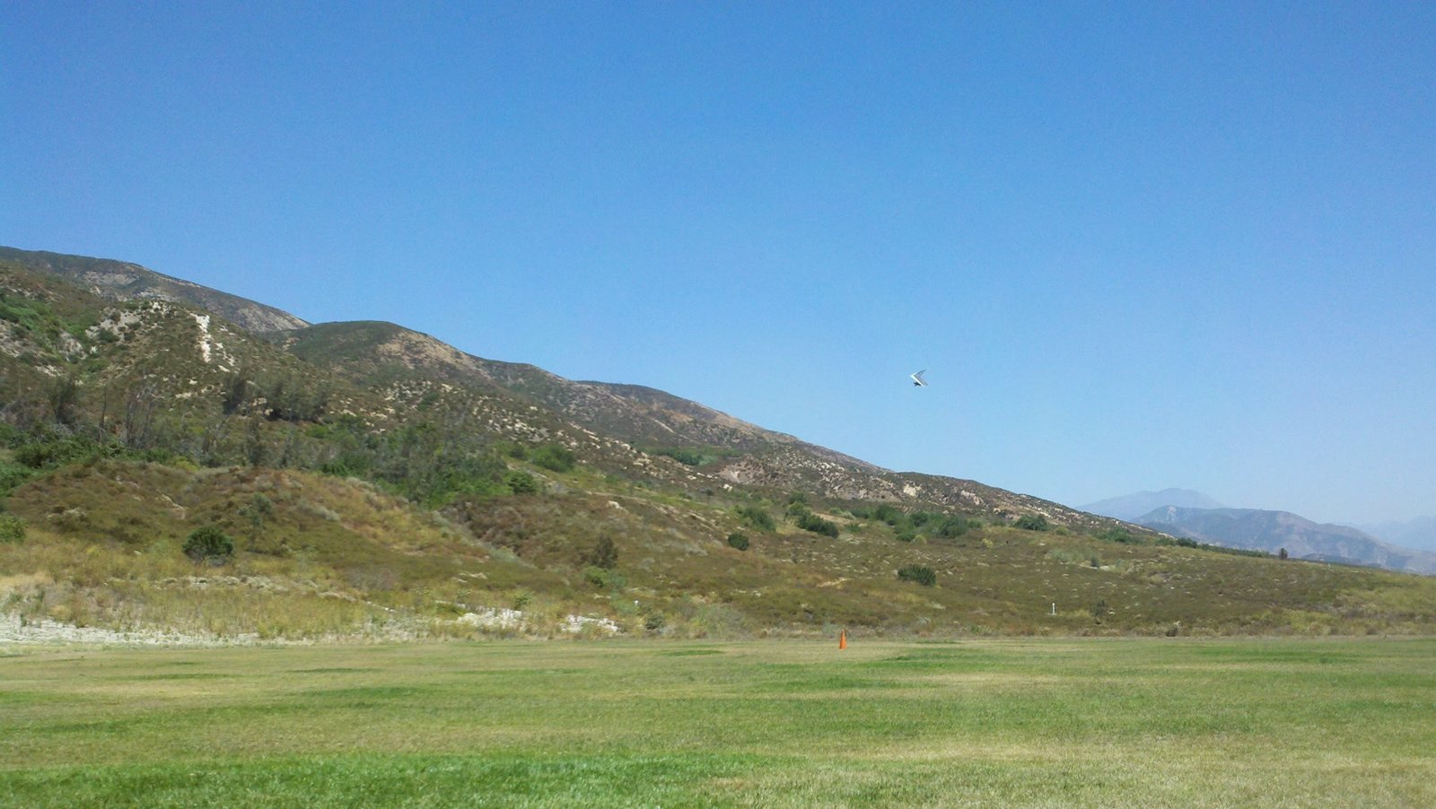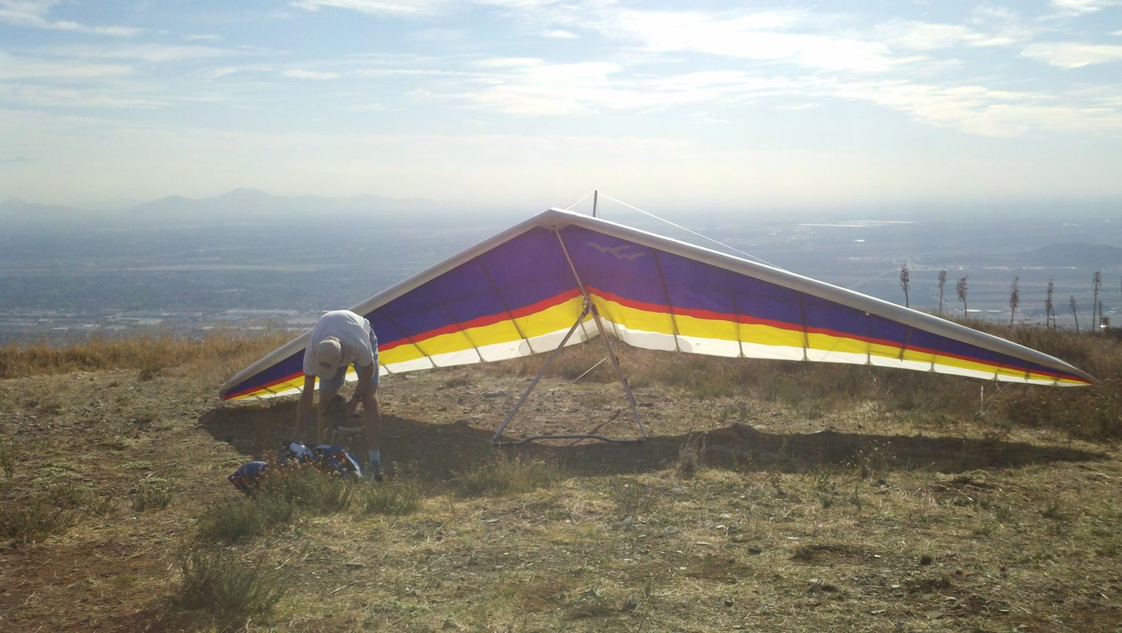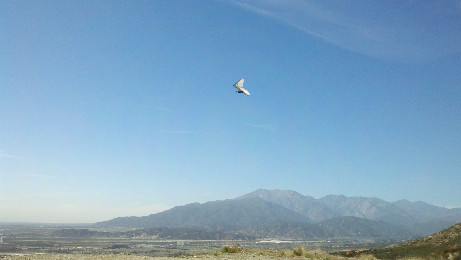 Clear and warm onshore day between Santa Ana episodes. Calm at the LZ and already a steady 5-10 SW at Regionals. Quite soarable. Nosecone wasn't attached so I flew straight to the LZ and landed. I had been ready to start my preflight and stopped to take a couple of pictures first, then re-started the preflight with the hang loop instead of at the nose area. Flew without attaching nosecone. |