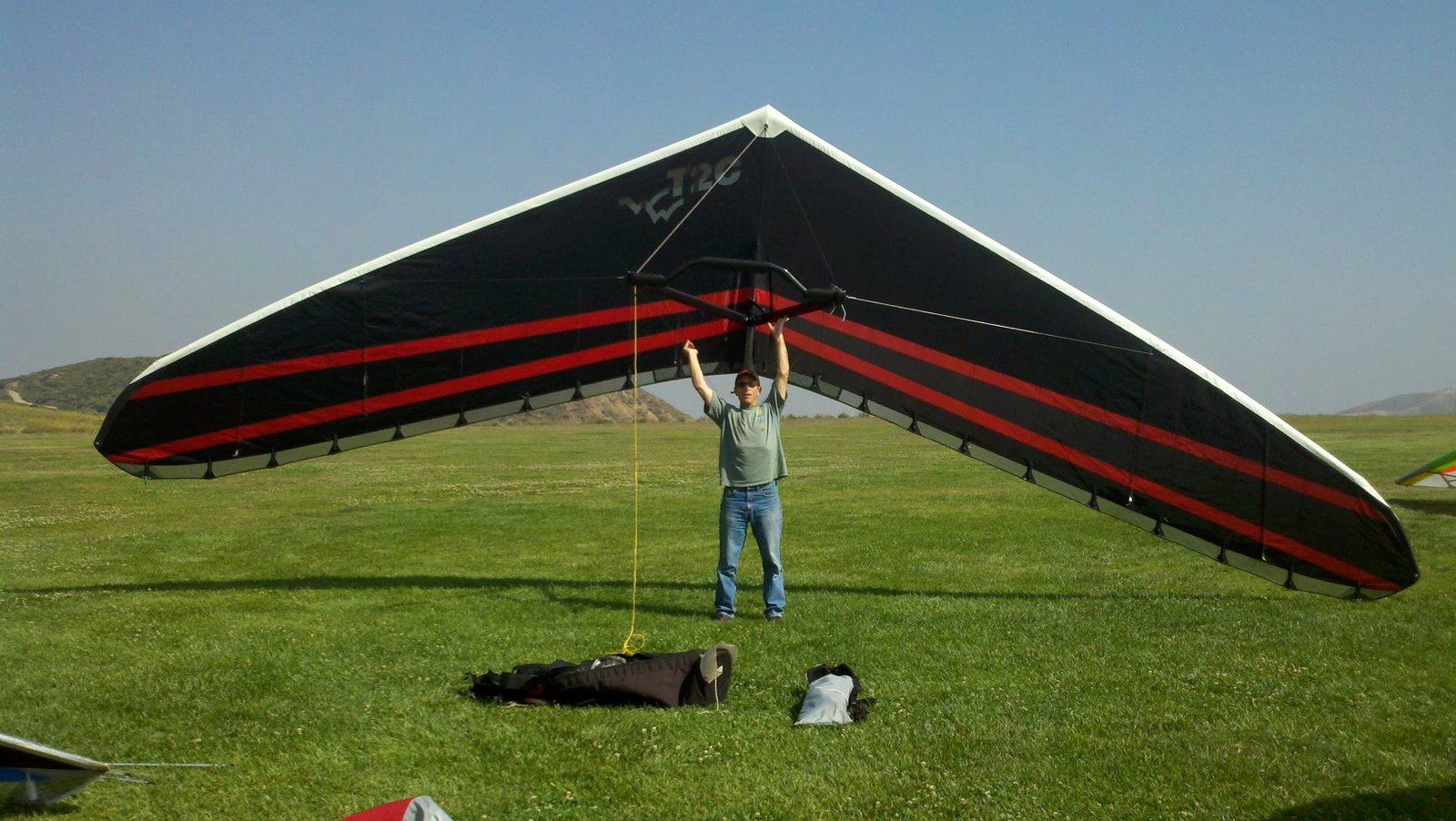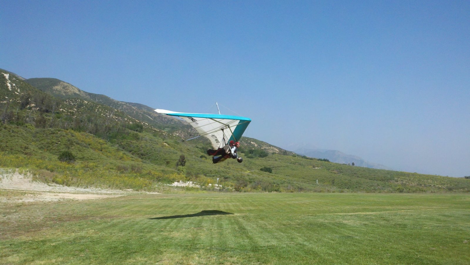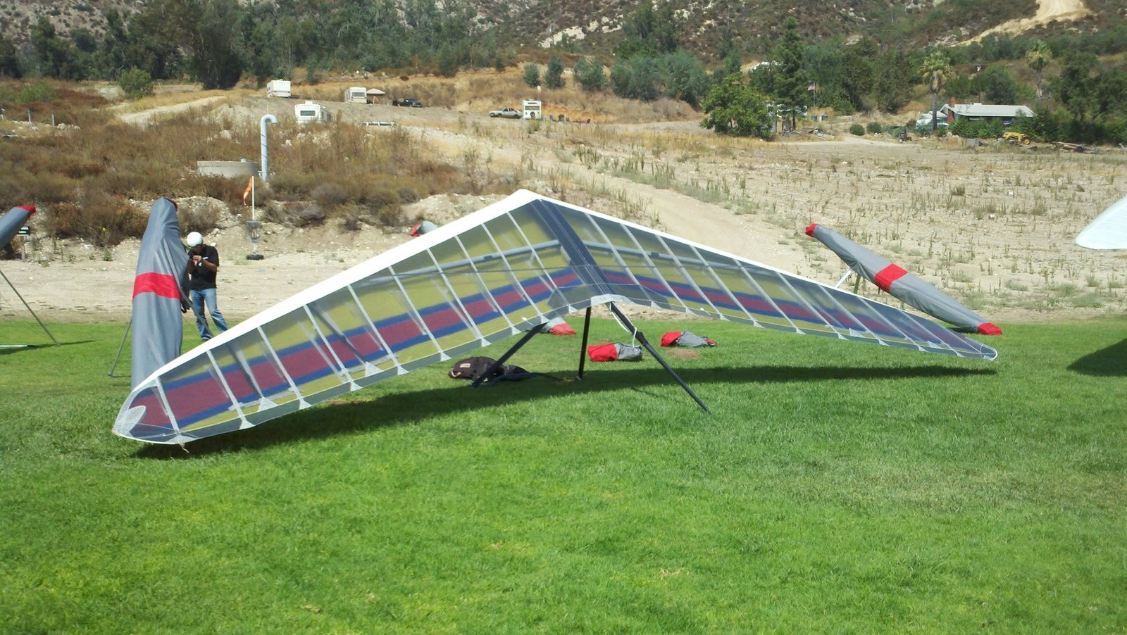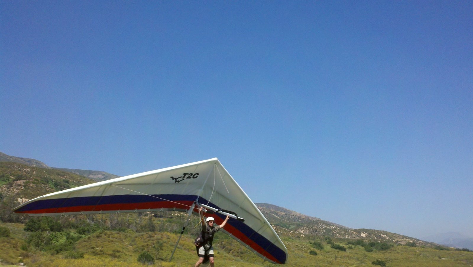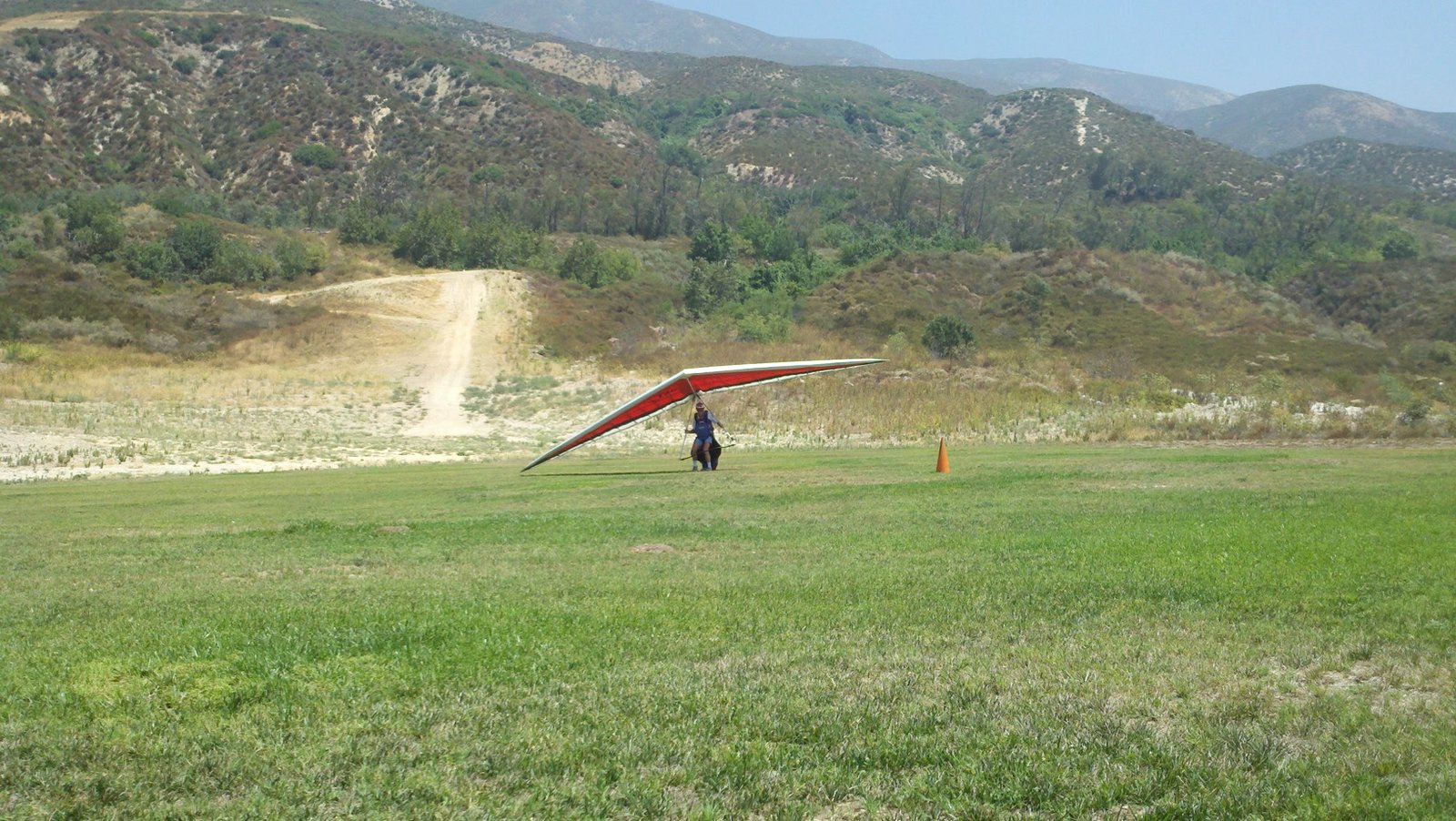 Clear and warm onshore day between Santa Ana episodes. Calm at the LZ and already a steady 5-10 SW at Regionals. Quite soarable. Nosecone wasn't attached so I flew straight to the LZ and landed. I had been ready to start my preflight and stopped to take a couple of pictures first, then re-started the preflight with the hang loop instead of at the nose area. Flew without attaching nosecone. |