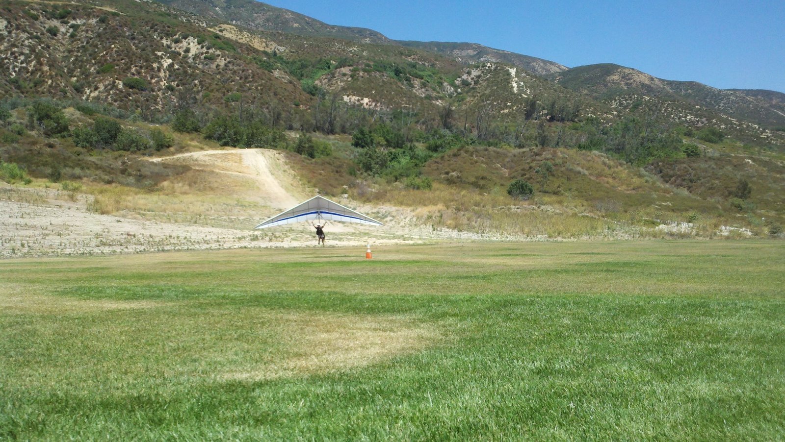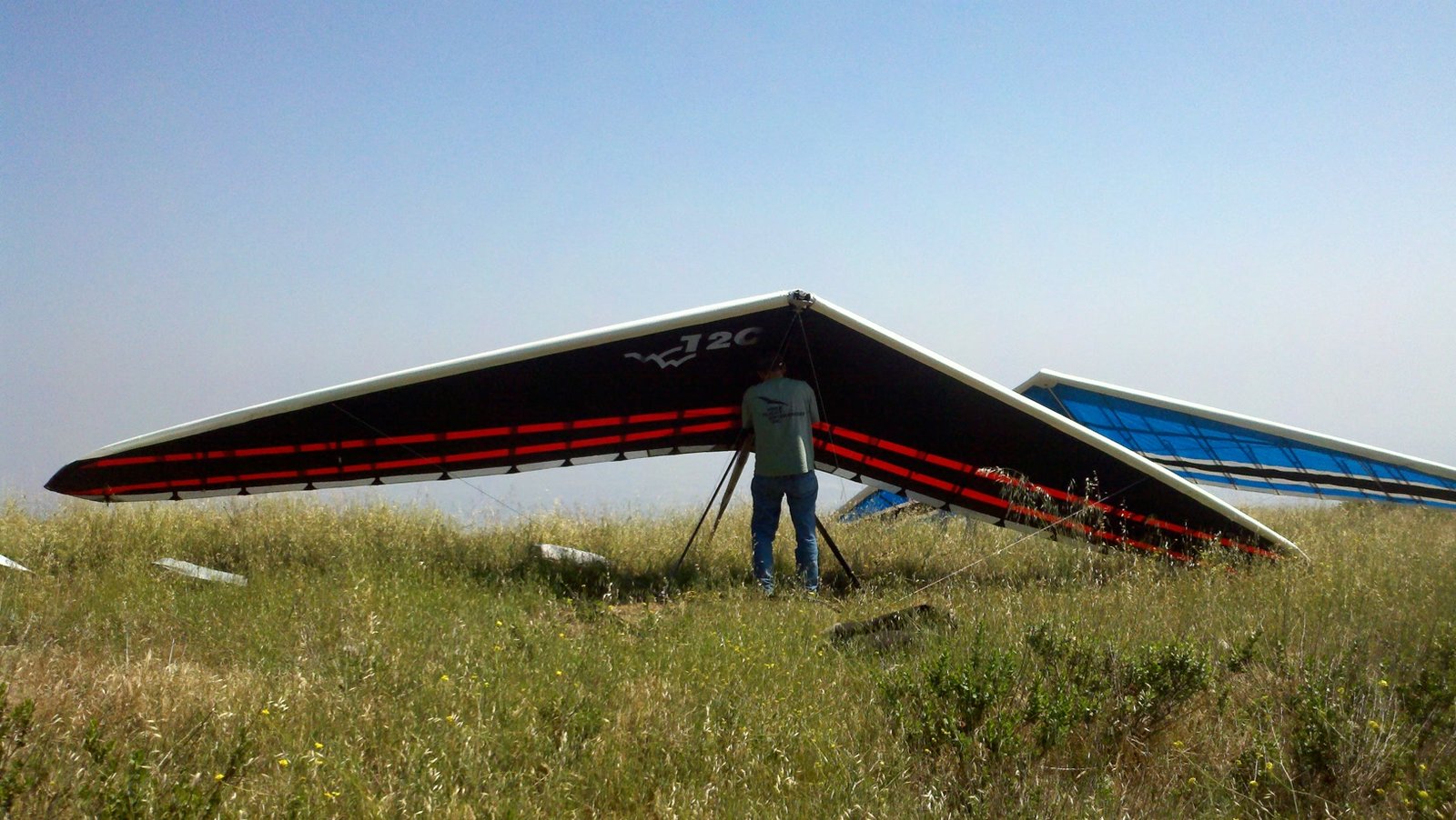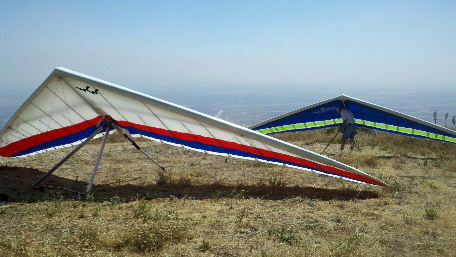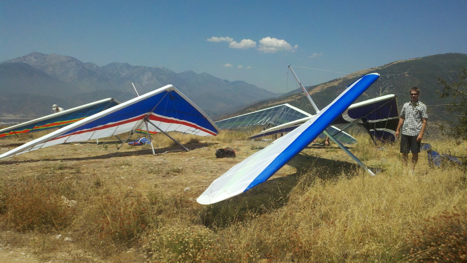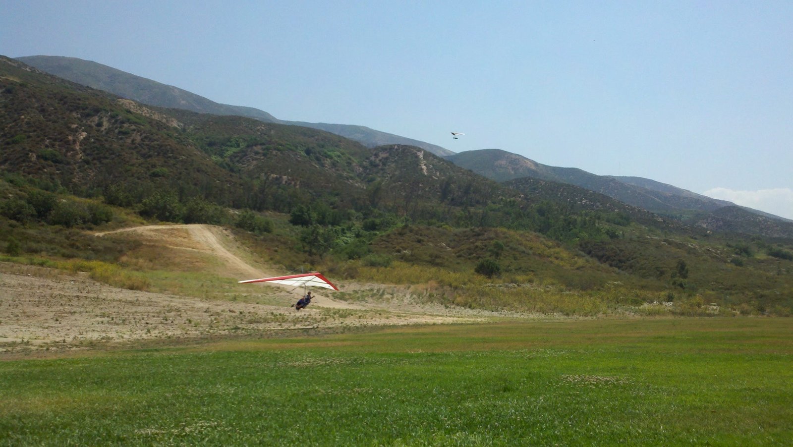 Clear and warm onshore day between Santa Ana episodes. Calm at the LZ and already a steady 5-10 SW at Regionals. Quite soarable. Nosecone wasn't attached so I flew straight to the LZ and landed. I had been ready to start my preflight and stopped to take a couple of pictures first, then re-started the preflight with the hang loop instead of at the nose area. Flew without attaching nosecone. |