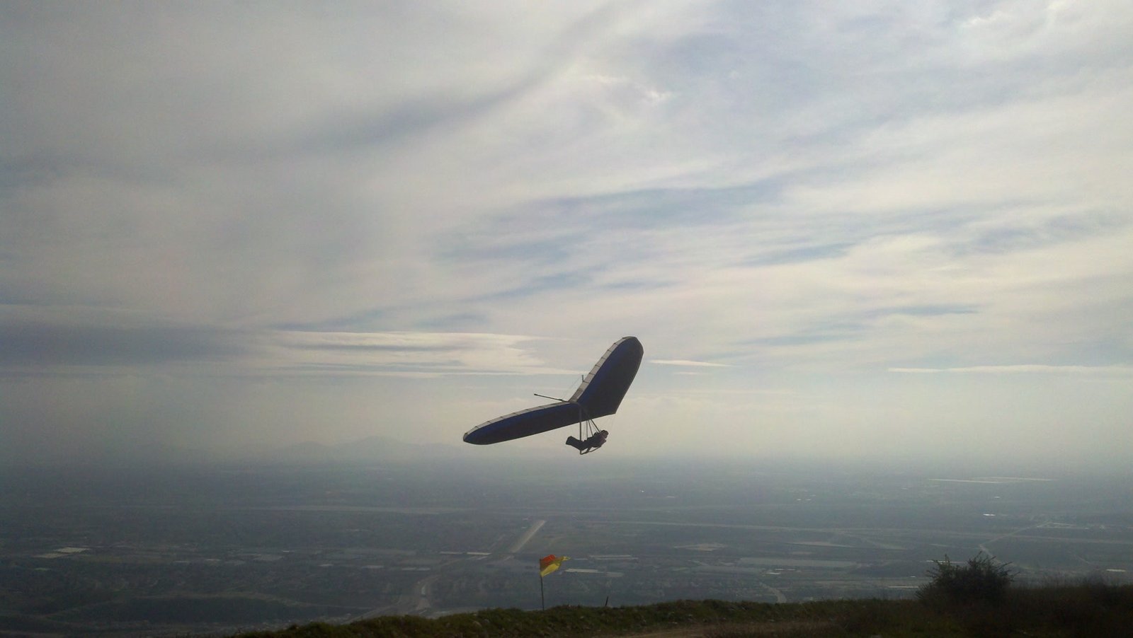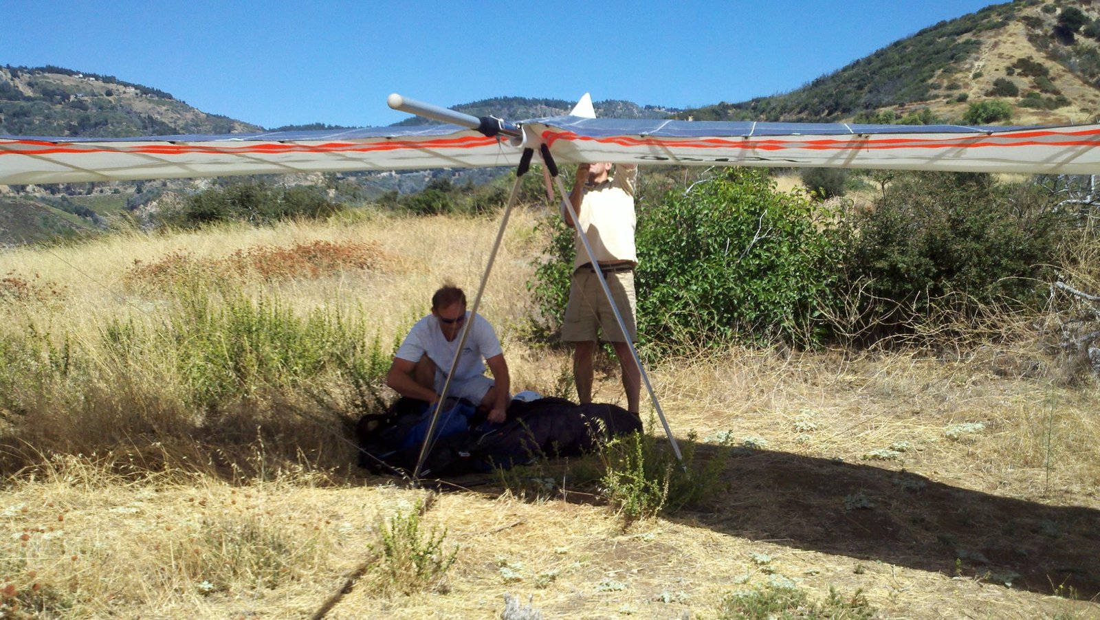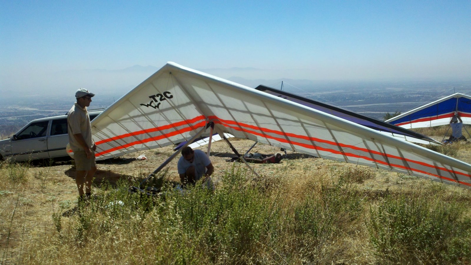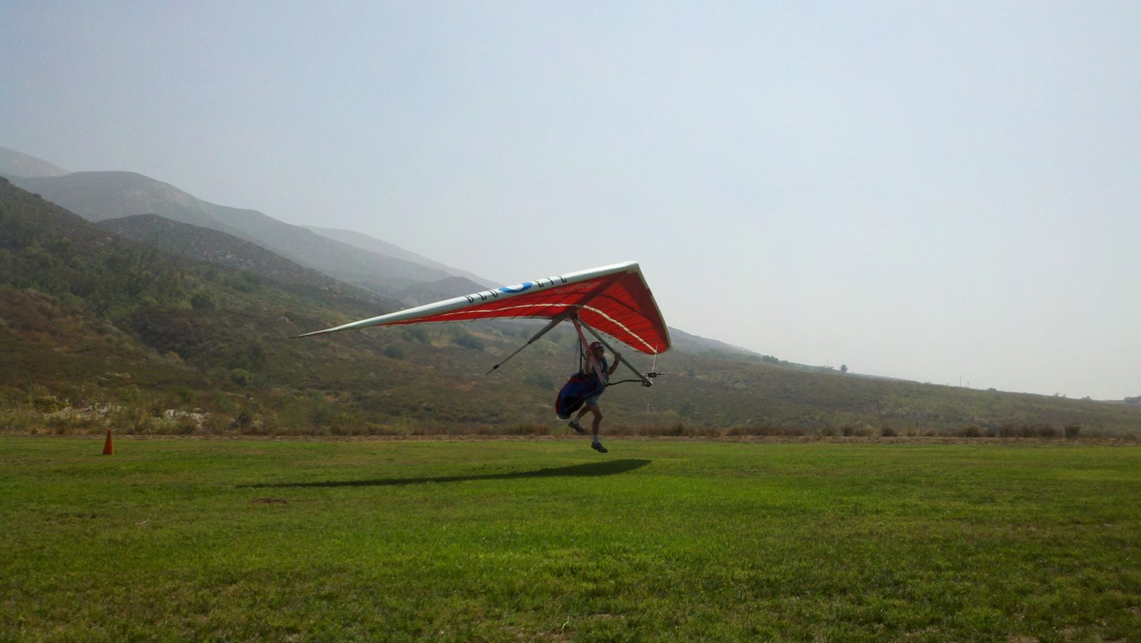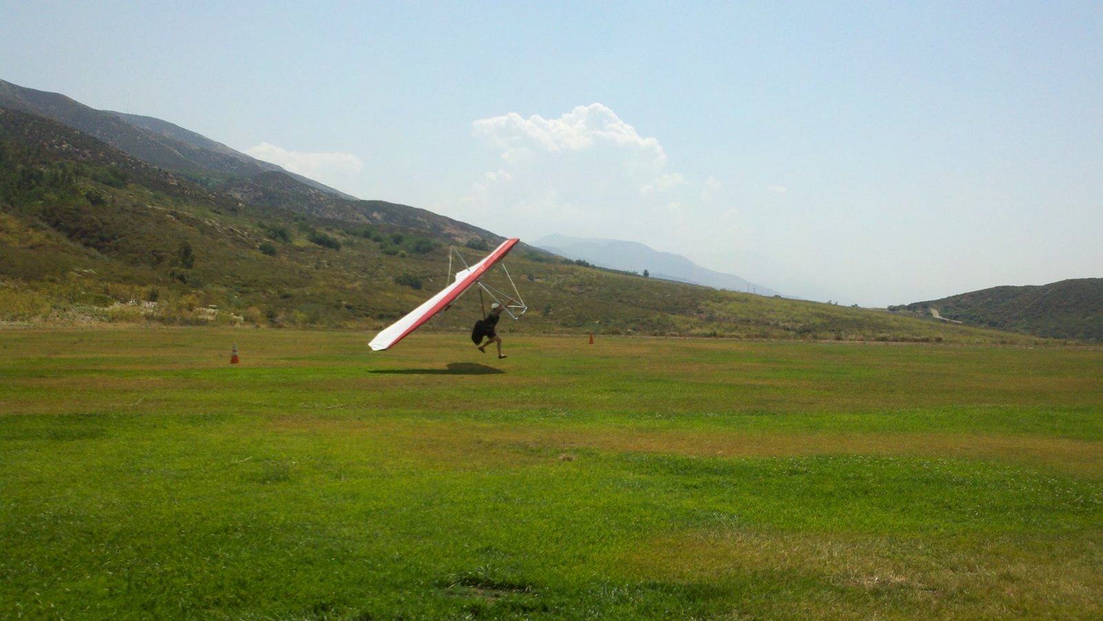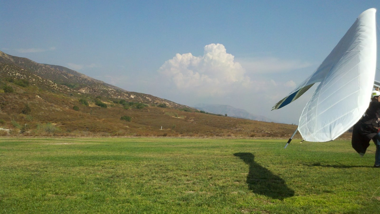 Clear and warm onshore day between Santa Ana episodes. Calm at the LZ and already a steady 5-10 SW at Regionals. Quite soarable. Nosecone wasn't attached so I flew straight to the LZ and landed. I had been ready to start my preflight and stopped to take a couple of pictures first, then re-started the preflight with the hang loop instead of at the nose area. Flew without attaching nosecone. |