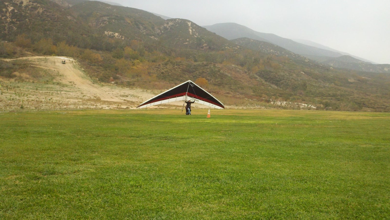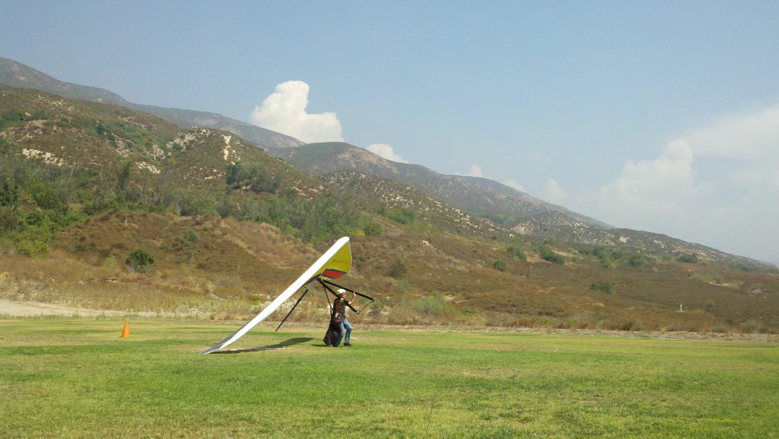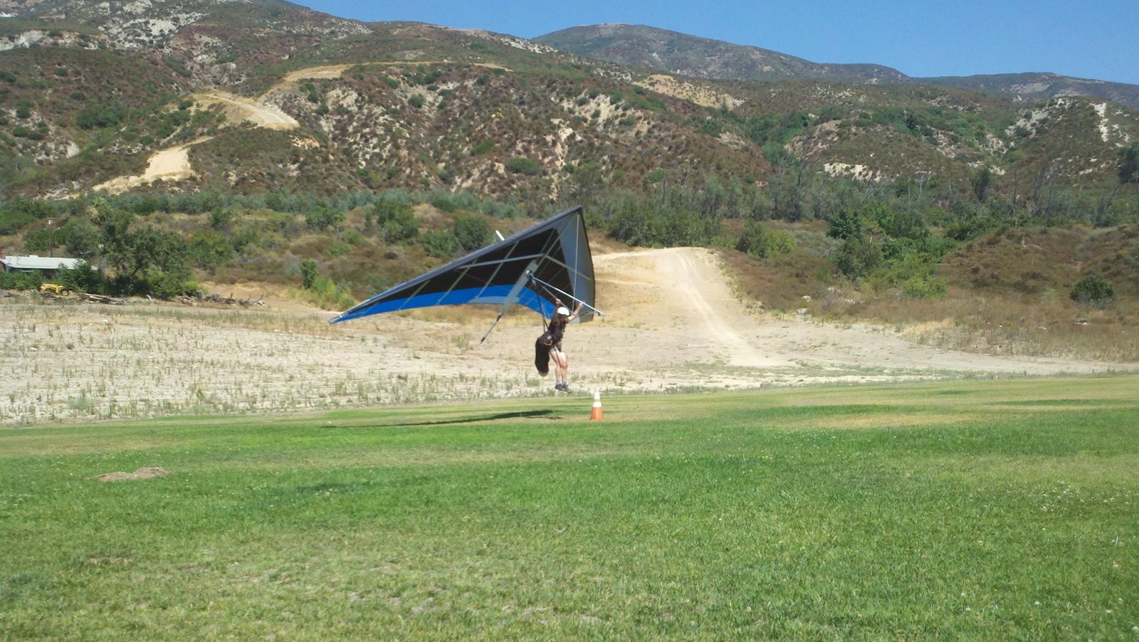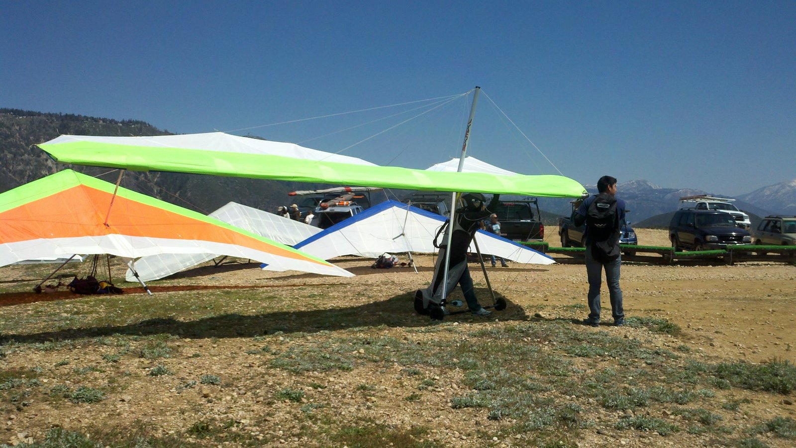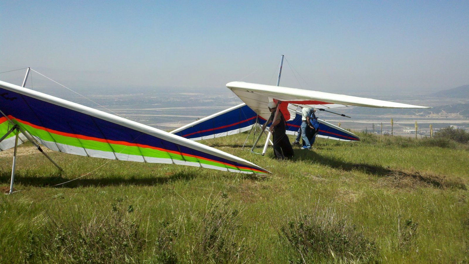 Clear and warm onshore day between Santa Ana episodes. Calm at the LZ and already a steady 5-10 SW at Regionals. Quite soarable. Nosecone wasn't attached so I flew straight to the LZ and landed. I had been ready to start my preflight and stopped to take a couple of pictures first, then re-started the preflight with the hang loop instead of at the nose area. Flew without attaching nosecone. |