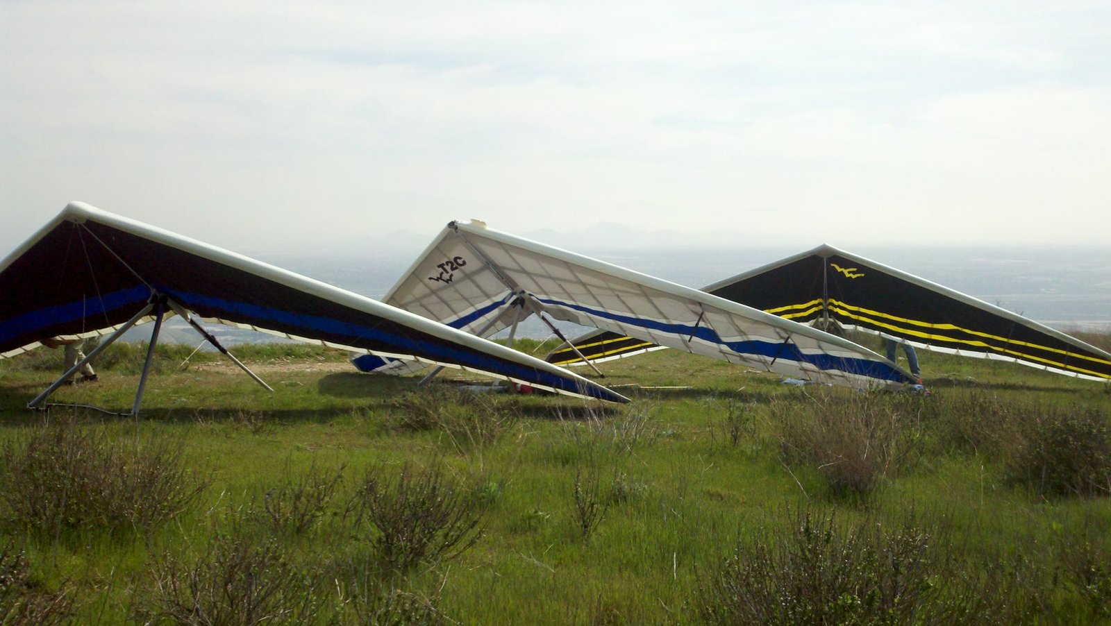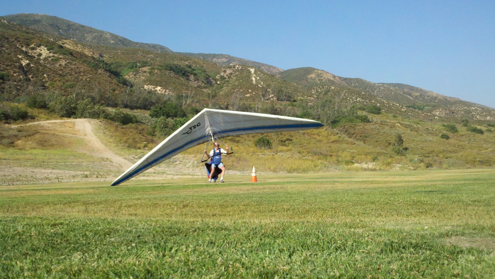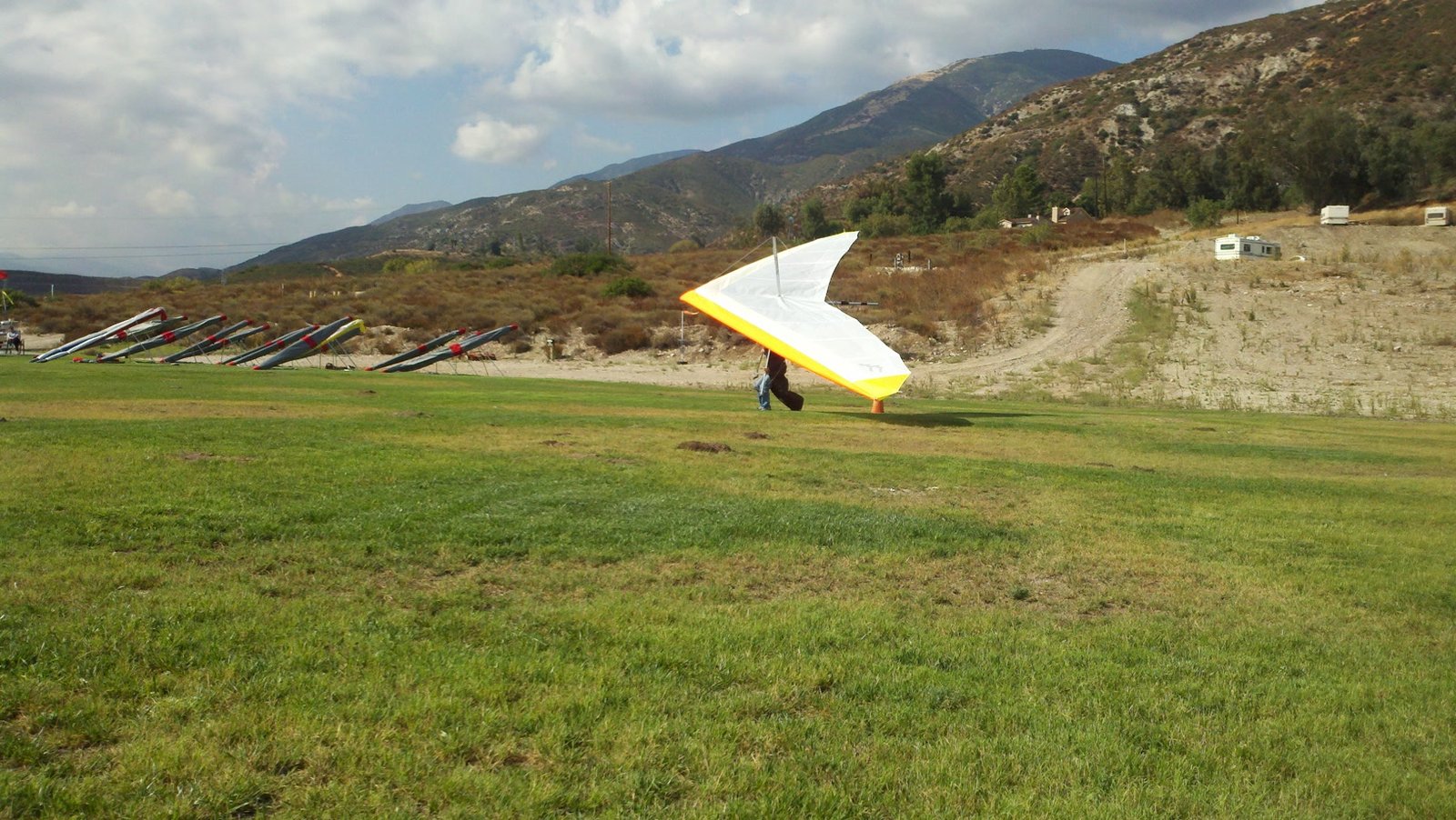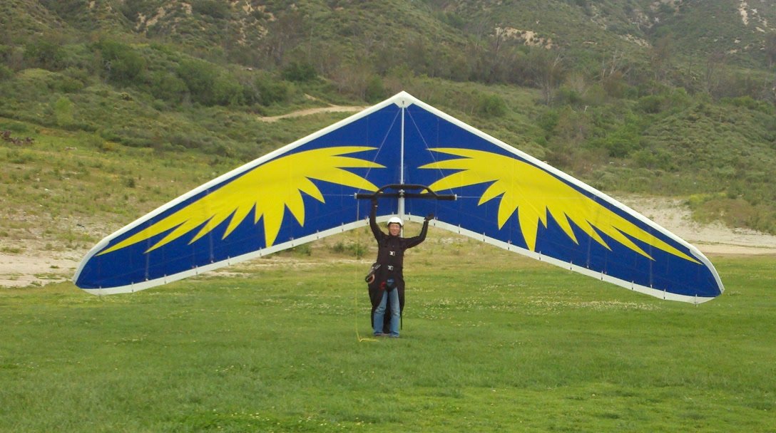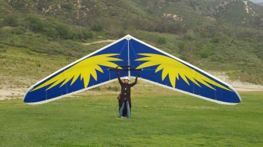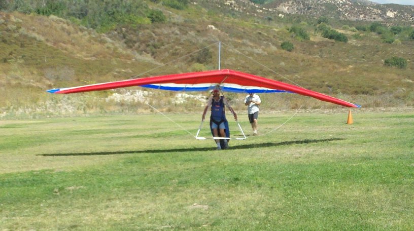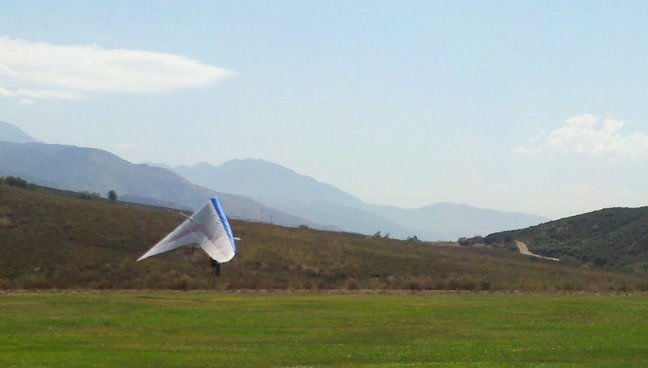 A fine onshore day in SoCal after an extended stretch of offshore winds, so we had a trailer-full of gliders to test. Some of the WW comp pilots happened to be in town, so we got a few more gliders flown per round than usual. Many local and visiting pilots also showed up and got some airtime, making it a fun day. A slightly extnded sledder from Regionals. Did a S final and as I went to flare I dropped just a little. My left foot was trailing and my toe caught on the ground so I was late getting my feet under me. Finished the flare in a joggign crouch and put the basetube on the ground. Good |