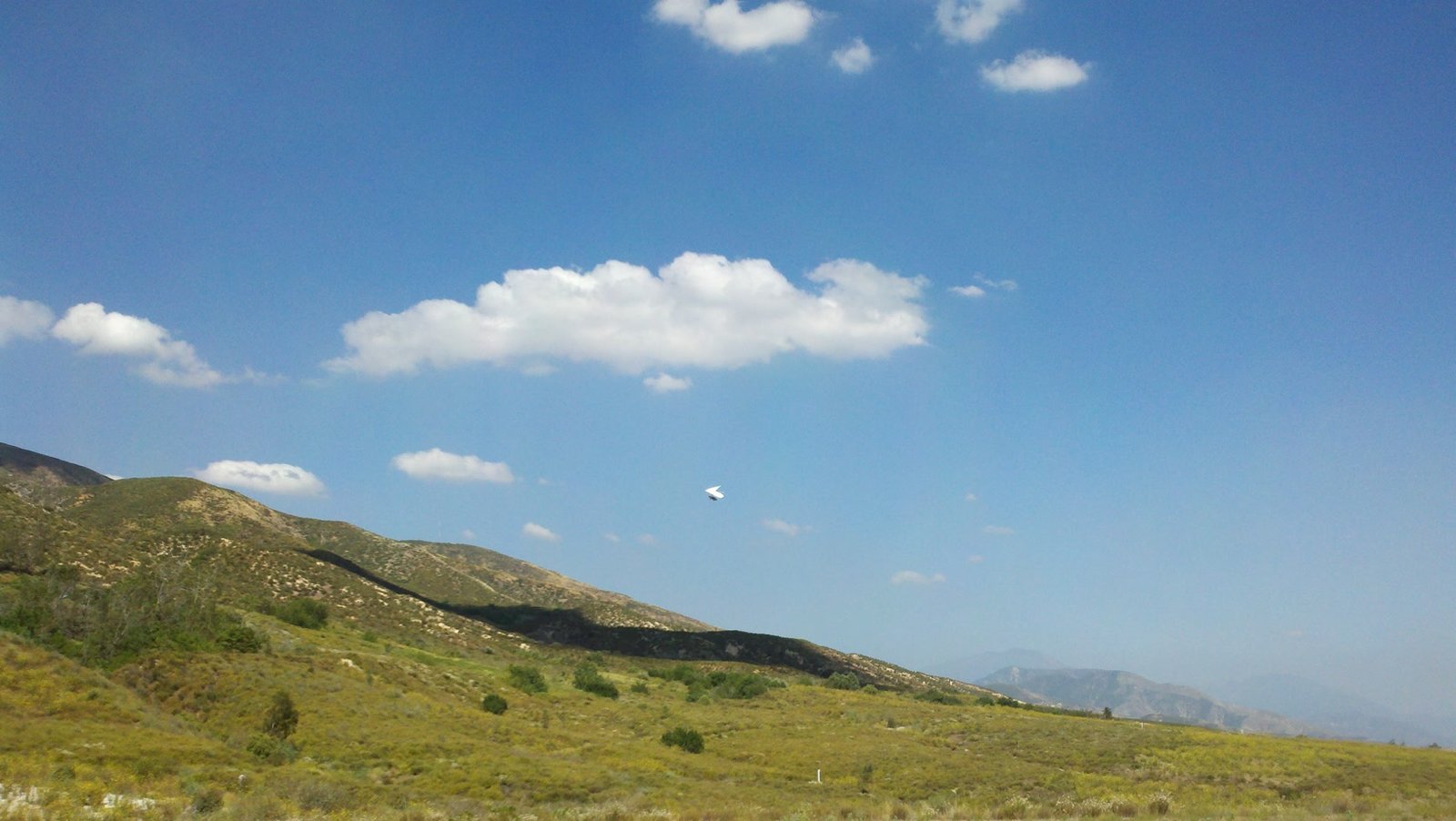 Great flying conditions today! The wind had been forecast to blow from the north, but it turned south in the wee hours. Launched from 5,000 feet (Crestline) and was perfectly comfortable in a t-shirt and light gloves. Got to 6,400 MSL, flew for an hour-ten, and landed when I wanted too. More, just like this, please! Light winds, steady. Well-formed, long-lived thermals. The climb from below Cloud Peak to 5,400 took a lot of circles and a long time, at ~100 PFM, but easy to track the thermal. Buzzed a group standing on the rocks at Crestline, then stuffed the bar and made a bee-line for the LZ. Cored sink and landed into SSW 5 MPH. |