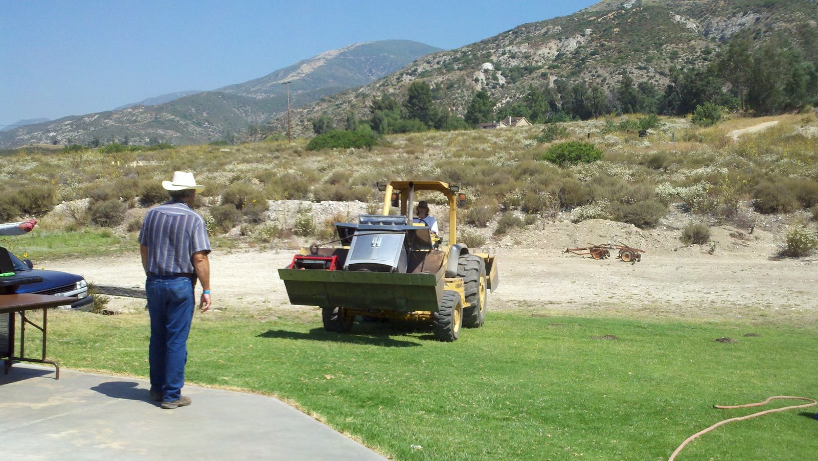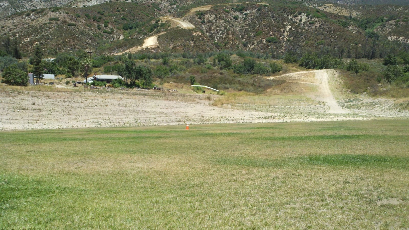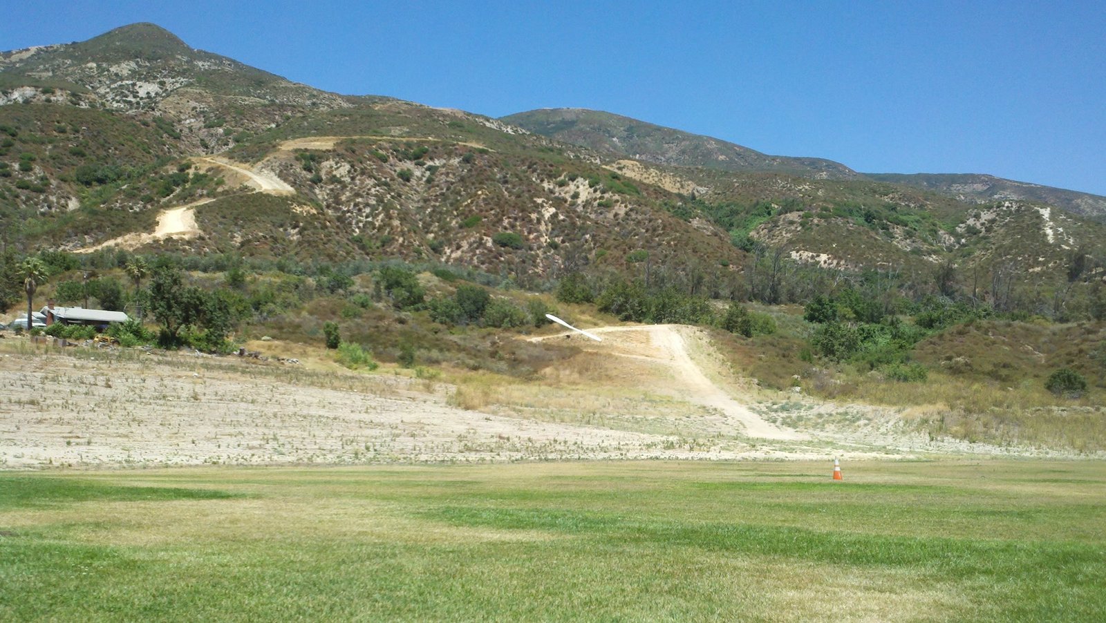 I climbed with a couple of ridge-soaring passes, then found the air was going up EVERYWHERE - no need to circle or anything. I kept looking up for cumulus formation, but there were just the high wispies. At 5k and south of Marshall I decided to practice flying 60 MPH some more (harder to keep on a line than full stuff) and headed out over the Cajon High football field (big circle in the middle). On the way I knew I was out of the lift band and when I slowed and turned for the LZ I saw 1,100 FPM DOWN on my wailing vario! I got all efficient and shtuff, with the distant LZ as the stationary spot ahead of me. When I got past the observatory construction site I was back in the lift band again and had a good SW breeze to land into. Great! Usual TT and PP. Replace bottom rear wires. Kinked near tang while packing. |