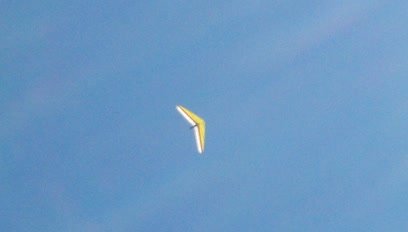 Light steady breeze at Regionals. Went right after launch and it took a couple of minutes to find a real core, which I worked slowly as it consolidated. Got to 4,800 above Regioanls. Went north a little to lose altitude and buzz the crowd still at launch. Ran into lift as I neared the ridge in my dive, so my 'buzz' was about 200' AGL! Kept the dive on out to the 750 and worked some small thermals. The flags were dead at the LZ so I worked steady puffs above the bluffs for about five minutes, waiting for an in cycle. Finally just dove on in and landed in zero wind, inside the PG circle. Good. Keel strap loose. |