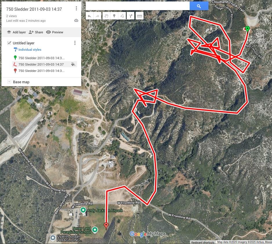 It had already started blowing north at Crestline, but when we got to Regionals we found steady 10-15 SW, which was nice. I could have just walked right off the road and launched, but I moved down the slope a few feet and assessed things frist. The gaggle was getting up in front of Cloud Peak. I went west from launch, thinking there might be some upslope from the north faces and a mini-convergence. There wasn't. Slightly sinky, in fact. Several hundred feet above the 750 I found a core that I circled up to 4,300 in pretty quickly, nearly straight up. I flew over to Marshall, waved and did a circle over the windsock, then back to Cloud. Meandered out over the LZ, sniffing for hints of north flow. It was still at the LZ. Did a high-groundspeed approach and put it on the basetube after a couple of steps. Might have had 1/2 MPH tail wind (thermal). My DroidX GPS track stopped at 3k feet near the 750. I pressed "stop recording after I landed, so it should have still been in recording mode. Glitch, I guess. We went to the 750 for a round of Falcon 3 Tandems. Peter launched, then Steve walked over to launch. I had my harness on. It got strong east all of a sudden - I considered the east launch. Then the wind built and clocked 270 degrees to gusty NNE . I had to turn my glider twice and was reluctant to leave it. Steve was having trouble keeping his glider's nose down enough while still hoooked in; a relative lull allowed him to unclip and grab the nose. We called Bill to come pick us up. There was a short in cycle and I was tempted to launch quickly, but we all thought it might be too dicey in the air if another north gust cycle came through. One came shortly and we just kept folding the gliders. Very nice! |