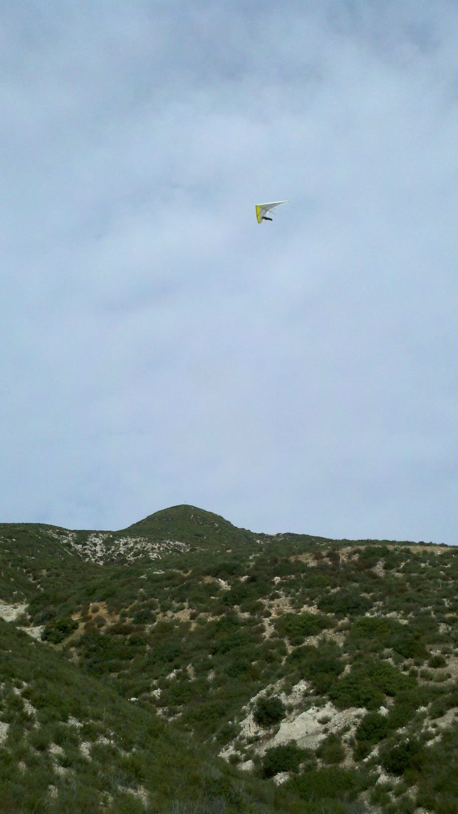 Flight from Crestline to AJX on New Years Day. First time using the GPS tracking app ('My Tracks') on the DroidX. Very light conditions with high clouds moving in, rain expected for the next few days. Mostly zero wind at Crestline. I launched into a little cycle and found a weak but long-lasting thermal on the spine to the west. Got to 5,450 with it. Sank from BB to RGNLS, then scratched west of the 750 for another extended period. Good SSW landing in 0-2. The track was immediately viewable on the DroidX, with an elevation side-view and times and speeds. The track was very smooth - nice circles. Recording interval defaulted to max. Battery lost about 50% of charge for the 1/2 hour the GPS was on. Will record at longer intervals in the future. Emailed myself the kml right from the LZ. Sent pix to Facebook too, took video and some panorama shots. I'm lovin' this gizmo! I had pegged the flight at 25 minutes by glancing at my watch. The track said 26:45 'Moving Time', which counted walking to launch and to the breakdown area. Pretty cool! Other numbers: Max Speed: 37.06, Avg. Moving Speed: 23.96 mph, Max Elev: 5,526', Min Elev: 1,687', Elev Gain: 624'. Regular F3 with reduced anhedral - some instructors had asked for a less responsive version for brand new pilots. I mostly noticed that fine roll adjustments while thermalling took a little more effort than I expected with a Falcon. |