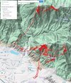 Clear onshore day, cloudy with a couple of token scattered showers the day before. Soraing Predictor reportedly had forecast heights of 10k but the banner clouds at Baldy and Gorgonio showed that it was blowing north at about 8k MSL; Clouds were forming at about 7k just in front of Crestline etc. to confirm the upper north flow. Comfortable in short sleeves at Marshall. People were launching and getting a few hundred above Marshall, so I launched at 13:35. Got up a few hundred right away, then threw that altitude away and was a little below Marshall, thinking I'd blown it. A weak core on the spine slowly got better and by the time I was at 4,300 there was a crowd circling below me. At 5,200 I headed north along the spine to the highway and found nothing, turning back south after going 3/4 of the way to the 18. Just north of the last big bump I found a little core at 5k and stuck with it, eventually getting to 5,500. I headed for Crestline in 300 FPM sink, wary of the possibility it was blowing down at Crestline. Climbed to 5,400 on the face, then took a core straight up to 6,100. No ridge lift as I headed for Billboard and the shadows of the short-lived clouds were heading south. Got back up to 5,700 at Billboard and headed for Pine through big sink. Got there above the 4k launch at about 4,800 and didn't find anything until the lowest road crossing the main spine. Only got from 4,100 to 4,400 there a couple of times, so went for the Afterbay hills, again through major sink. Kept eyeing my glide to the LZ. Big sink crossing the mouth of Devil Canyon, getting to 1k above the LZ (2,700) before reaching the bluffs. I had been trying to find that balance between flying out of sink quickly and flying slow to minimize sink ever since I had left Pine. I'd picked an alternate LZ in case I'd hit really bad sink. No lift along the first set of bluffs, except one bump I did one circle in. Decided to go for the Big O bluffs while I still could; get up from there. Nothing above the Big O launches and the LZ was showing steady east wind. Over the Ranch at 2,200 MSL I circled in a little lift but thought that if I drifted with it and didn't get up then I'd have fewer options for landing in switchy conditions, so I dove it hard in a big round right-hand approach into the dying east cycle. I barely made the grass at the north end near the parking lot, but did miss the toddler who was toddling across the gap. Landed at 14:25 trotting and pushing out with a little bank. There was a blade wing already down and a few more pilots soon joined us while the flags showed flow from about six of the eight compass points. Most agreed that it was totally working above Cloud and Marshall but everywhere else it was either good lift or big sink. We spotted a couple of HGs out over the flats at 6k or more, but most were gaggled over Cloud and Marshall. A rigid wing reportedly went to Keller Peak and back. Lots of pilots out for the day and most paused and slowly said "Yes, I had a good flight" when asked. |