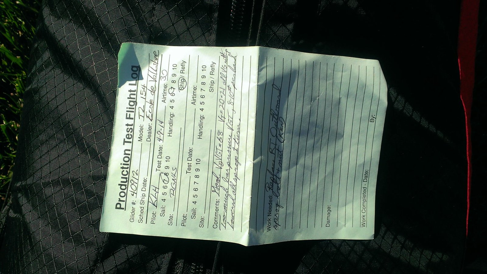 Good. Trimmed 22, moved hang point back 1/2 inch. Another sink and then one-thermal climb to 4,300; not as quick. Good SW landing. Replace haulback keeper string. |