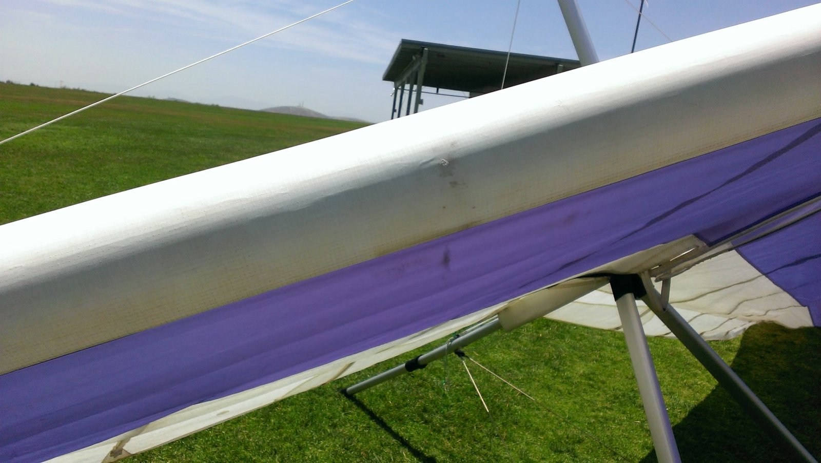 Still very little wind, clouds on Crestline. Launched in a gust 3-5. Pure sledder, no wind in LZ. Flared running, put it down hard with noise up. Vt=18, almost no change over VG range. VtVGT=21. Considered moving hang pillar forward, talked to Steve and decided not to. Litestream downtubes and round basetube. Compression dimple outside middle of left downtube. |