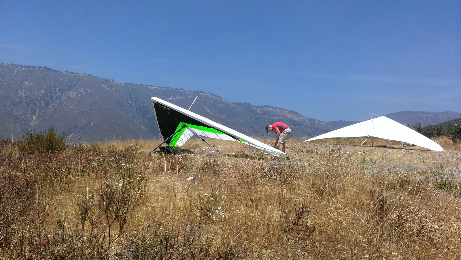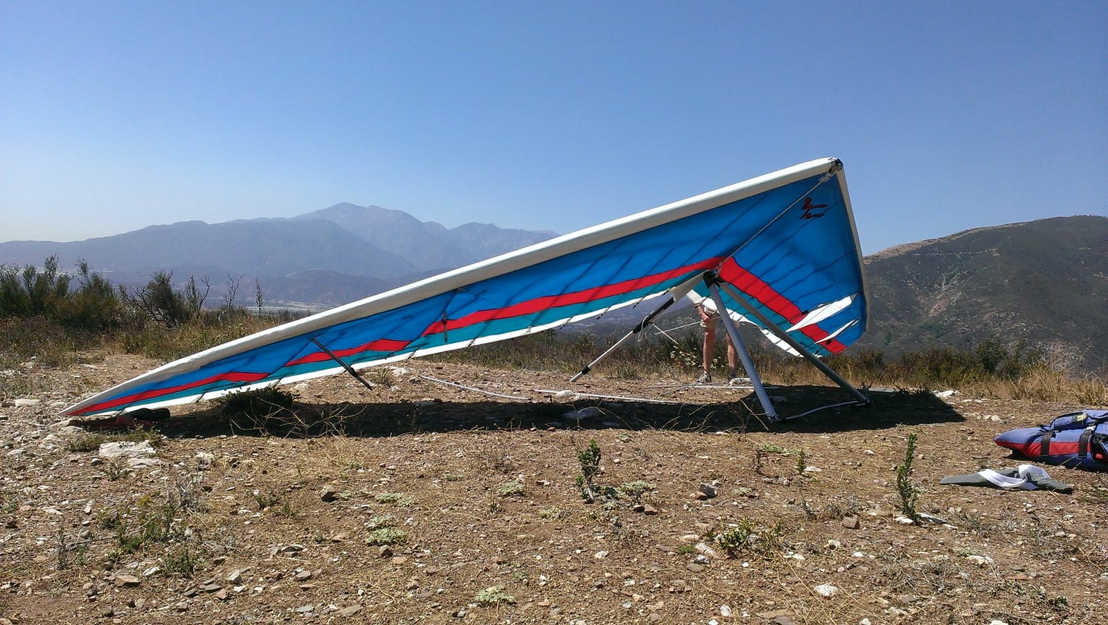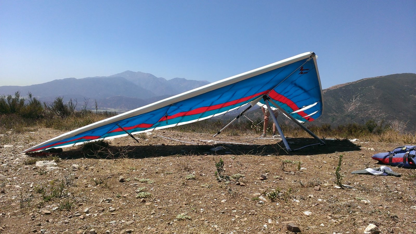 Again just barely too windy at Crestline. Good launch, worked thermal at Cloud Peak several times. Victor had a good feel for thermalling. He wanted to land after 15 minutes or so. Could have stayed up easily. Good landing. Kept my harness zipped a bit more and string didn't tangle with rear wheel. |
