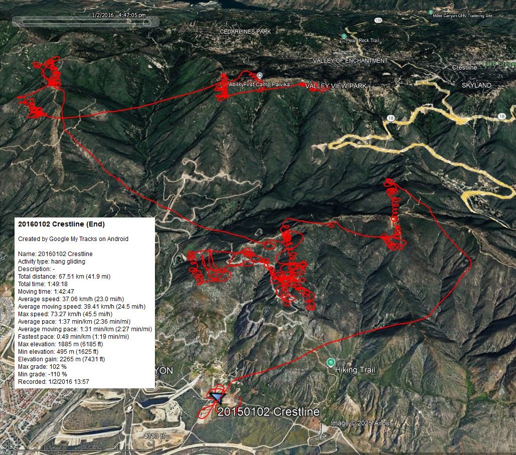 Sweet handling, light PP. I launched Crestline at 2 PM with a Sport 2 155. Easy to ridge soar. Got 7k at Billboard, was below the top of Pine for a little while. Got 6.5k and headed to Sugarpine but turned tail in sink. Up again at Pine to 7k. Headed for Sugarpine again but saw a hang glider below it as I was about 2/3 the way there. Slowed and watched and found 200 FPM up. The other glider started climbing well from out front and our thermals merged. Saw that It was Kory on the Freedom and we climbed together to about 8k. I went further west to that big rock-chimney area, climbing in a small convergence as I flew straight. Turned left and found turbulence then sink. Was ready to go back to Pine anyway and I saw 600-900 FPM down at times; got there at 5,400 or so. Caught a core that gave 400 FPM up and rode it to 7.5k. The odd thing was that it drifted to the apex of Devils Canyon - I looked east to see Valley of Enchantment and Lake Gregory along the straight east line. Not a perspective I've had many times. Approached Crestline launch (high) from the NW, intending to go to Marshall. A weak thermal over the Hwy. conned me into going to the interchange. Got 6.6k there but turb/sink all around so I flew straight to Marshall then over Cajon H.S. then to AJX for a good landing into WSW 12 to finish a 1.5 hour flight. |