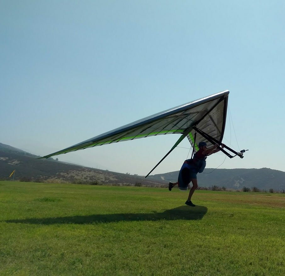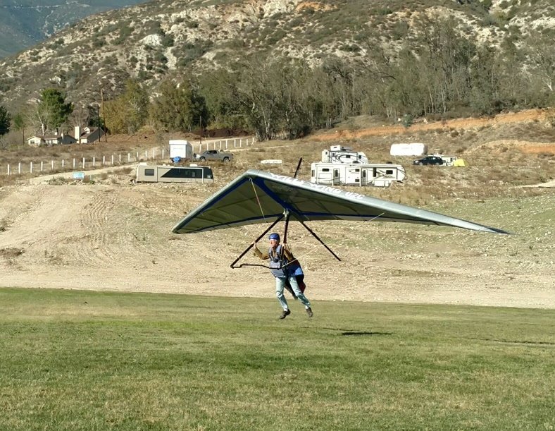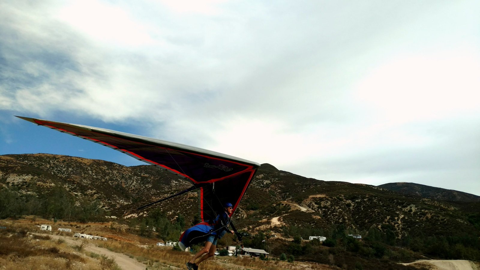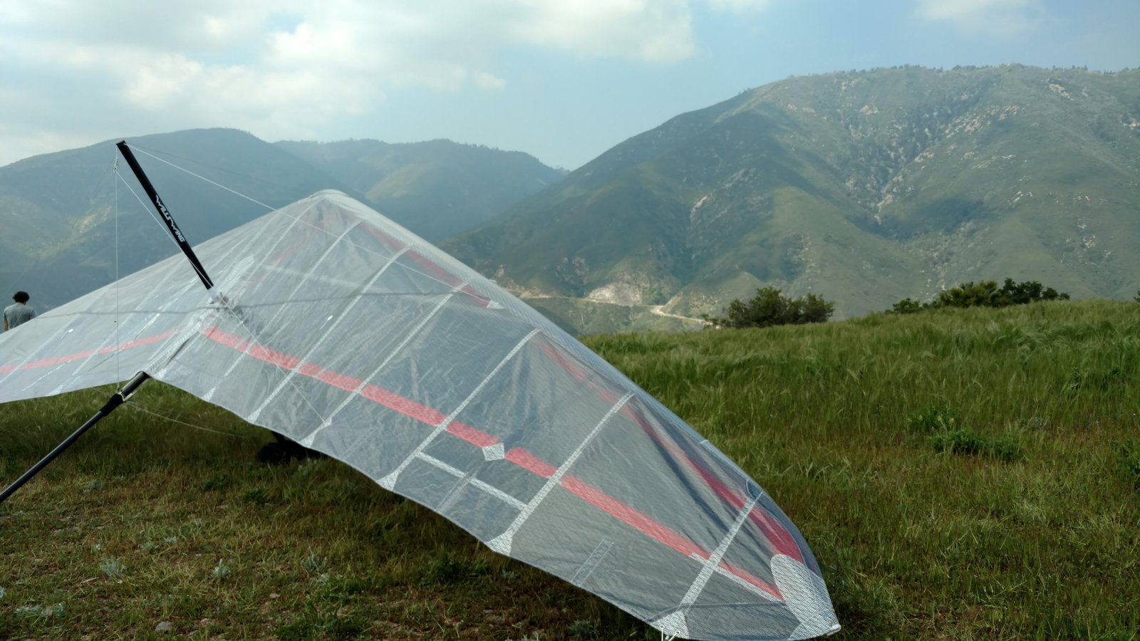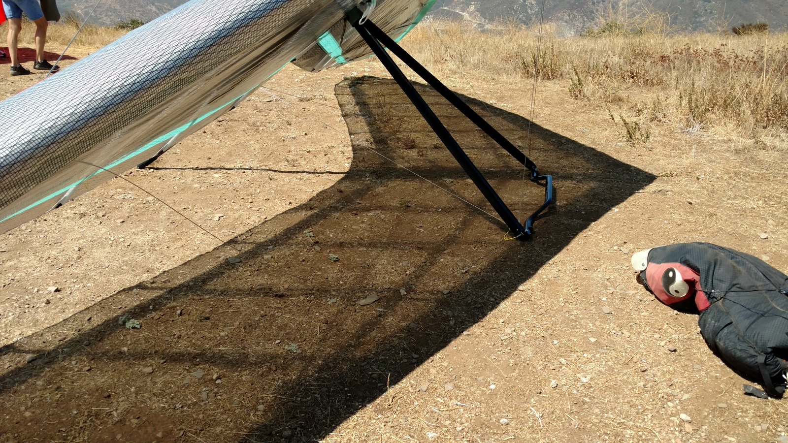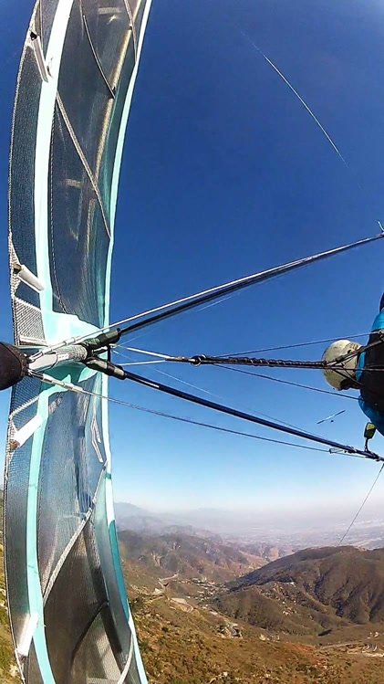 Solid 20 at Crestline, twenty degrees cooler than normal top and bottom. Good launch, just a few steps. A number of ridge soaring passes then thermals at Billboard. Got to 5,700 without going north of the ridge. Dave steered across to Regionals, drifting left a lot but getting the hang of it. Thermals at Cloud with me just helping a little. Better directional control taking a line to Marshall. Bumpy air. Below 3k thermals very sparse and narrow. I'd hoped for a nice climb from low. Good SW in the LZ. Rolled to just a couple of feet past the HG cone, knocking it over with my left side wire. GoPro on Xbar was on stills mode, not even timer. Knew it at launch but chose not to unhook and fix it. College kid, Harvey Mudd. Friend Rikki Hang 2 from Lookout. |