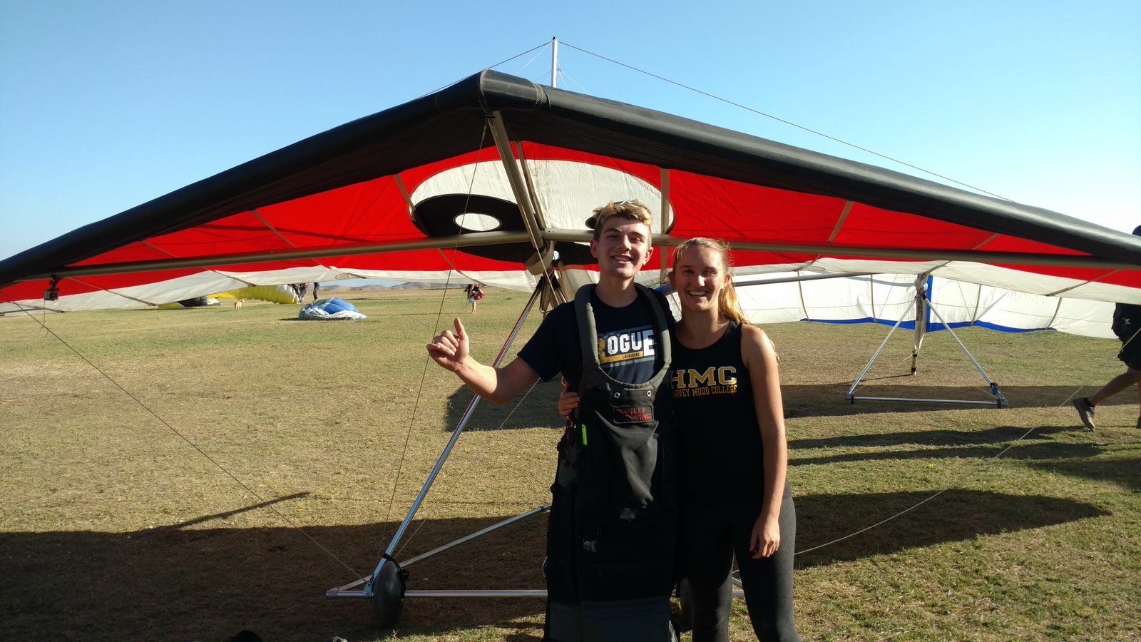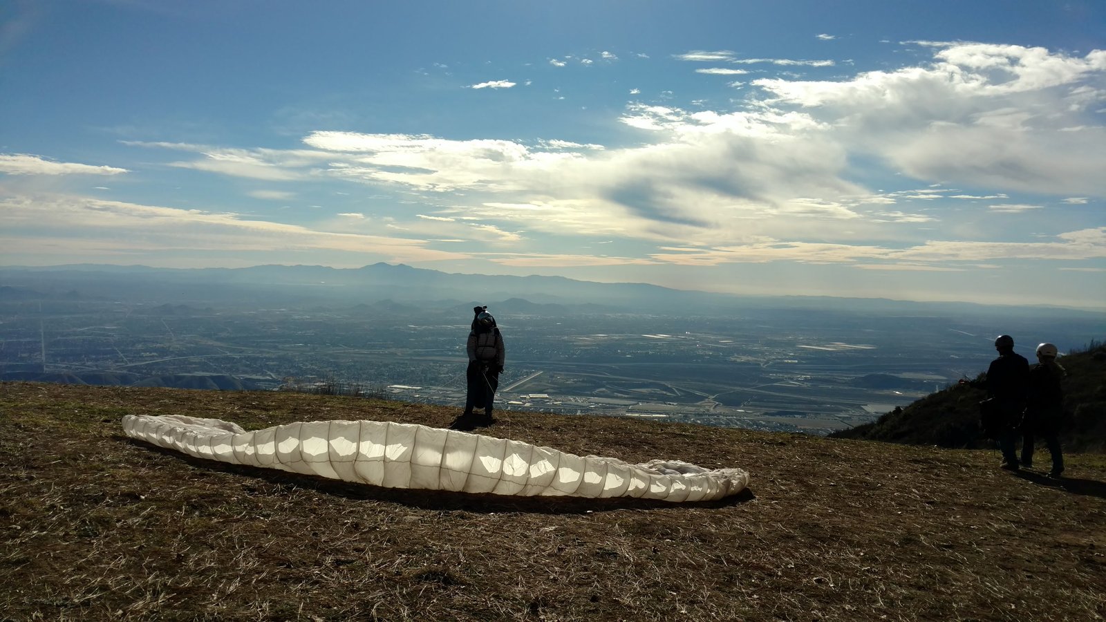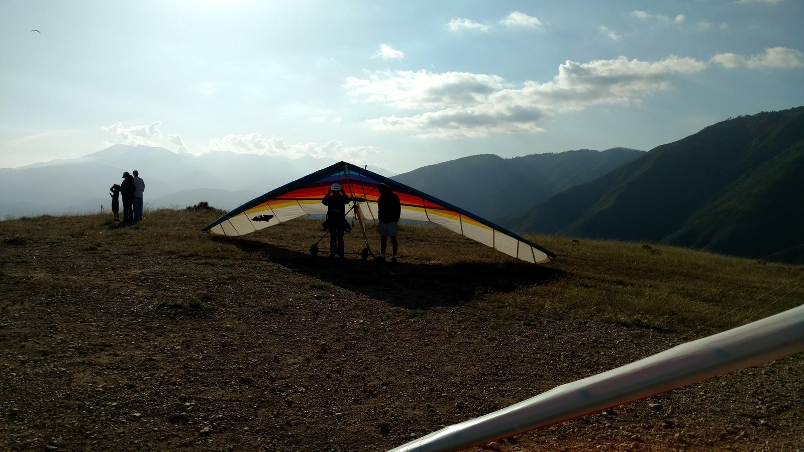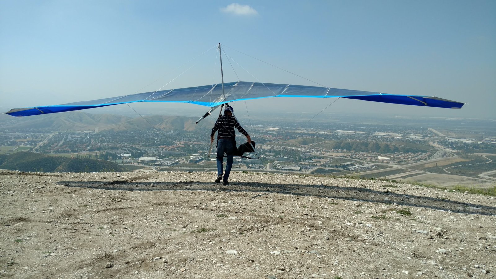 Solid 20 at Crestline, twenty degrees cooler than normal top and bottom. Good launch, just a few steps. A number of ridge soaring passes then thermals at Billboard. Got to 5,700 without going north of the ridge. Dave steered across to Regionals, drifting left a lot but getting the hang of it. Thermals at Cloud with me just helping a little. Better directional control taking a line to Marshall. Bumpy air. Below 3k thermals very sparse and narrow. I'd hoped for a nice climb from low. Good SW in the LZ. Rolled to just a couple of feet past the HG cone, knocking it over with my left side wire. GoPro on Xbar was on stills mode, not even timer. Knew it at launch but chose not to unhook and fix it. College kid, Harvey Mudd. Friend Rikki Hang 2 from Lookout. |