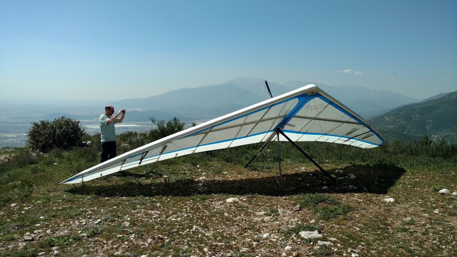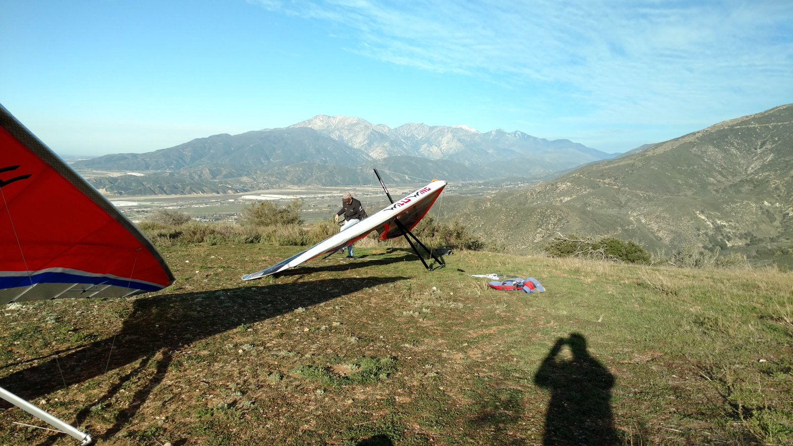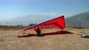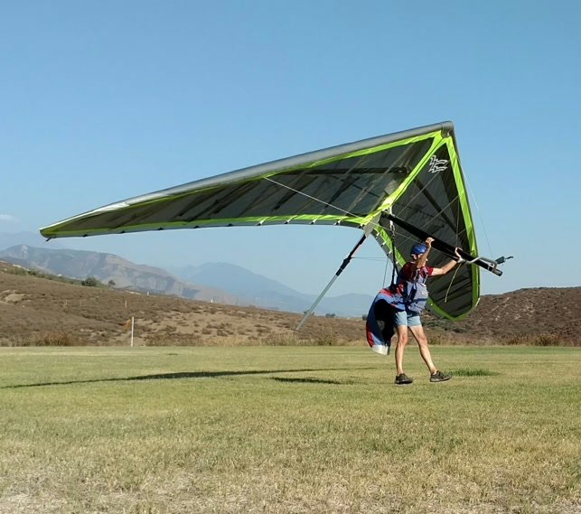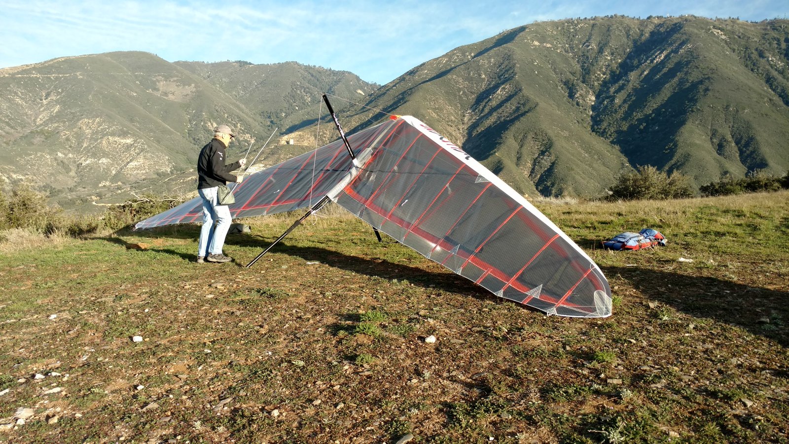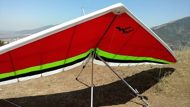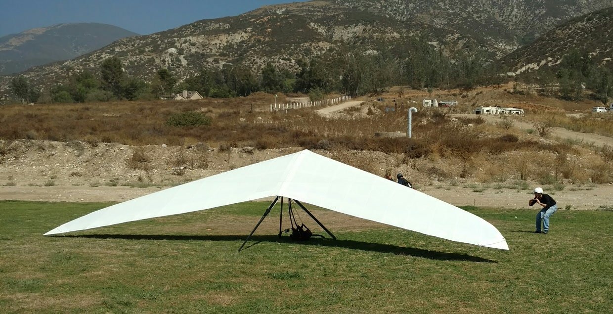Good. Twisted left tip 1 notch for a very slight right turn. Nice handling overall. Warm post-Santa-Ana day promising good altitudes. Bumpy at ridge level and lift was on and off. Got above Billboard to 6k+ and put my right glove on then sank. Ended up flying for about 1/2 hour with one glove; left hand/arm got a little tired from gripping harder. Got 5.5k from Regionals and went back to Crestline, arriving 5,100. Had to save it in the bowl in front of launch. Billboard still not great and thought about landing (40 minutes) but got a great thermal above the water tank to 6k. Put both gloves on. Went to Pine and climbed to 8k next to a racy PG. We went west toward Sugarpine; felt like a headwind. Still not beaming up and had sink alarm over the peak so I went back to Pine then Regionals. Did some speed runs to get low but didn't sink much. Wingovers near the 750 (Dusty, Gene, Nate waiting to launch) then it to the LZ. Saw zero wind and found lift SW of the Ranch so I was able to wait for wind. Good SSW 7 to land into. Got lifted near the cone, didn't go to basetube so I went s good way past. Nice one-stepper photographed by Dave Aldrich. Many had gone east with big hopes but came back relatively early; some saw 9k. Owen went to San Gorgonio and back. |
