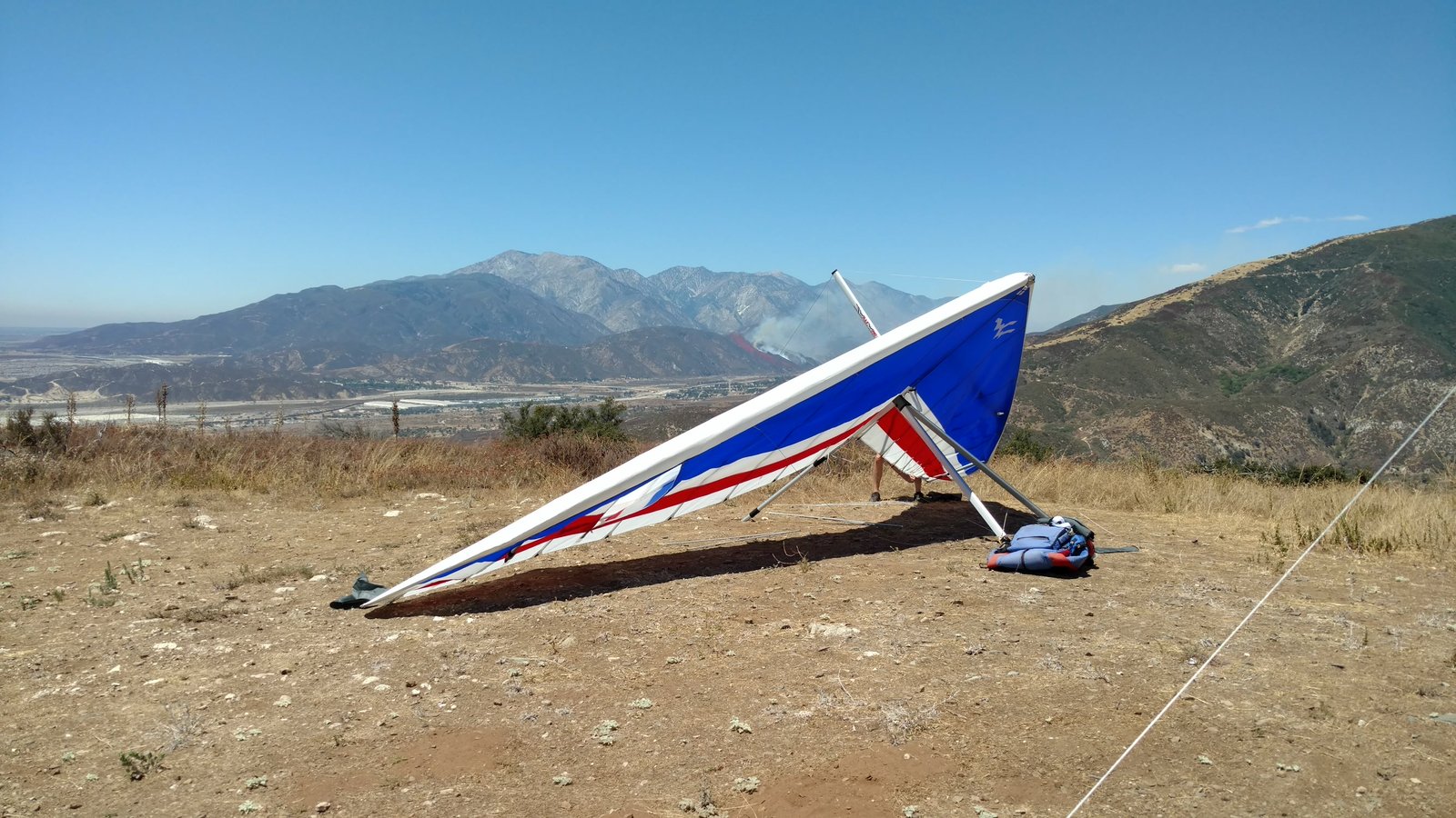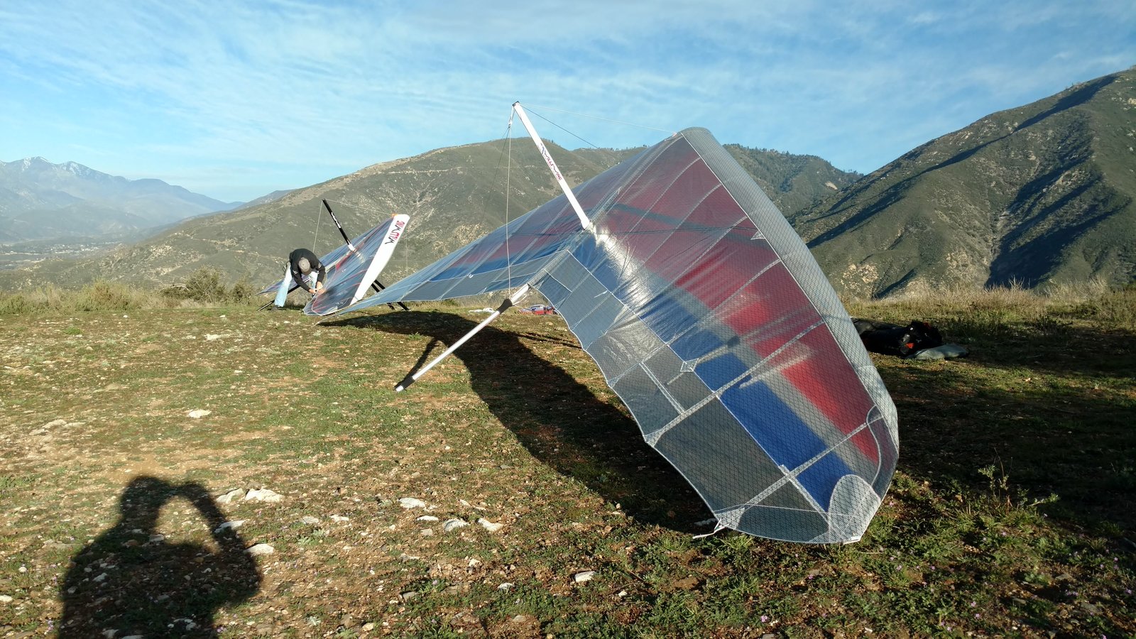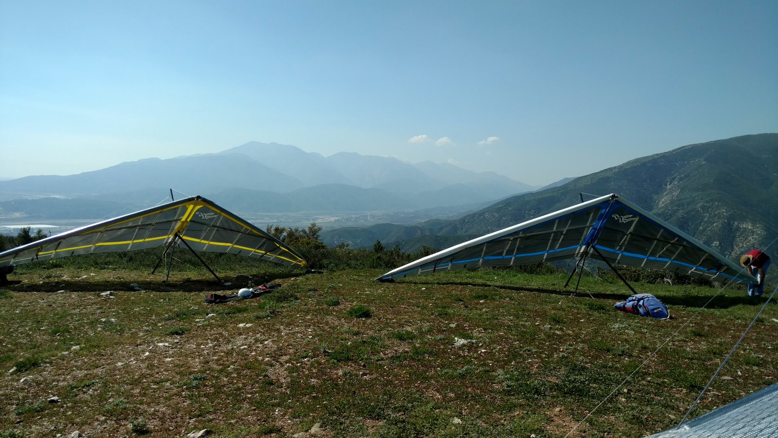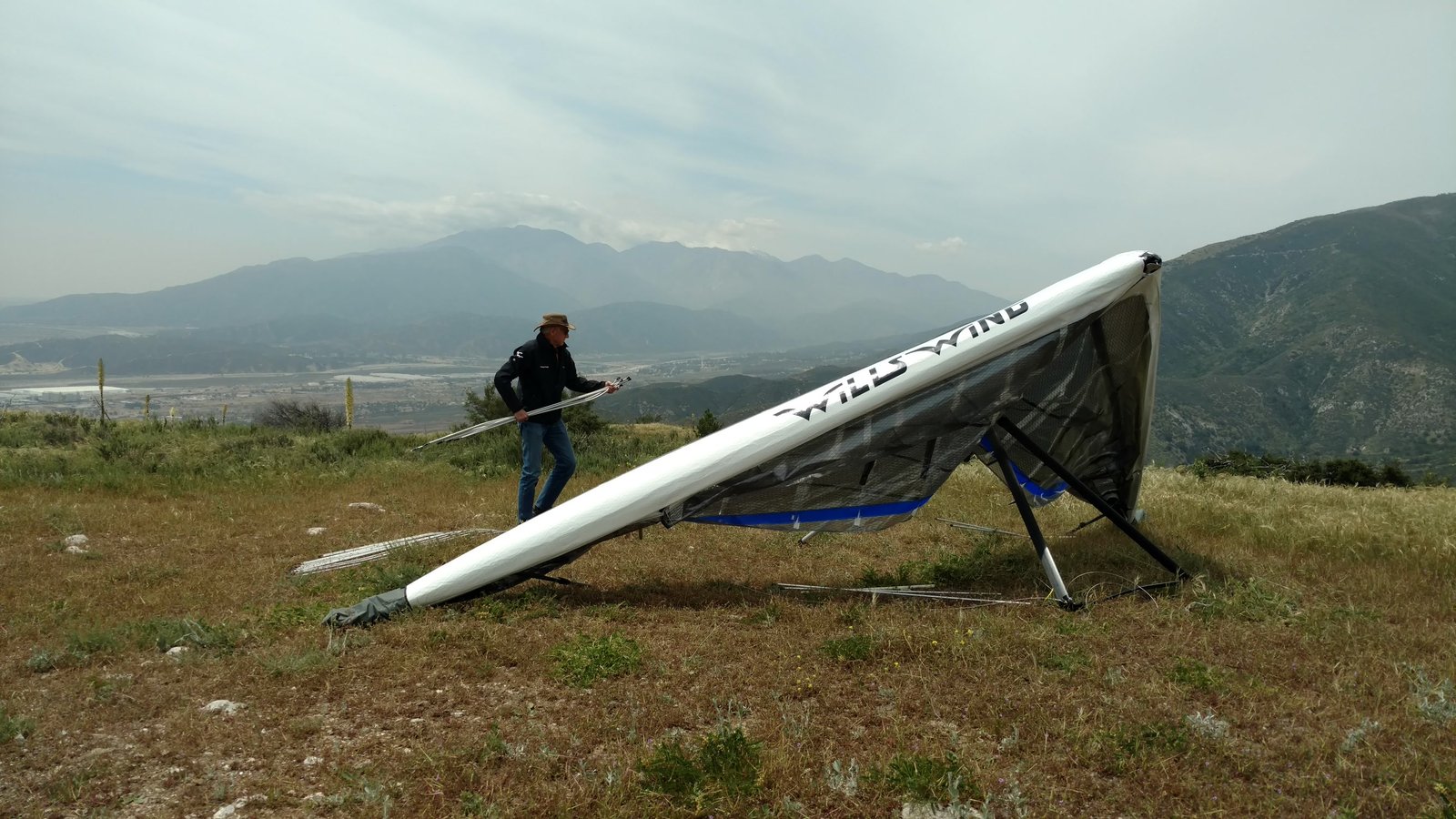 Good. Twisted left tip 1 notch for a very slight right turn. Nice handling overall. Warm post-Santa-Ana day promising good altitudes. Bumpy at ridge level and lift was on and off. Got above Billboard to 6k+ and put my right glove on then sank. Ended up flying for about 1/2 hour with one glove; left hand/arm got a little tired from gripping harder. Got 5.5k from Regionals and went back to Crestline, arriving 5,100. Had to save it in the bowl in front of launch. Billboard still not great and thought about landing (40 minutes) but got a great thermal above the water tank to 6k. Put both gloves on. Went to Pine and climbed to 8k next to a racy PG. We went west toward Sugarpine; felt like a headwind. Still not beaming up and had sink alarm over the peak so I went back to Pine then Regionals. Did some speed runs to get low but didn't sink much. Wingovers near the 750 (Dusty, Gene, Nate waiting to launch) then it to the LZ. Saw zero wind and found lift SW of the Ranch so I was able to wait for wind. Good SSW 7 to land into. Got lifted near the cone, didn't go to basetube so I went s good way past. Nice one-stepper photographed by Dave Aldrich. Many had gone east with big hopes but came back relatively early; some saw 9k. Owen went to San Gorgonio and back. |