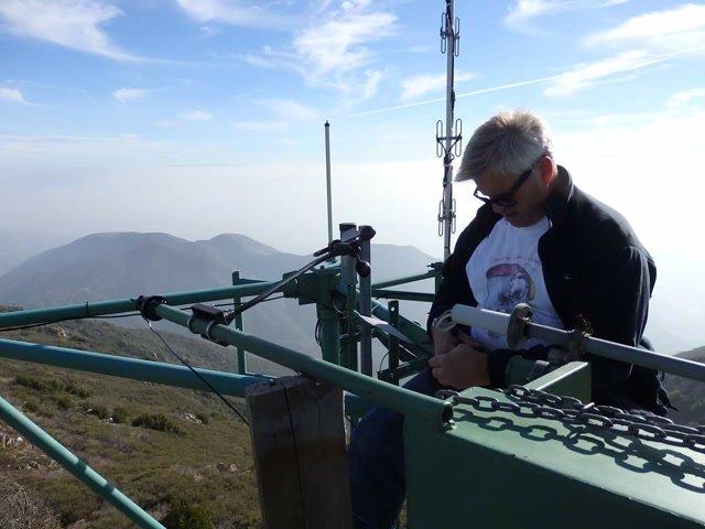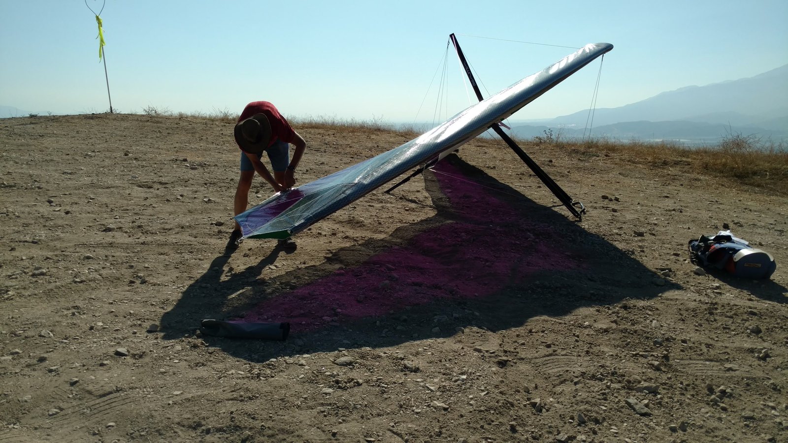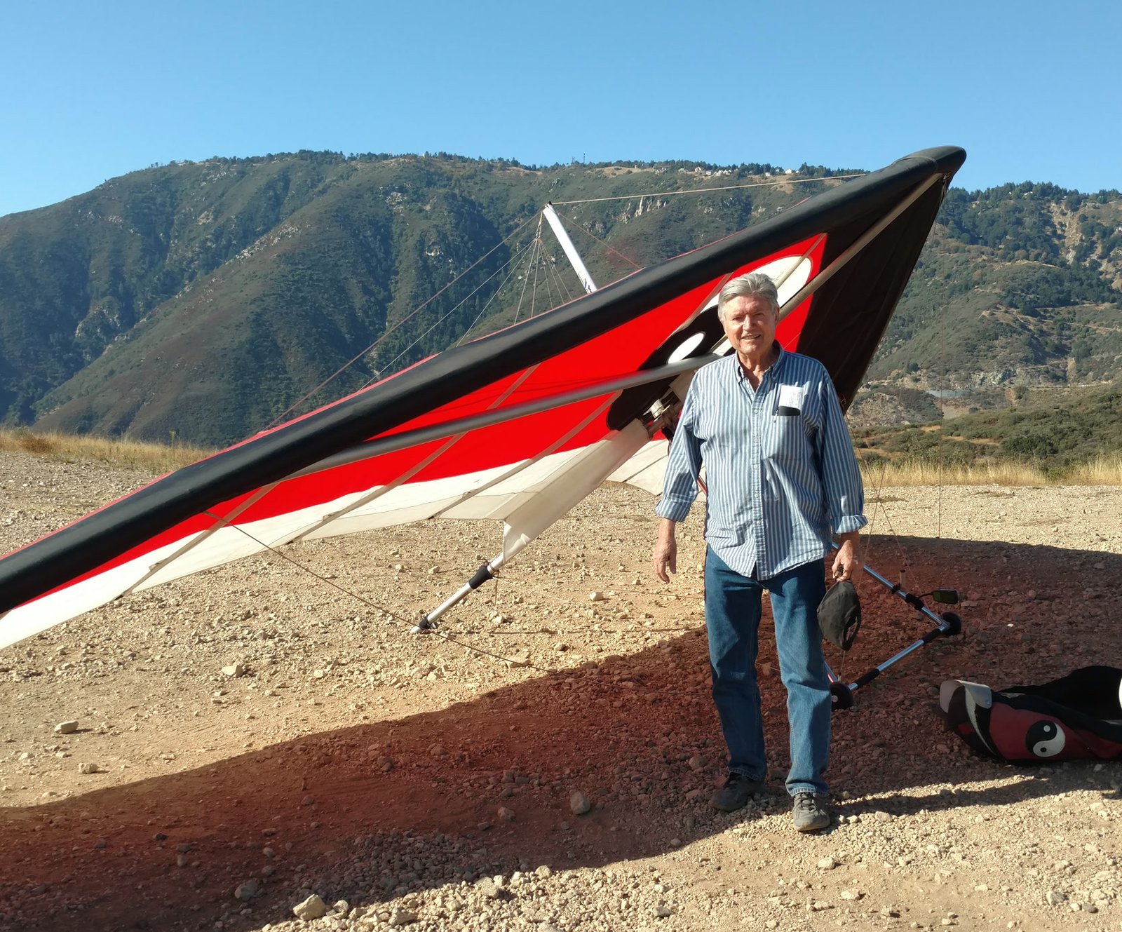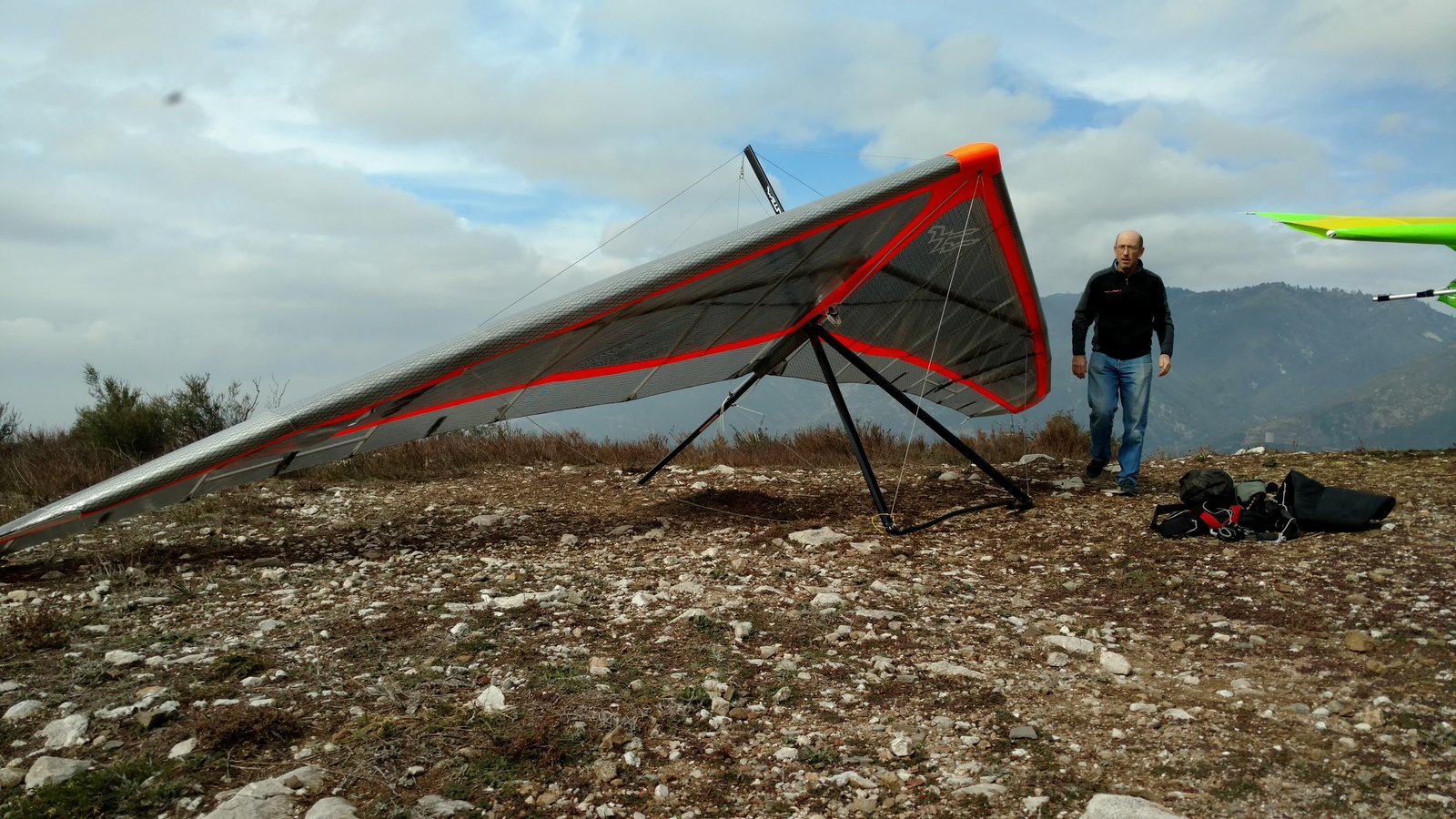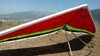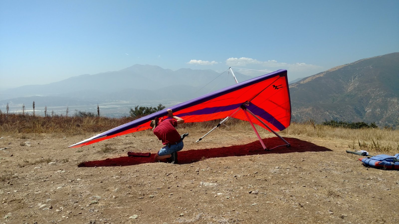 Good. Twisted left tip 1 notch for a very slight right turn. Nice handling overall. Warm post-Santa-Ana day promising good altitudes. Bumpy at ridge level and lift was on and off. Got above Billboard to 6k+ and put my right glove on then sank. Ended up flying for about 1/2 hour with one glove; left hand/arm got a little tired from gripping harder. Got 5.5k from Regionals and went back to Crestline, arriving 5,100. Had to save it in the bowl in front of launch. Billboard still not great and thought about landing (40 minutes) but got a great thermal above the water tank to 6k. Put both gloves on. Went to Pine and climbed to 8k next to a racy PG. We went west toward Sugarpine; felt like a headwind. Still not beaming up and had sink alarm over the peak so I went back to Pine then Regionals. Did some speed runs to get low but didn't sink much. Wingovers near the 750 (Dusty, Gene, Nate waiting to launch) then it to the LZ. Saw zero wind and found lift SW of the Ranch so I was able to wait for wind. Good SSW 7 to land into. Got lifted near the cone, didn't go to basetube so I went s good way past. Nice one-stepper photographed by Dave Aldrich. Many had gone east with big hopes but came back relatively early; some saw 9k. Owen went to San Gorgonio and back. |