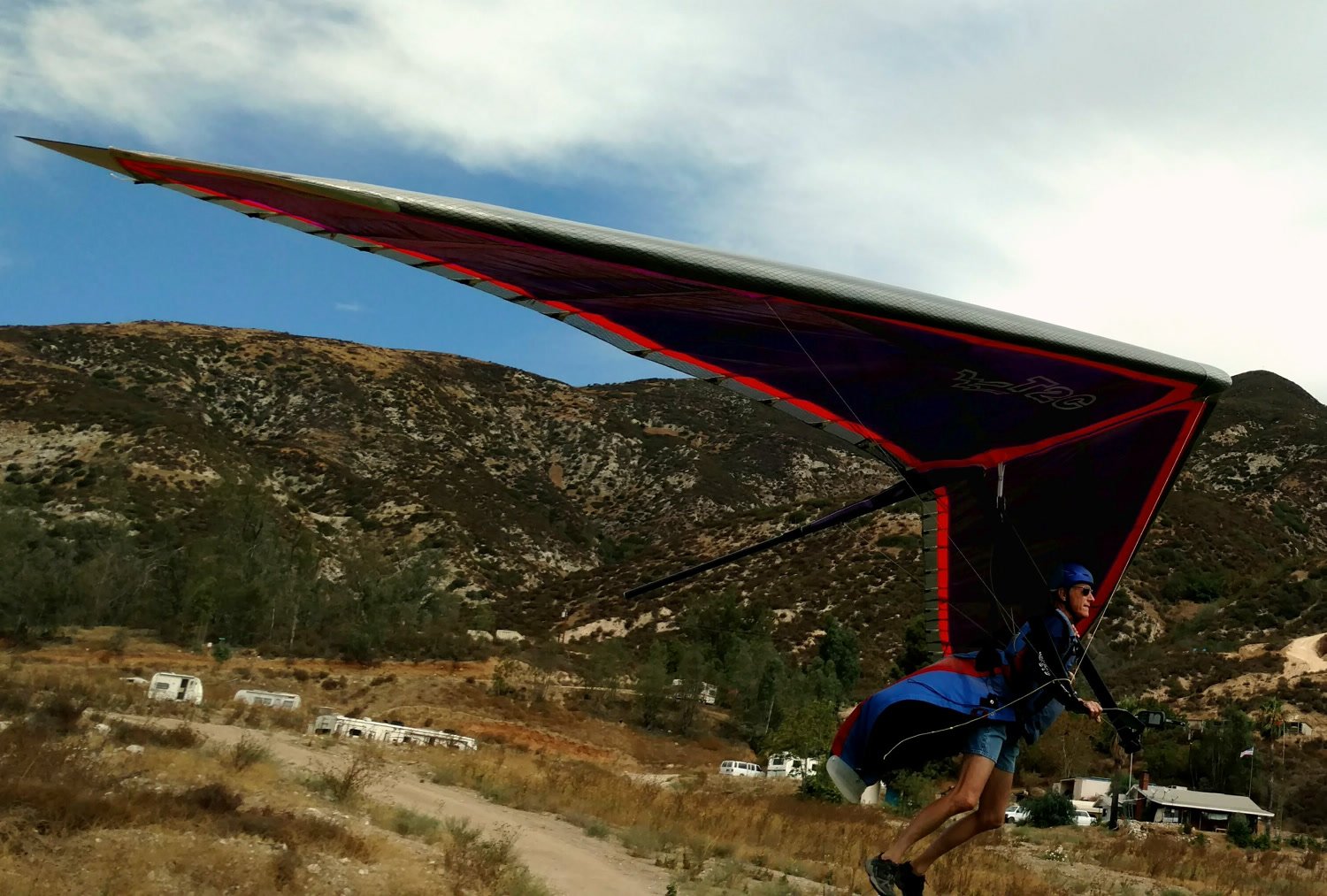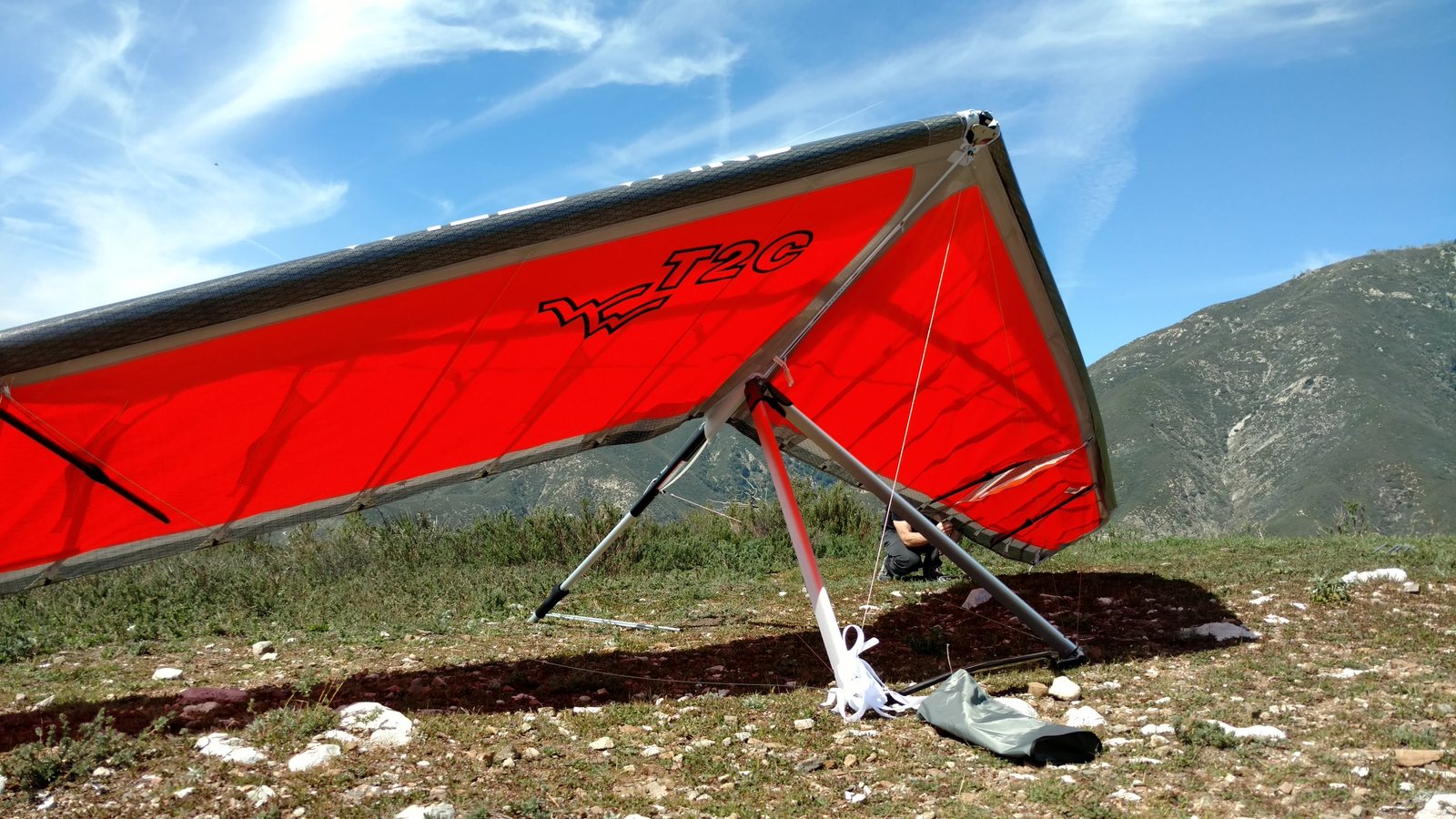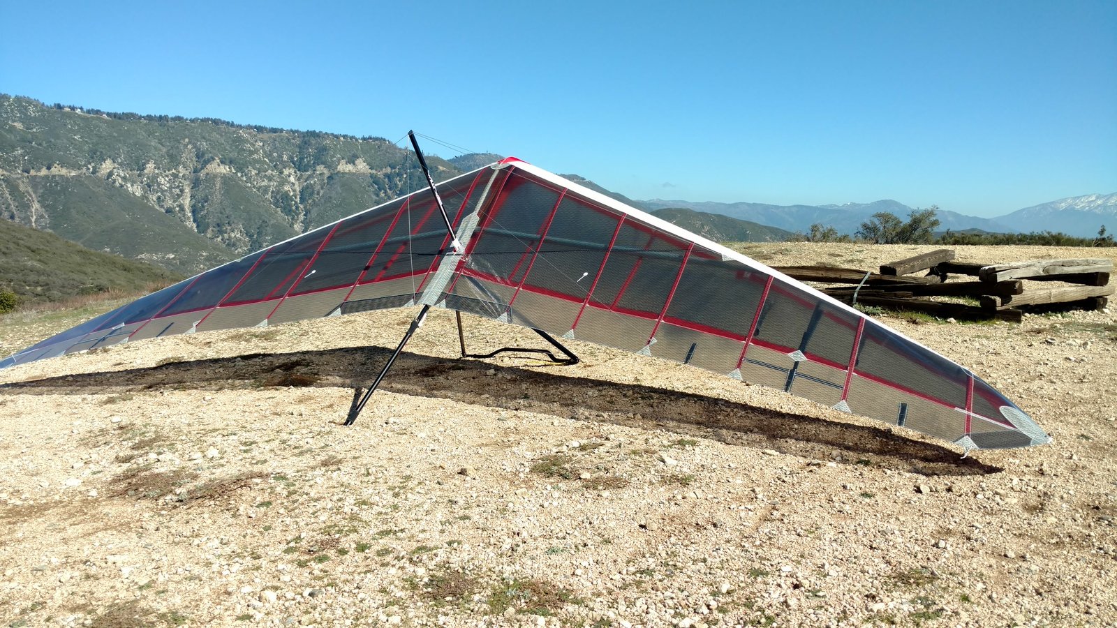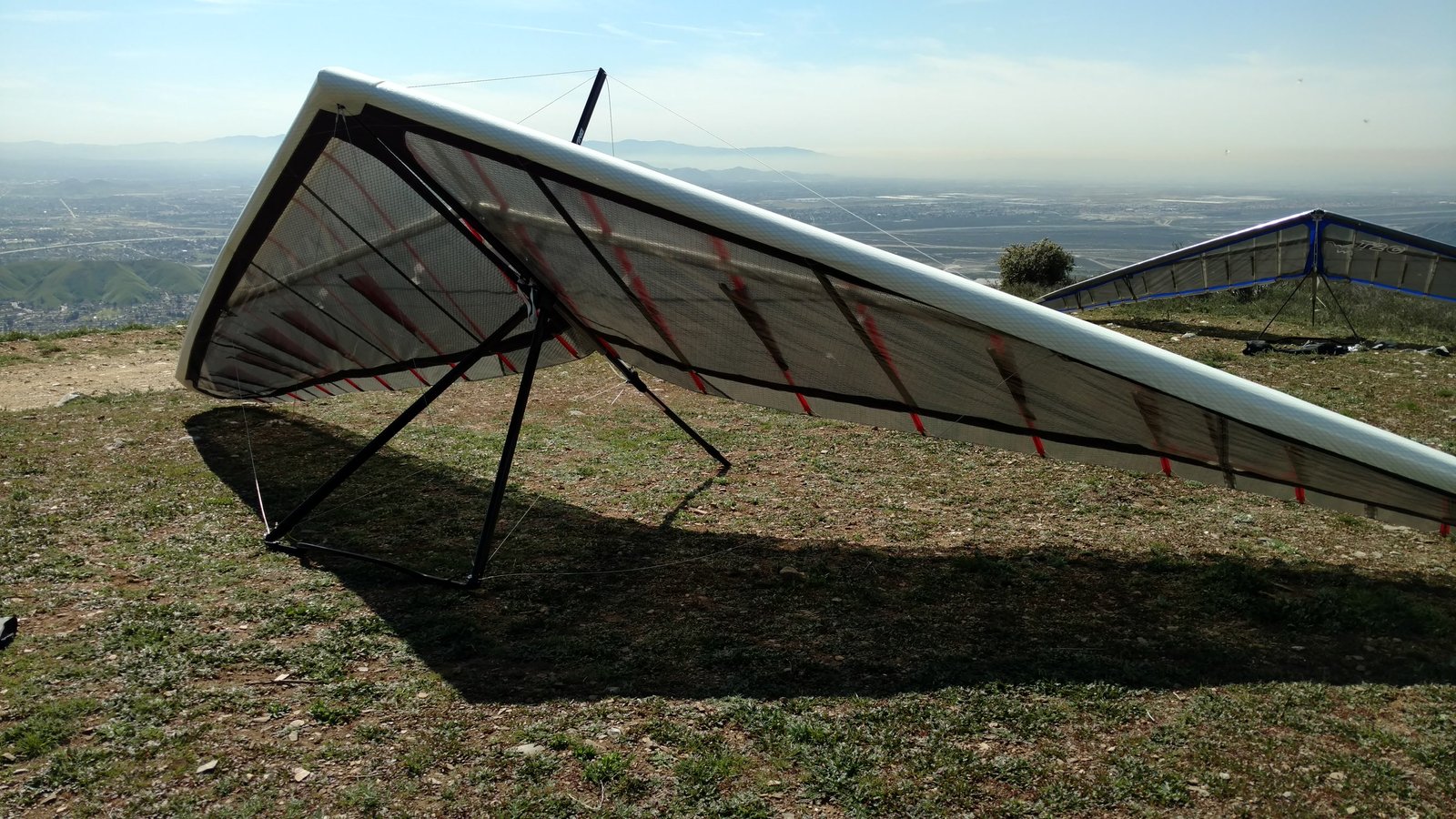 Great. No trim change over VG range. Clear and warm. Pre-frontal, rain expected after 4 p.m. Already steady SE at Crestline and Marshall, over 15 MPH. Almost ridge soarable SW of Regionals. Still steady east 400 AGL at the LZ. Calm S on the ground. Good landing 20 feet short of HG cone. |