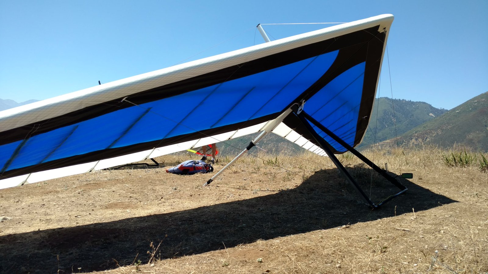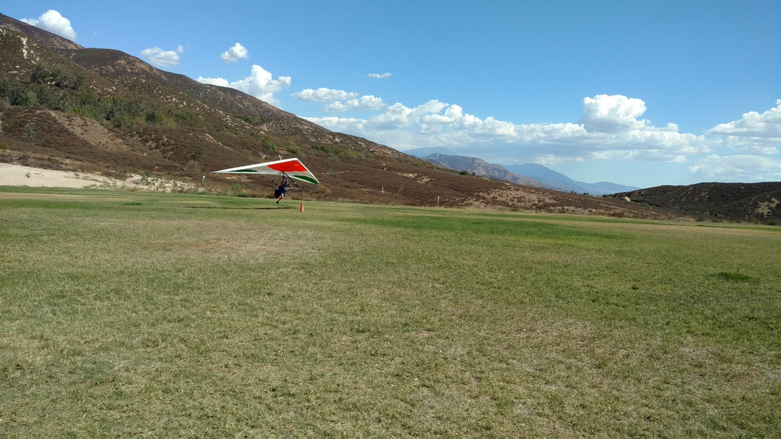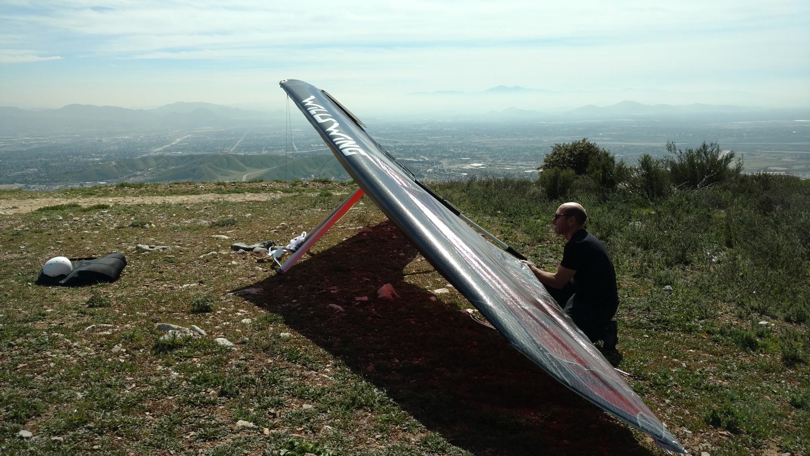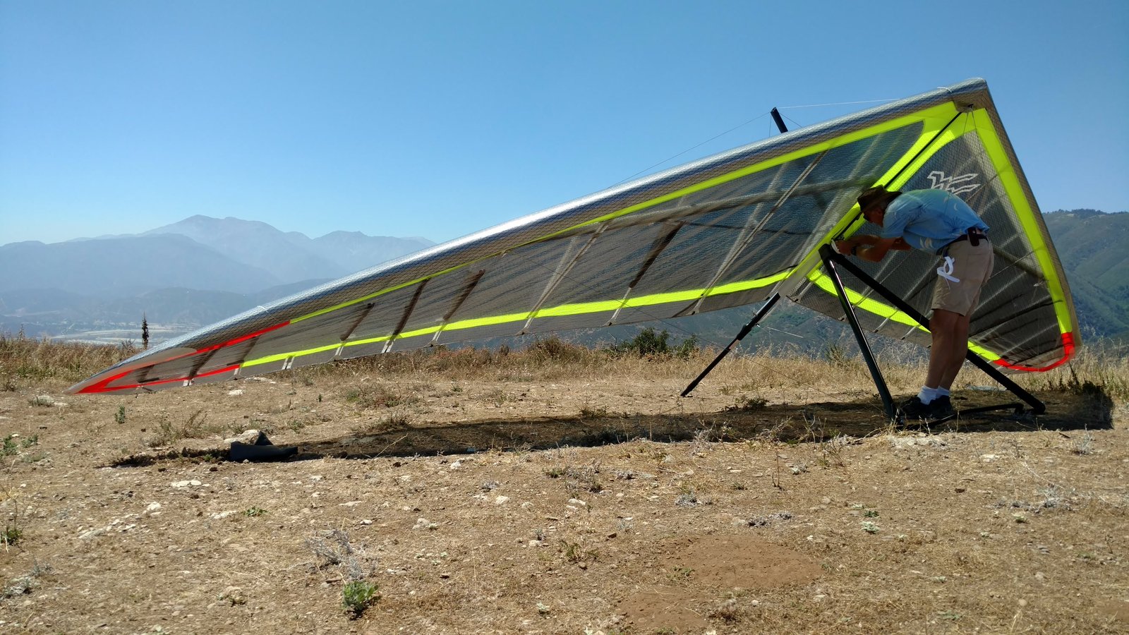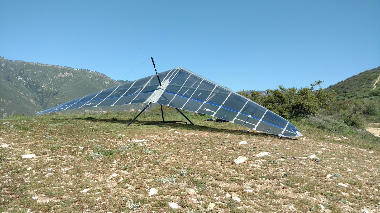 Great. No trim change over VG range. Clear and warm. Pre-frontal, rain expected after 4 p.m. Already steady SE at Crestline and Marshall, over 15 MPH. Almost ridge soarable SW of Regionals. Still steady east 400 AGL at the LZ. Calm S on the ground. Good landing 20 feet short of HG cone. |