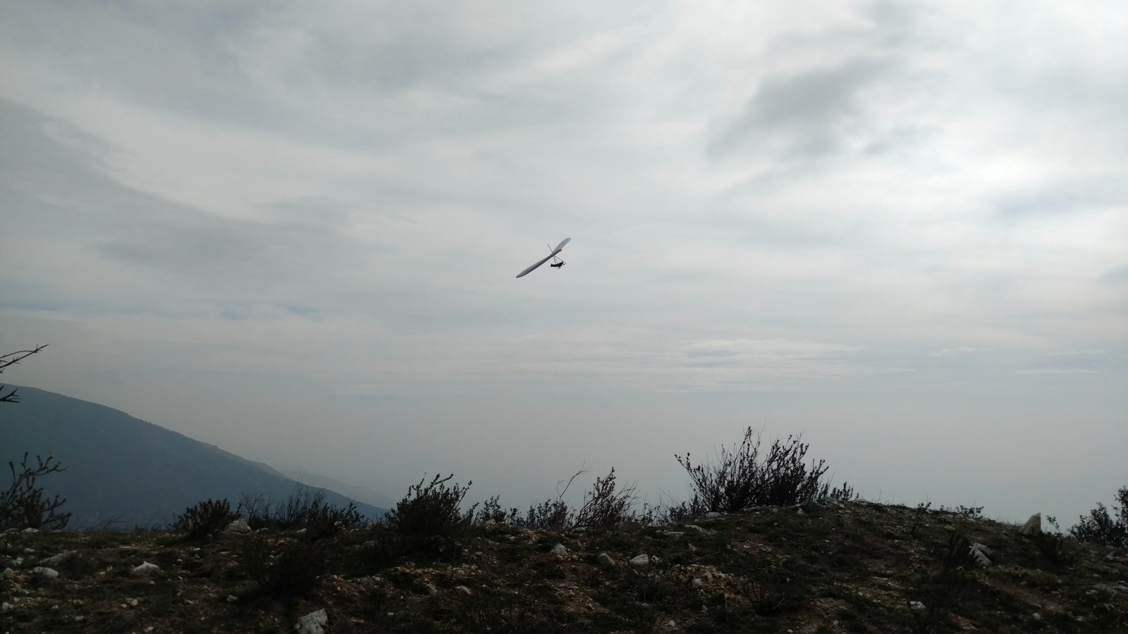 Nice handling High transient trim. Vt=21,21,28,35,40. Light pitch pressure. Raised all sprogs one turn. Pre-frontal with light winds and low clouds. Many thermals, some to cloudbase. GoPro on helmet. |
