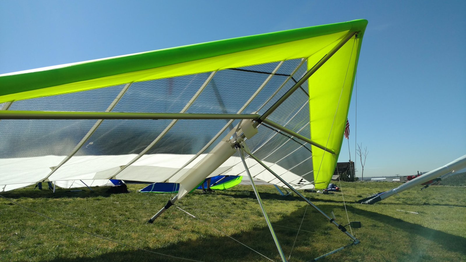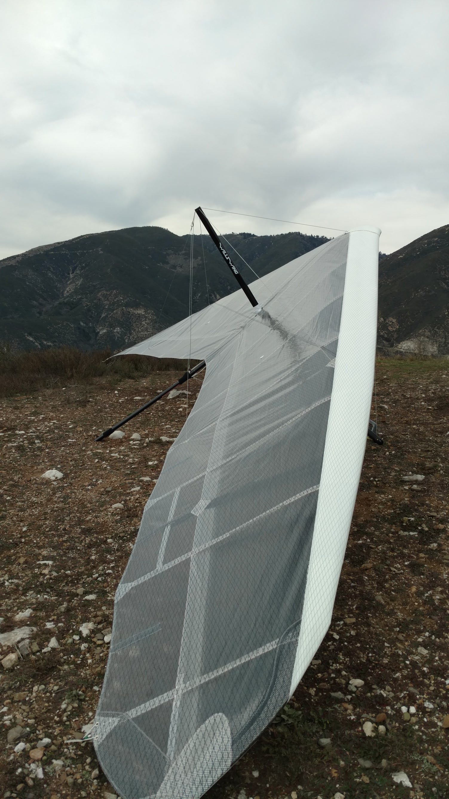 Twisted tips one and one for a right turn. Felt turn at launch. Steve had the right cup cone off the wand as he was releasing the lever so there is a slight possibility it wasn't seated, but I had no trouble mounting the top levers. Cool and very light winds after a Sunday/Monday rain system from the SW. Scratched by the 750 enough to confirm turn but no time to cycle VG etc. Would have preferred a longer flight for testing. Pure no-winder landing. Quarter VG and a good hard flare resulted in a smooth three-stepper. Whike setting up approach was fixated in the black skull flag, which was fluttering a little, then realized all other indicators were hanging slack. |