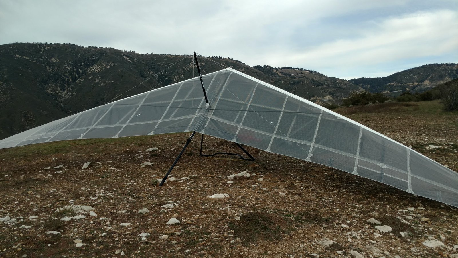 Good. Turned all batten tips out 5-10 turns from stock three turns out. Cloudy with system sweeping by to the north. Went to Marshall but soaring and top landing looked iffy. Four minutes of NNW as I stood on launch with the glider. Fun scratching in tiny bullets by the 350. Landed heading East with approach through the slot. |