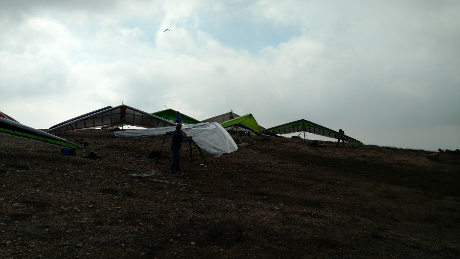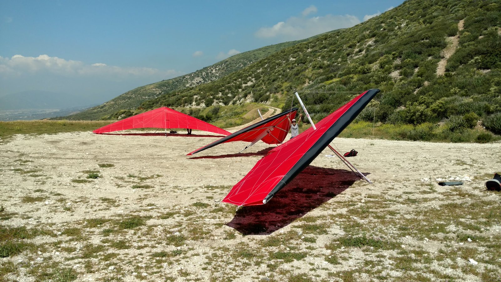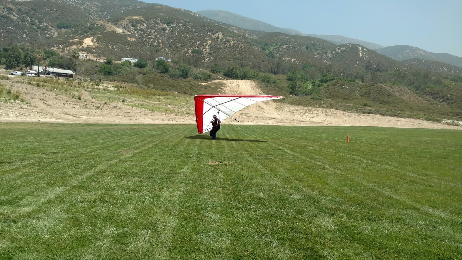 Clear and warm. Cruser Putnam was soaring in a PG but I wasn't able to find anything else enough to circle in. Went left from launch into the weak SSE. Very close to the PG cone, touched the right tip and wrestled the glider to keep the basetube off the grass. |