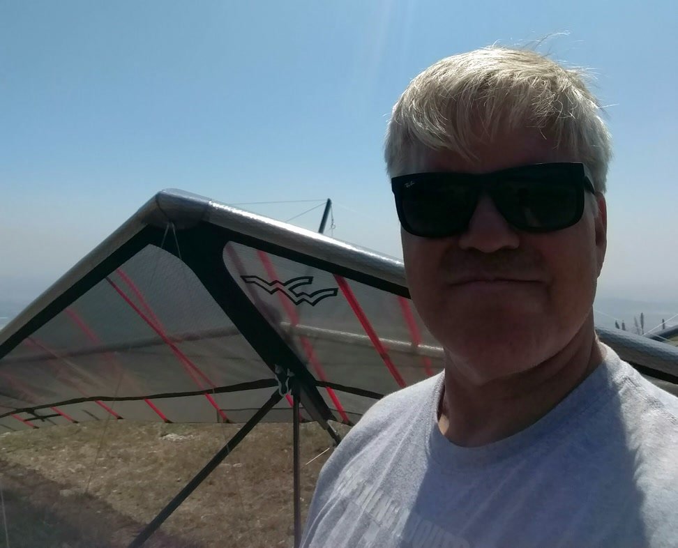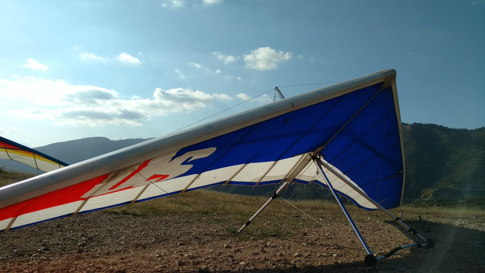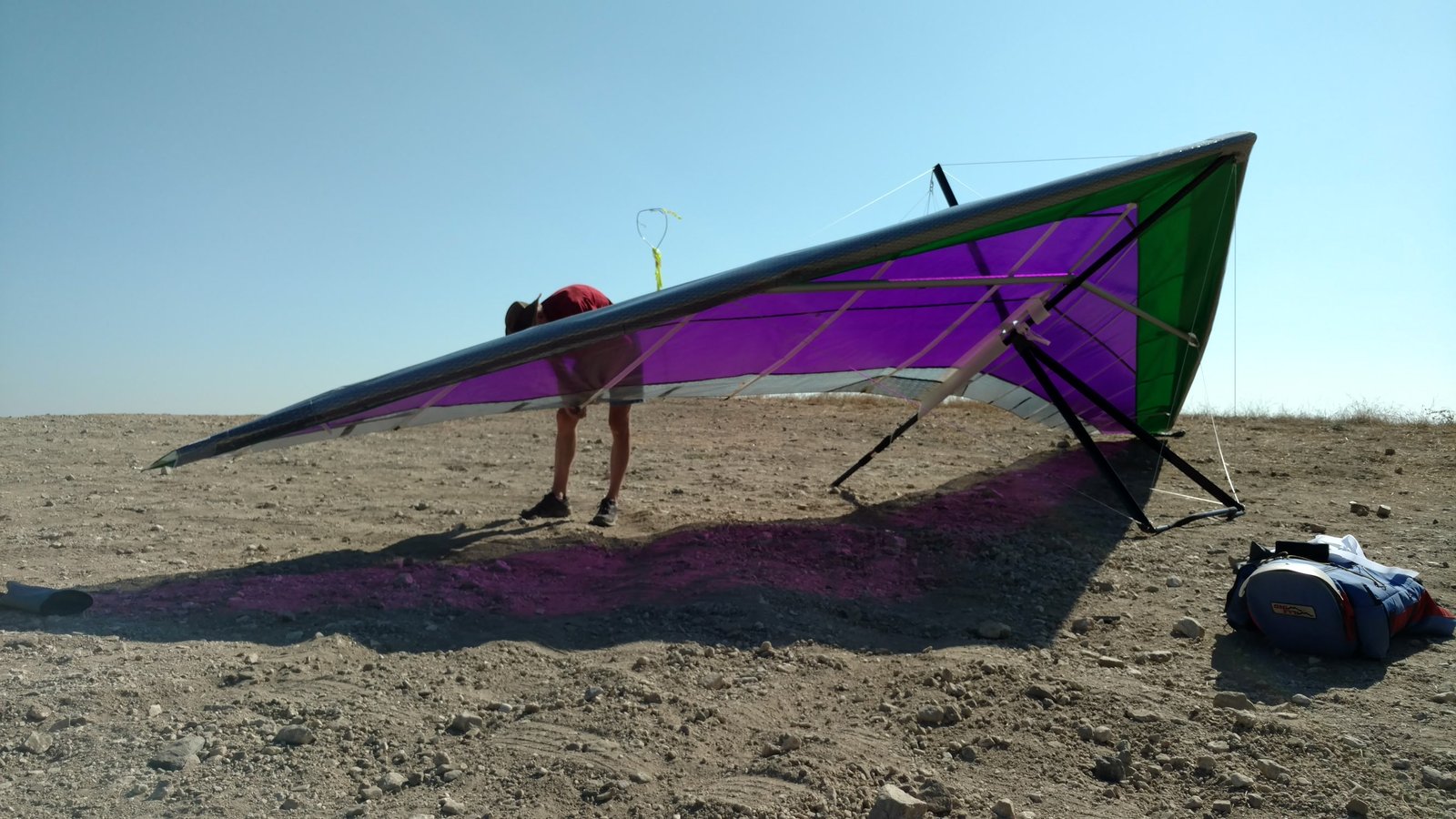 Clear and warm. Cruser Putnam was soaring in a PG but I wasn't able to find anything else enough to circle in. Went left from launch into the weak SSE. Very close to the PG cone, touched the right tip and wrestled the glider to keep the basetube off the grass. |