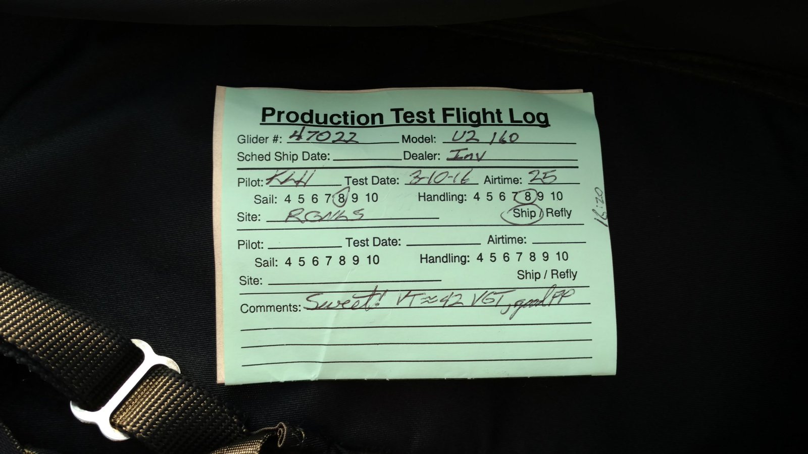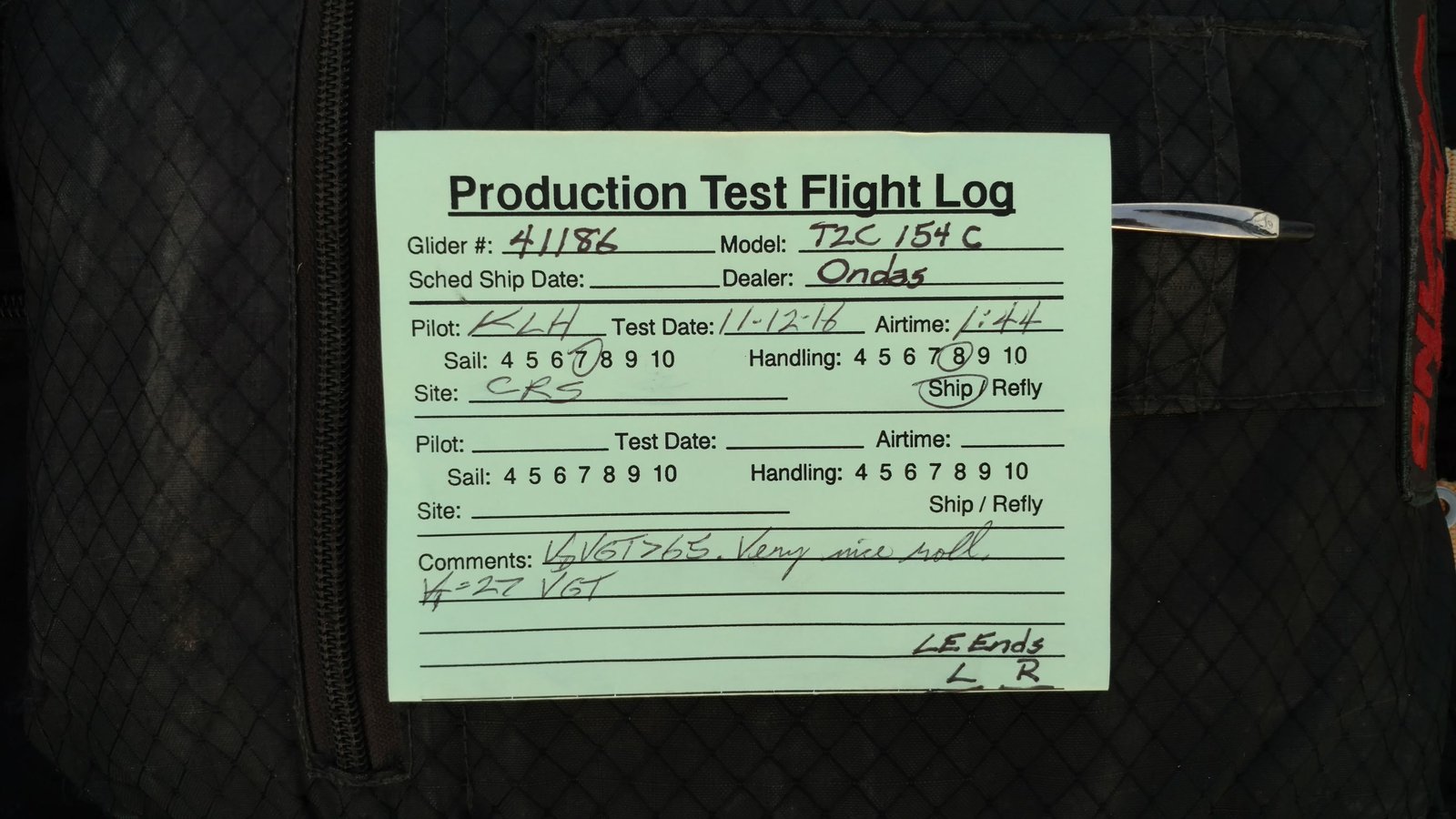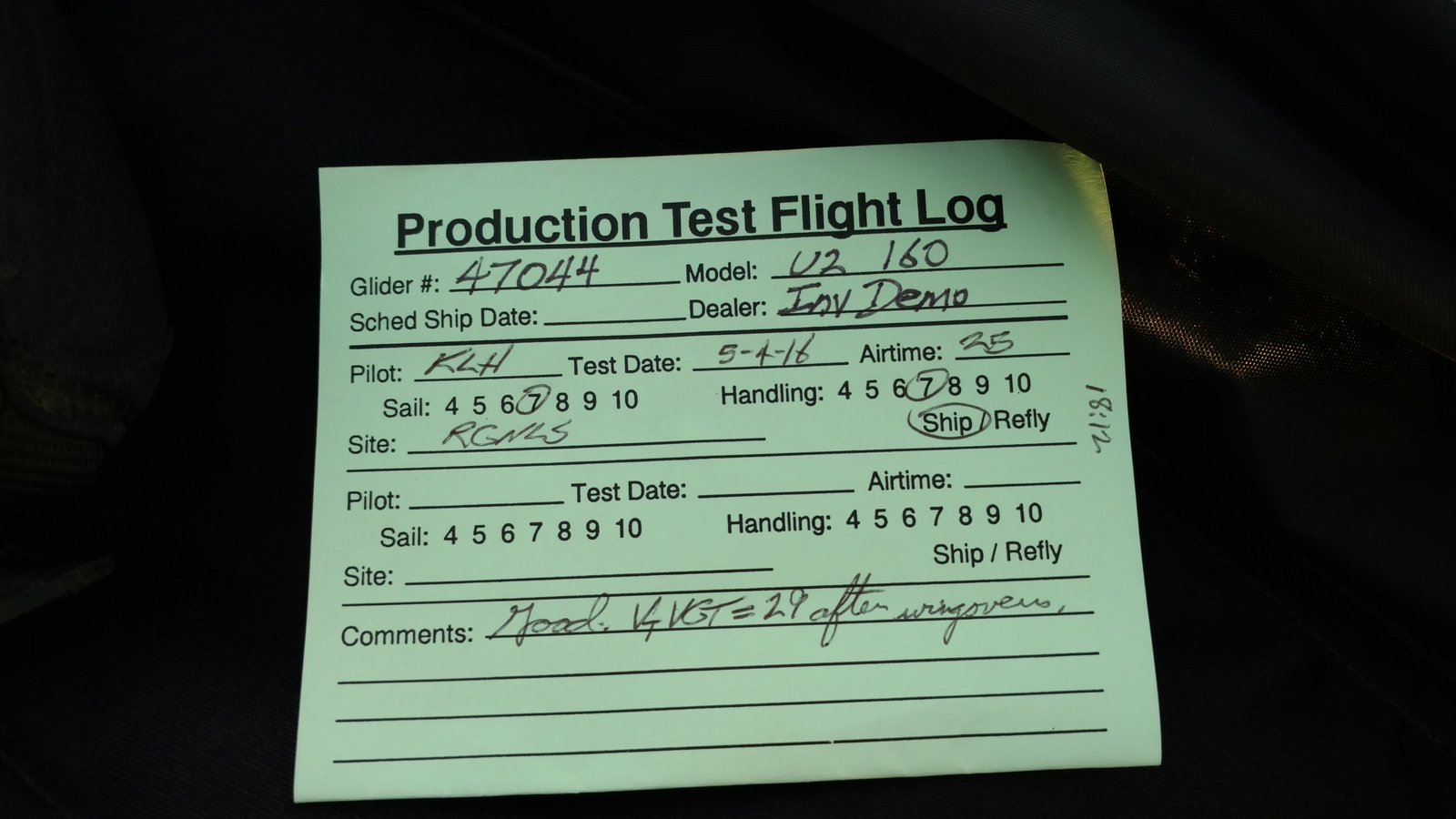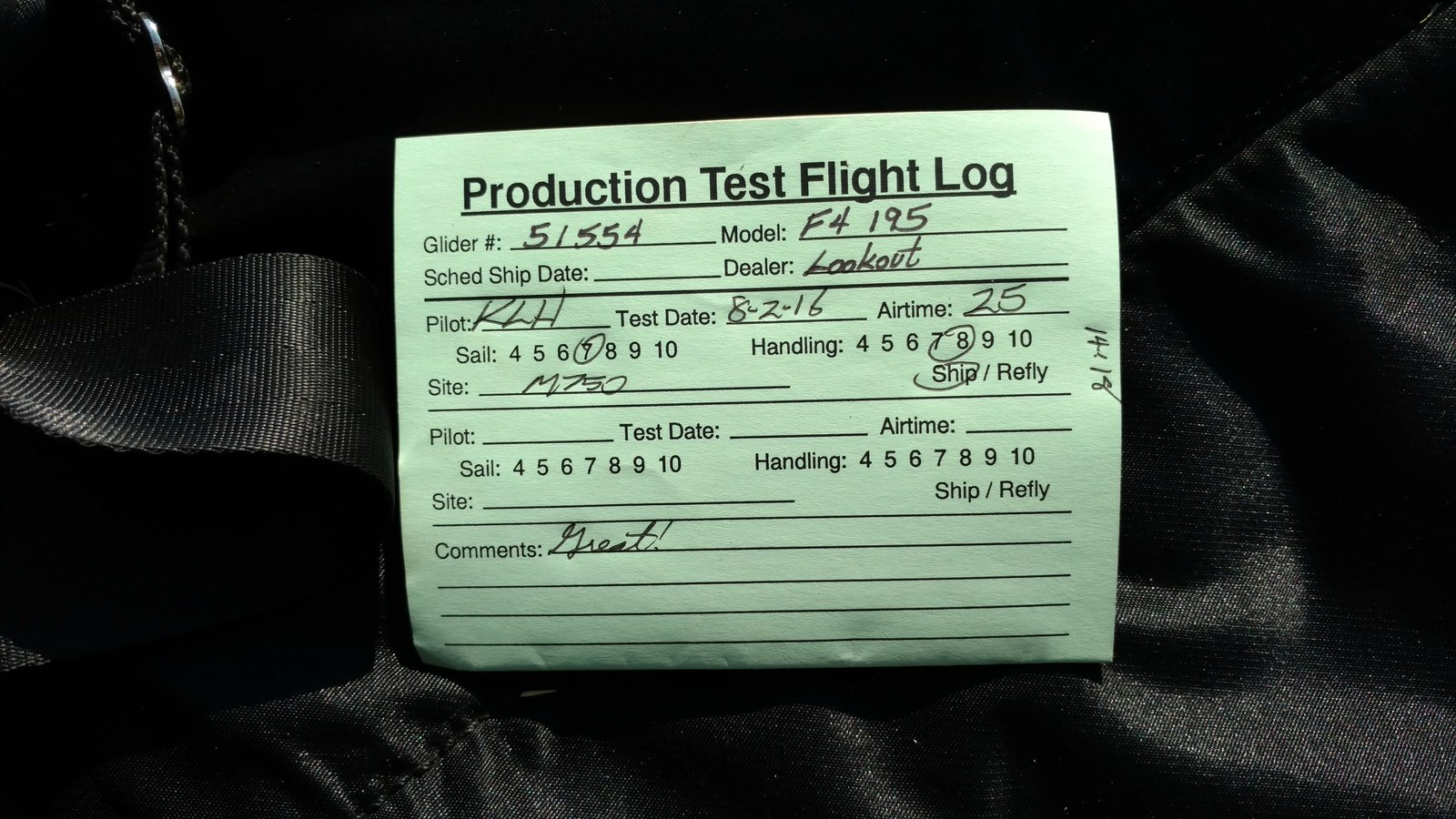 Good. Custom sleeves keel and extra zippers in P5 for floats, boat towing All-Mylar TS. Low clouds, almost no wind. Santa Anas tomorrow. Flags at LZ twitched from NW, approached from SE, good flare less than a wingspan short of the PG cone. Tied with Mike. |