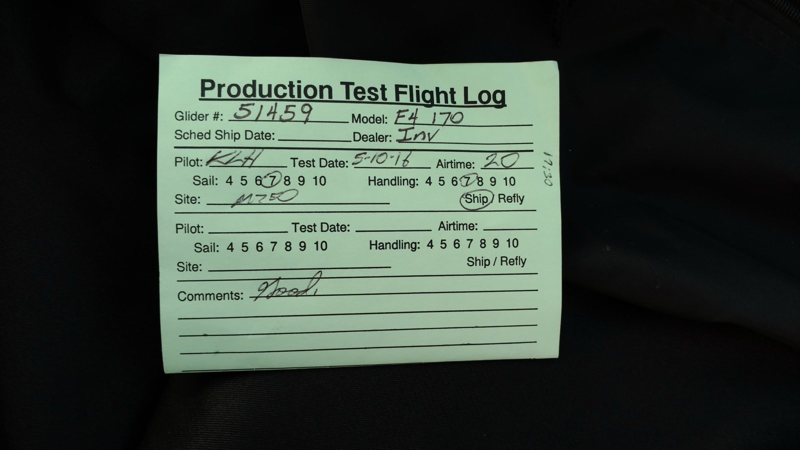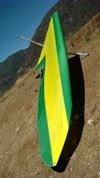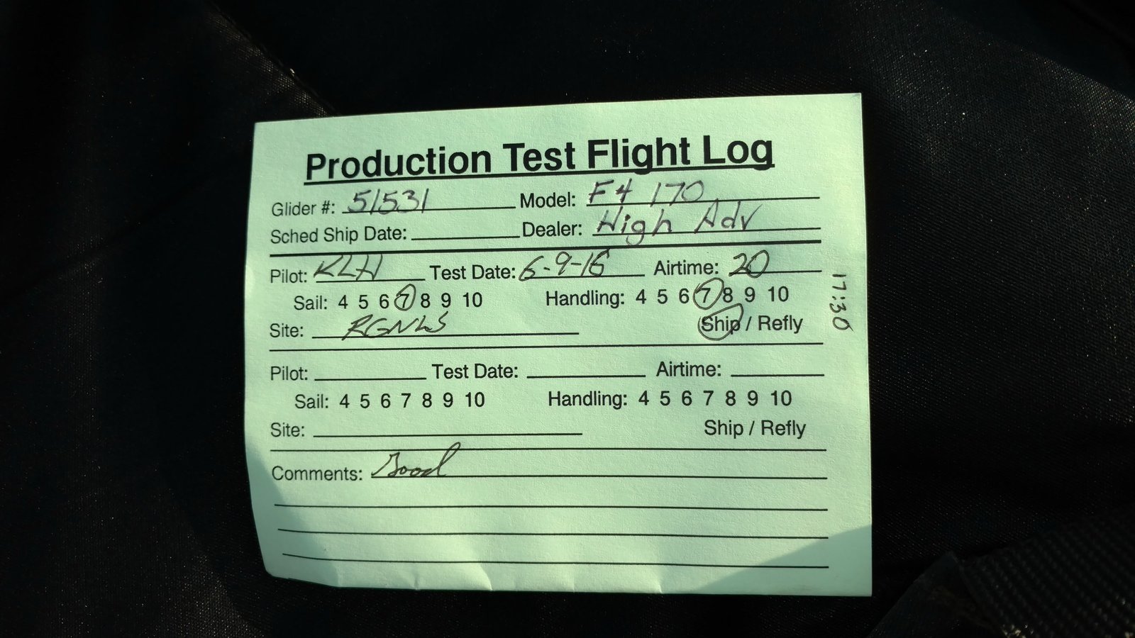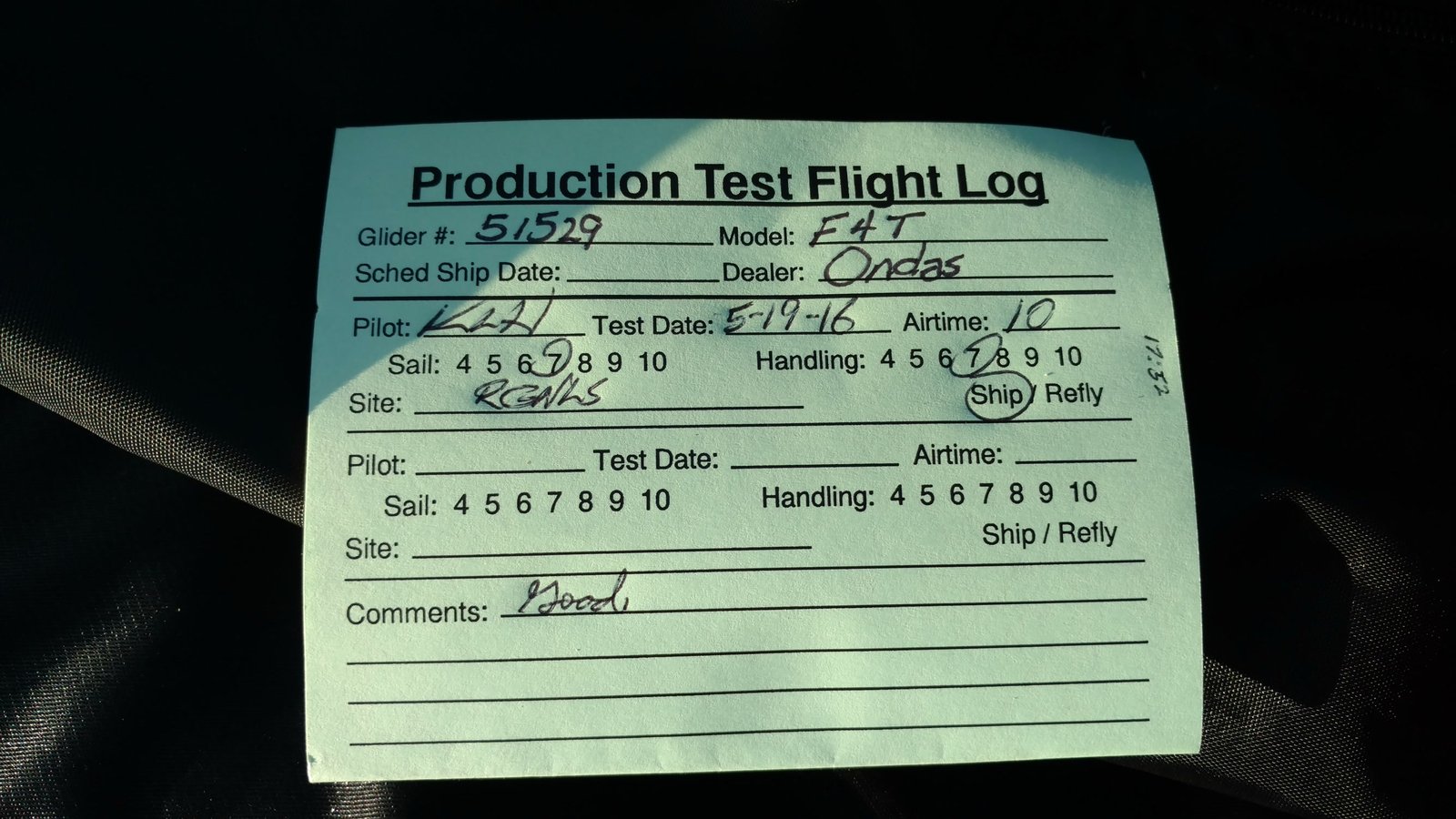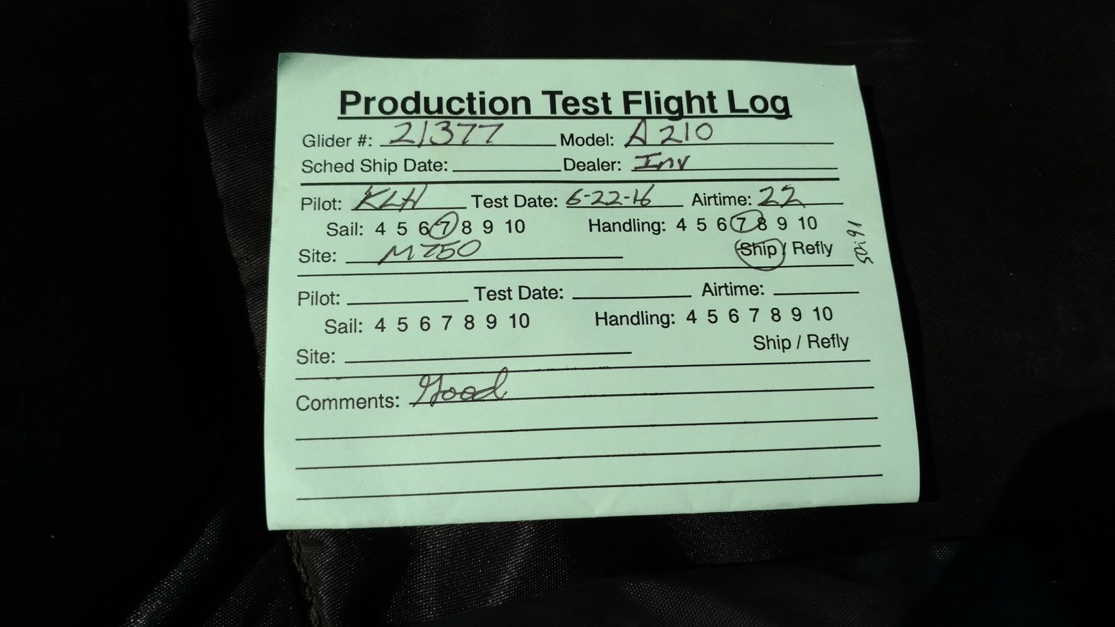 Good. Custom sleeves keel and extra zippers in P5 for floats, boat towing All-Mylar TS. Low clouds, almost no wind. Santa Anas tomorrow. Flags at LZ twitched from NW, approached from SE, good flare less than a wingspan short of the PG cone. Tied with Mike. |