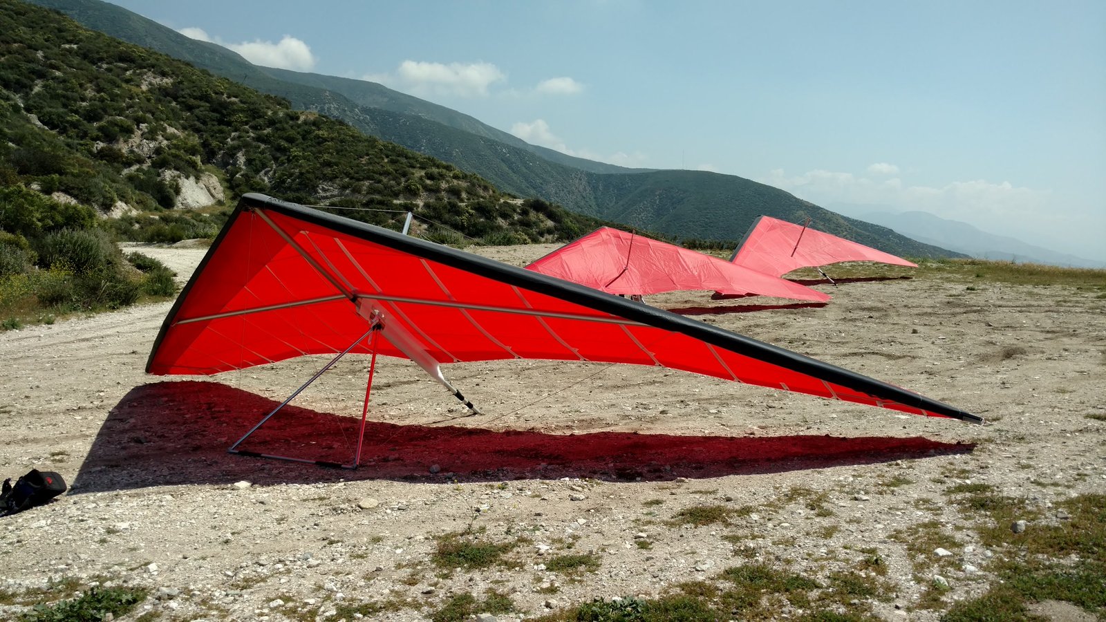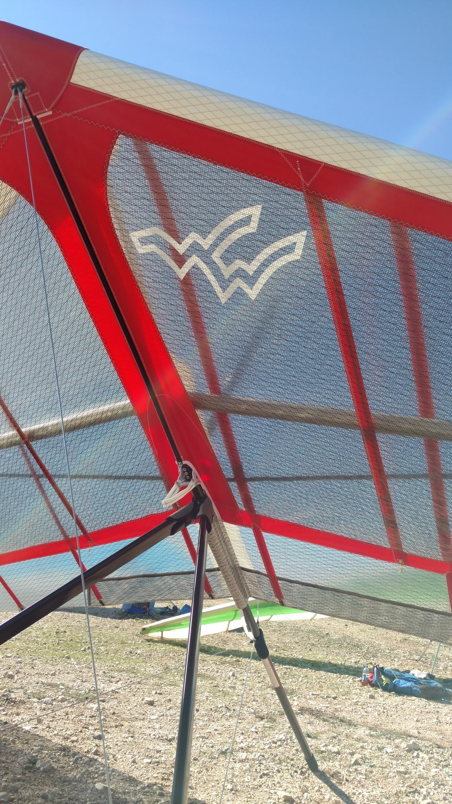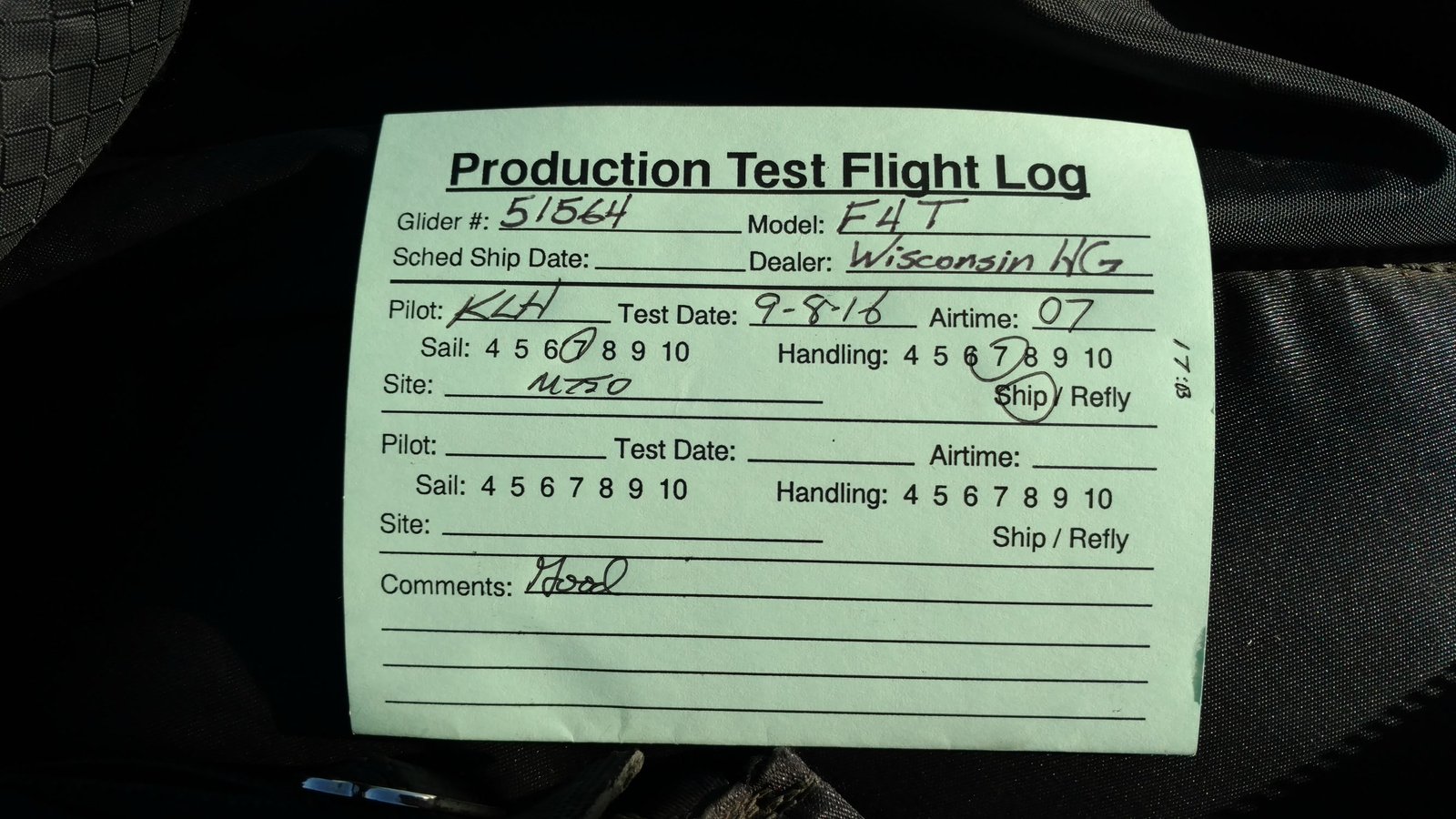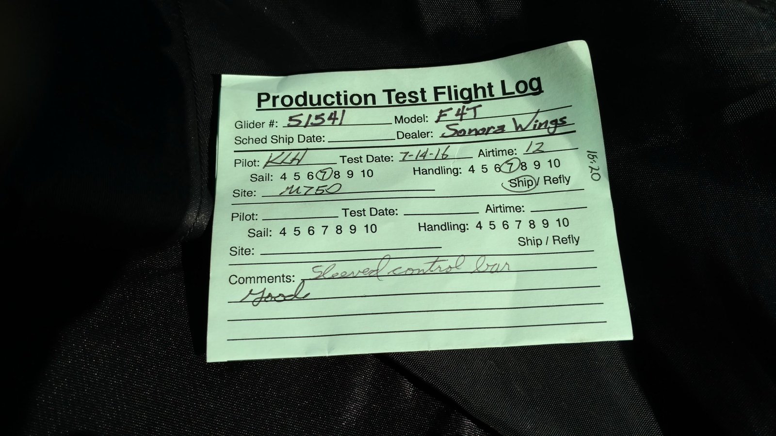 Good. Custom sleeves keel and extra zippers in P5 for floats, boat towing All-Mylar TS. Low clouds, almost no wind. Santa Anas tomorrow. Flags at LZ twitched from NW, approached from SE, good flare less than a wingspan short of the PG cone. Tied with Mike. |