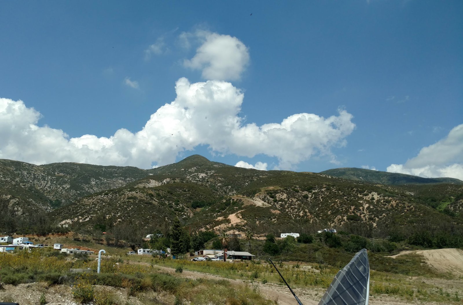 Had a very brief line of rain cone through around one pm. Not quite ridge soarable at Crestline. Jim flew across the canyon. Scratched in very narrow cores. Good landing into light S. Then it got brighter and more pleasant at the LZ. |