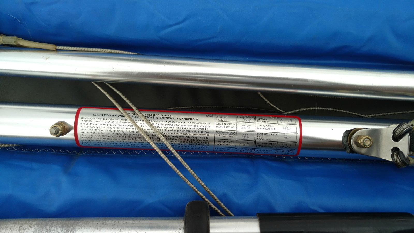 Good. VdVGT=70. Climb from Last Chance to 8k 2/3 off the way back to Crestline. Left the core and gained 400 feet flying straight. Found 900 down going from Marshall to the radio towers. Strong NW as I neared the LZ. Waited it out till it turned west, hunting for air that wasn't going up. Landed smoothly into strong headwind. During my third wingover the front to rear cord on my harness broke at the rear knot. At the same time the aft VG pulley spreader slipped forward 4 inches (didn't know exact problem till after landing). Glider was VGL with 3/4 off the rope hanging out. Not a control or safety issue. A guy, Wilmer, landed a PG having flown from Elsinore. |
