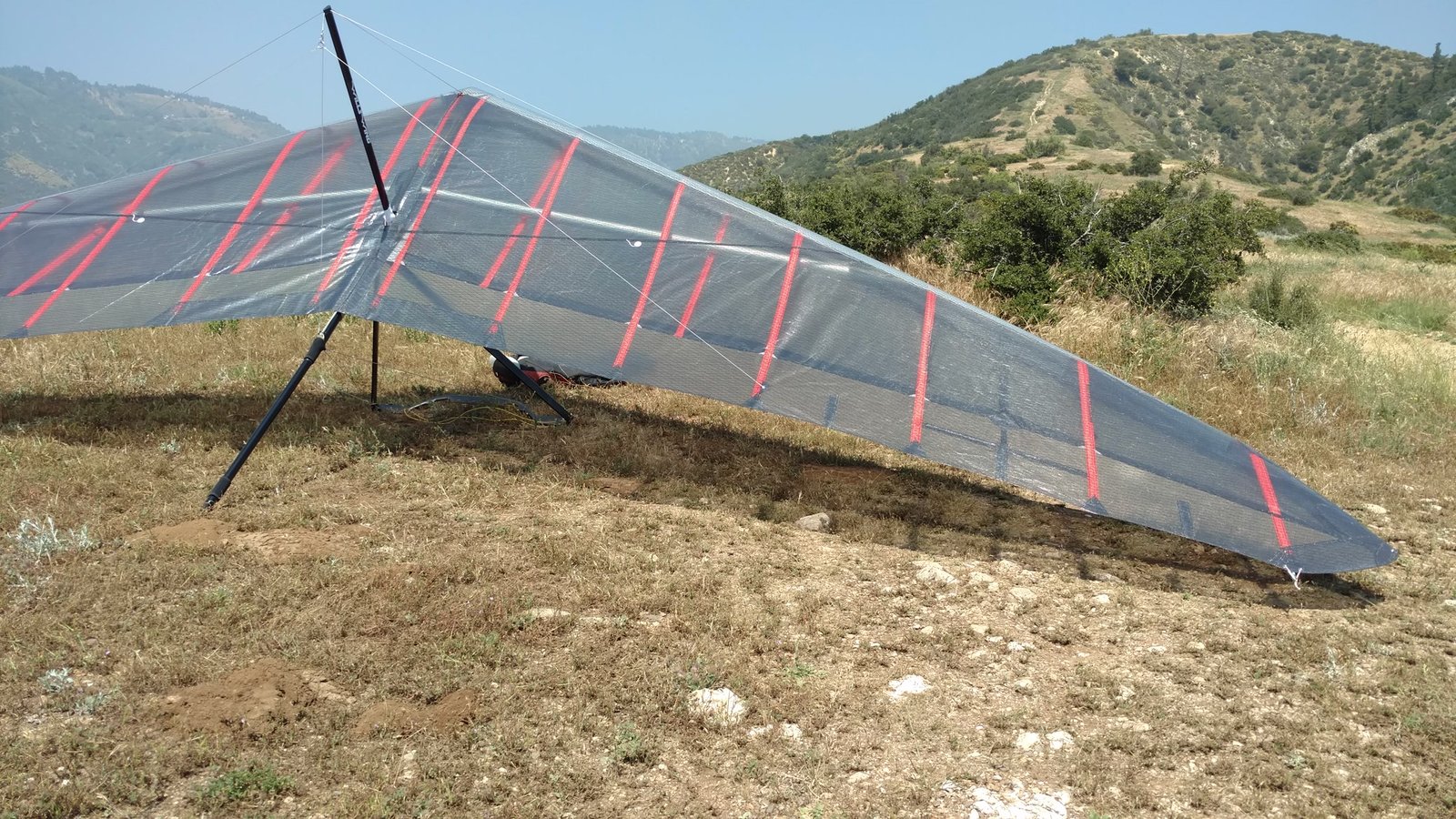 Good. Hot and clear. Good scratching off the 350. Ie passed and I went to the LZ to find zero wind and lift off the East side. Approach to the south still in zero, left wing dropped, then nose, before I really started to flare. Left LE aloud along the grass. No scuffs. Should have had more of an eye on the LZ to pick a landing cycle. |