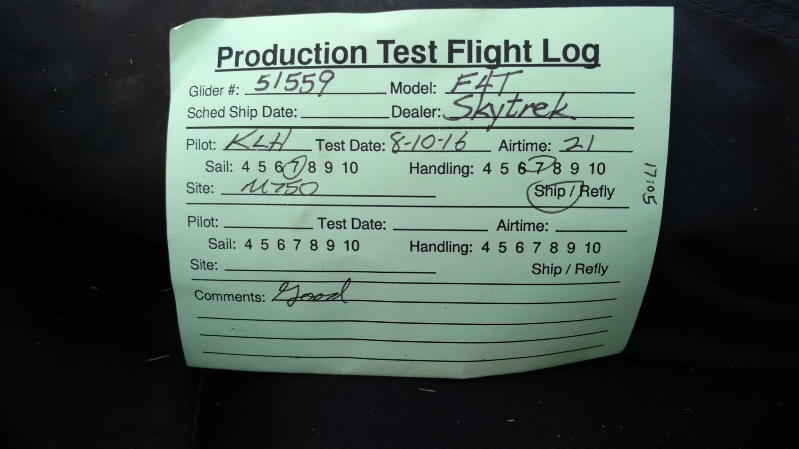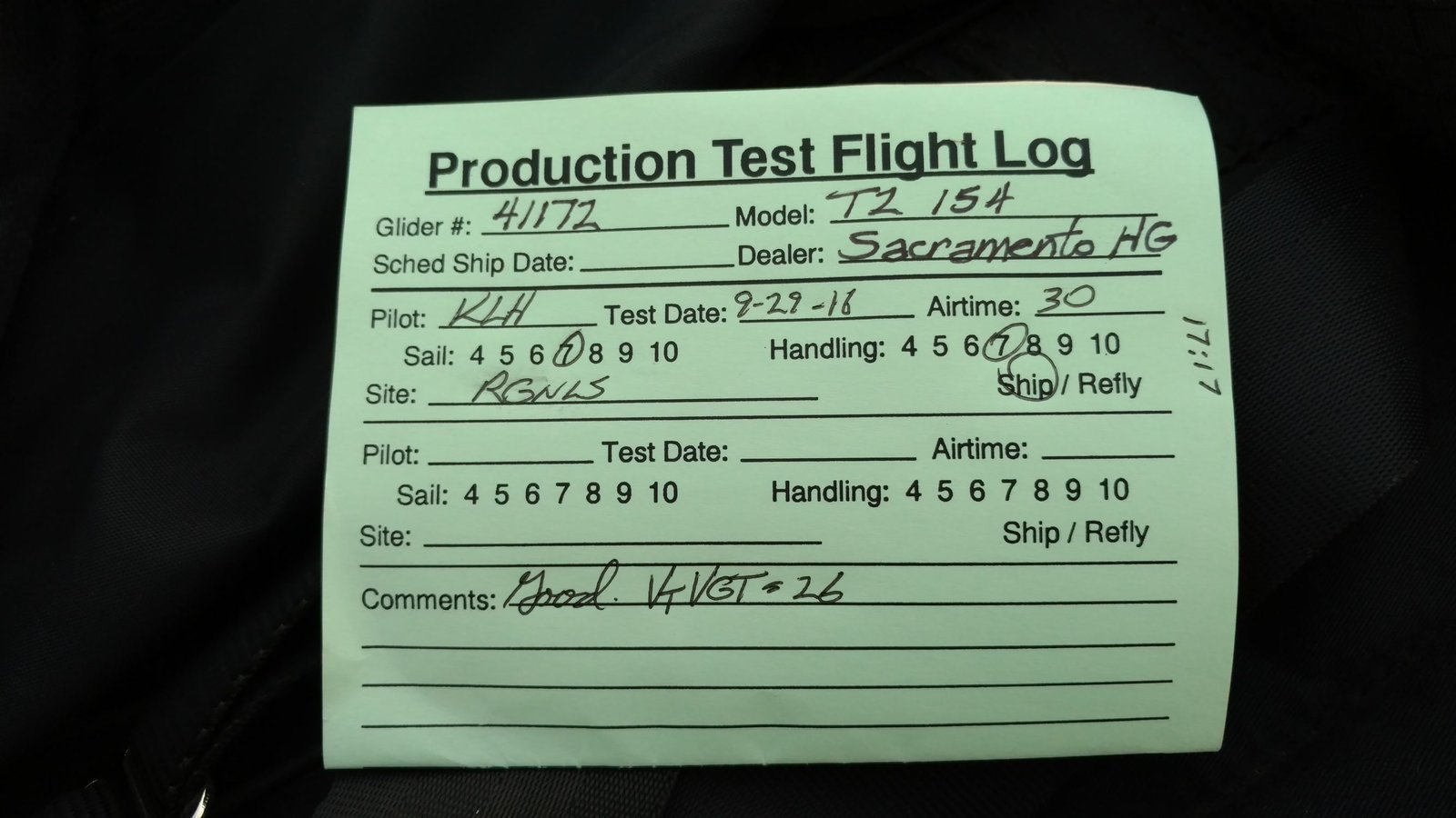 Good. A but stiffer than the 154C I flew the other day. VtVGT=30 Light right turn, twisted both tips 3/4 turn. 98% overcast with north flow in the morning. Surprisingly soarable; tight with soft edges. Got to 4.2k a couple of times; vertical above 4k. Light WNW in the LZ when I landed, trotting smoothly. |