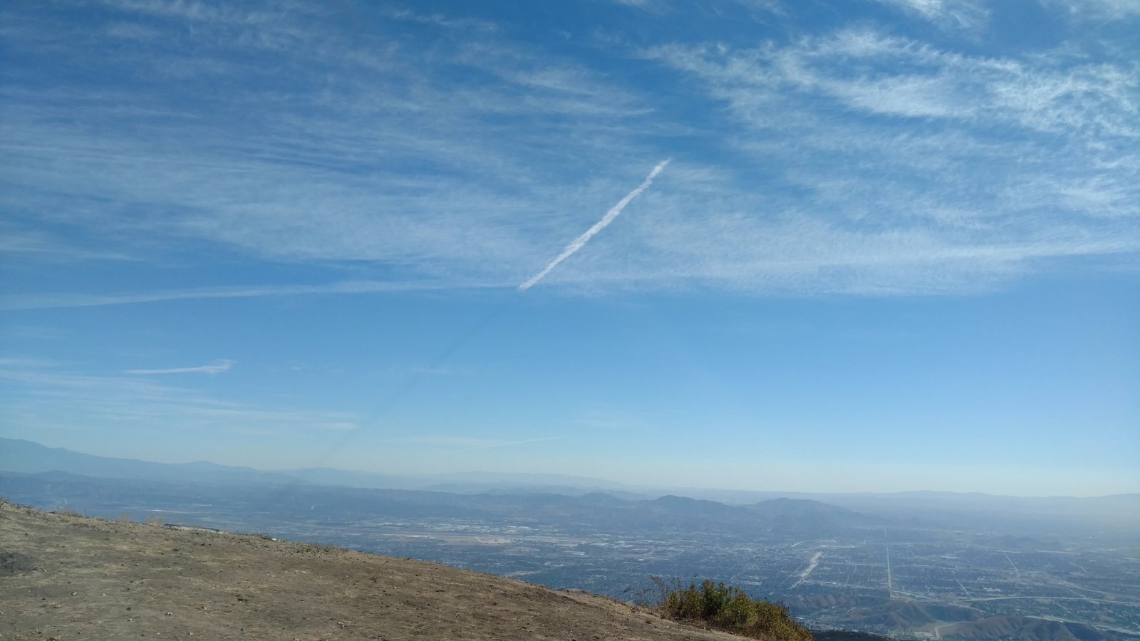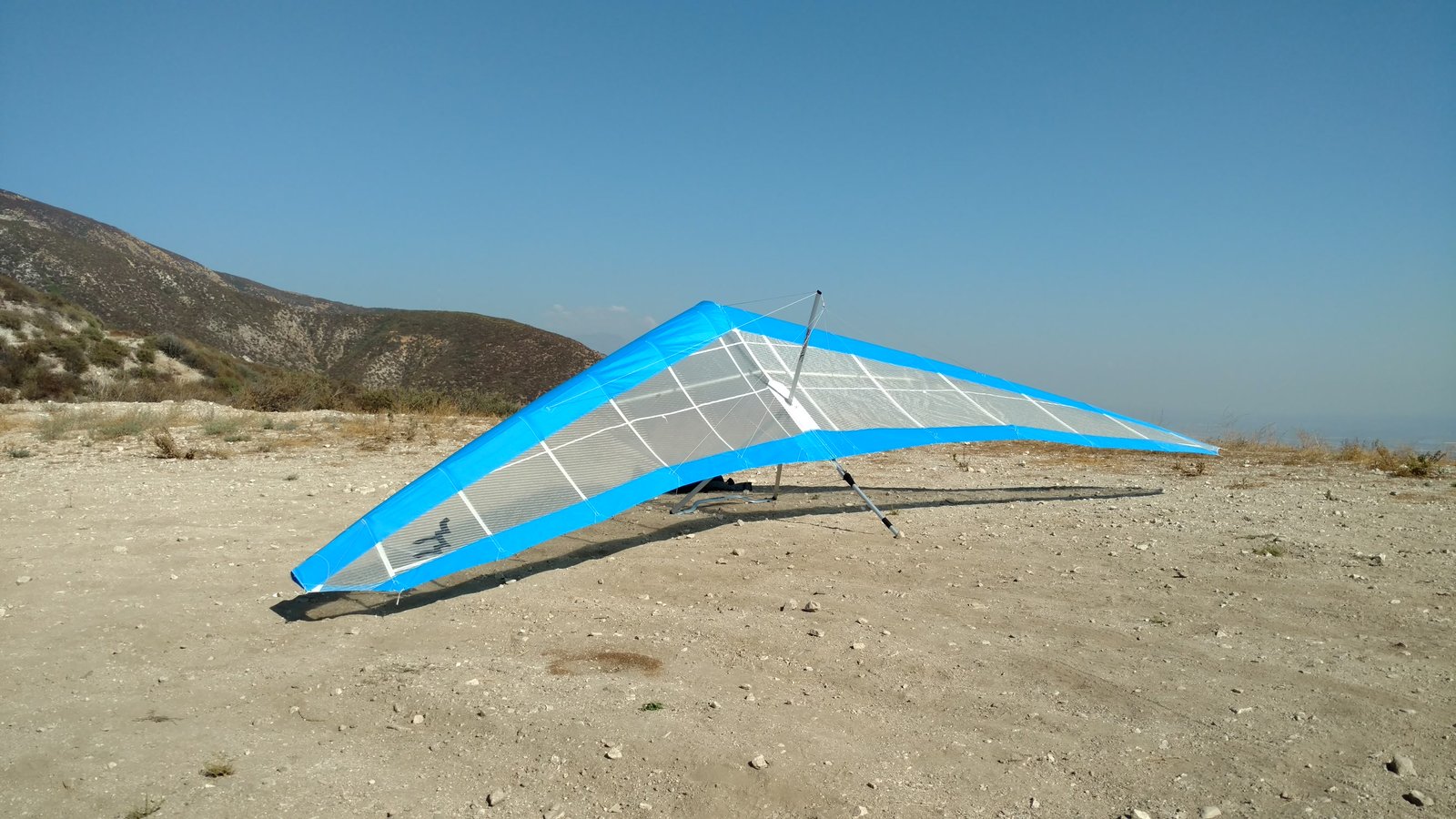 Slight left turn, twisted both tips one notch. Mylar sail, sleeved downtubes. Clear and warm. First flyable day after a long stretch of Santa Anas. |