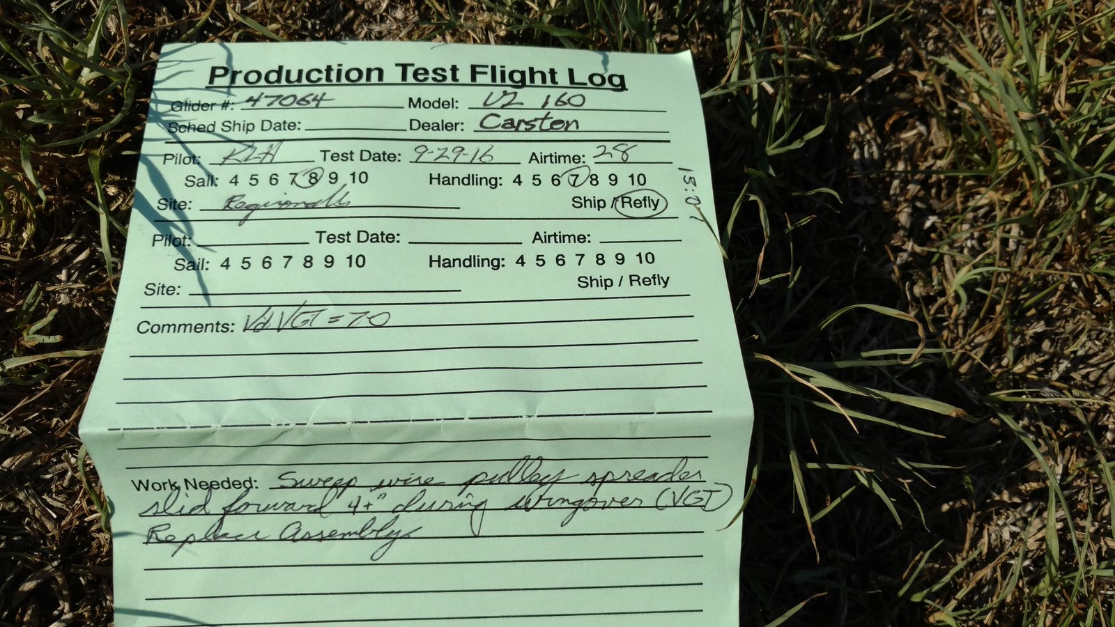 Good. Didn't find any lift. A bump over the ranch house then big sink. Landed heading SW with slight tail wind. Almost touched the nose to the grass. |