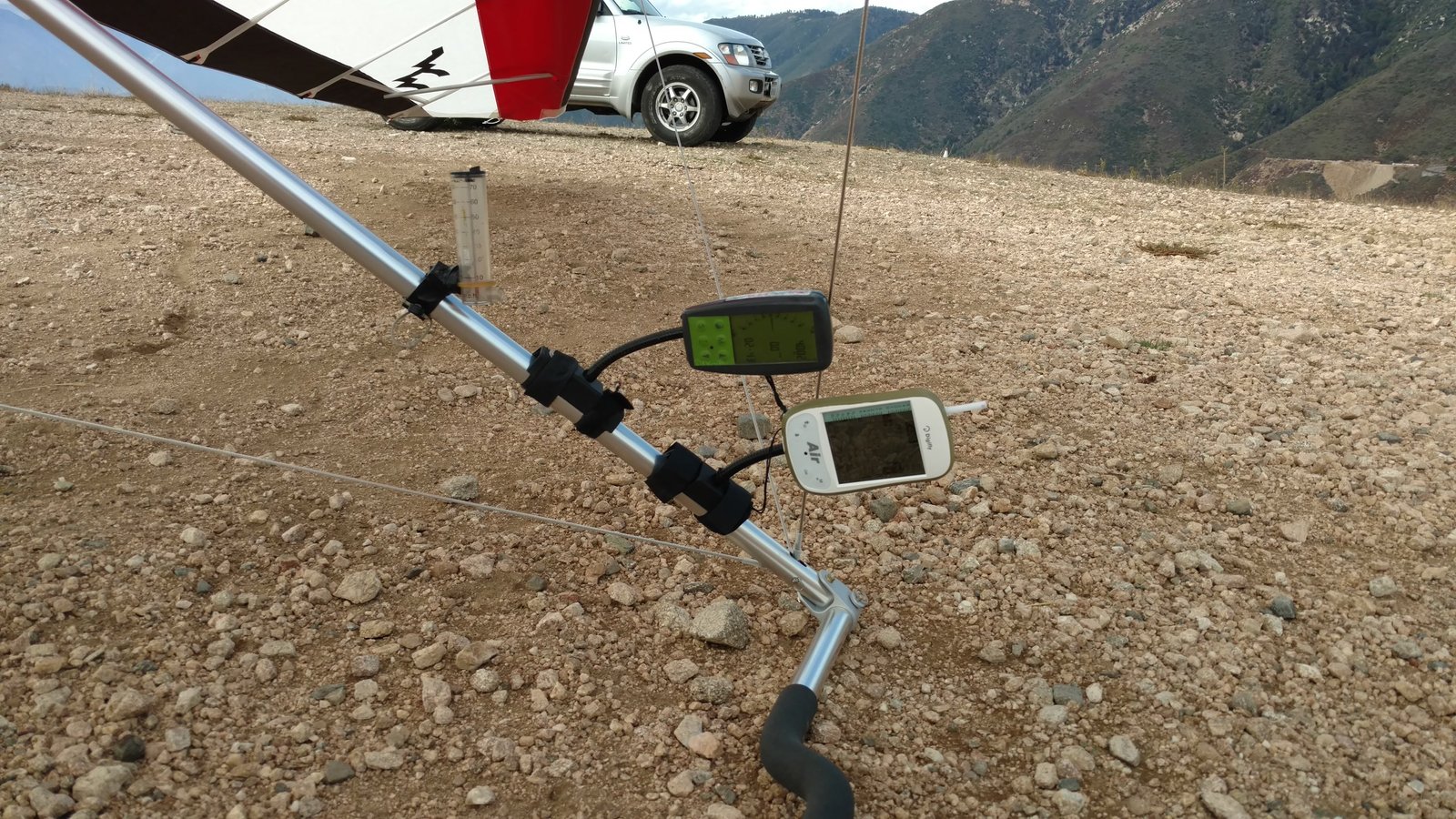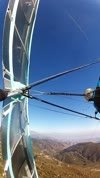 Good. Stable trim. VdVGT=51. 10-15 lbs/hand VGT; lowered sprogs one turn each. After a lull I launched directly into a thermal and climbed hundreds of feet right away. Left for Crestline at 5,350 and veered to Billboard, arriving at 4,650. Found lift right against the hill to 5.5k. One talky good spin entry South of Cloud Peak. Good landing into light SW. GoPro on keel. |