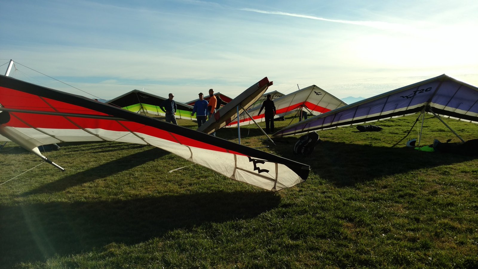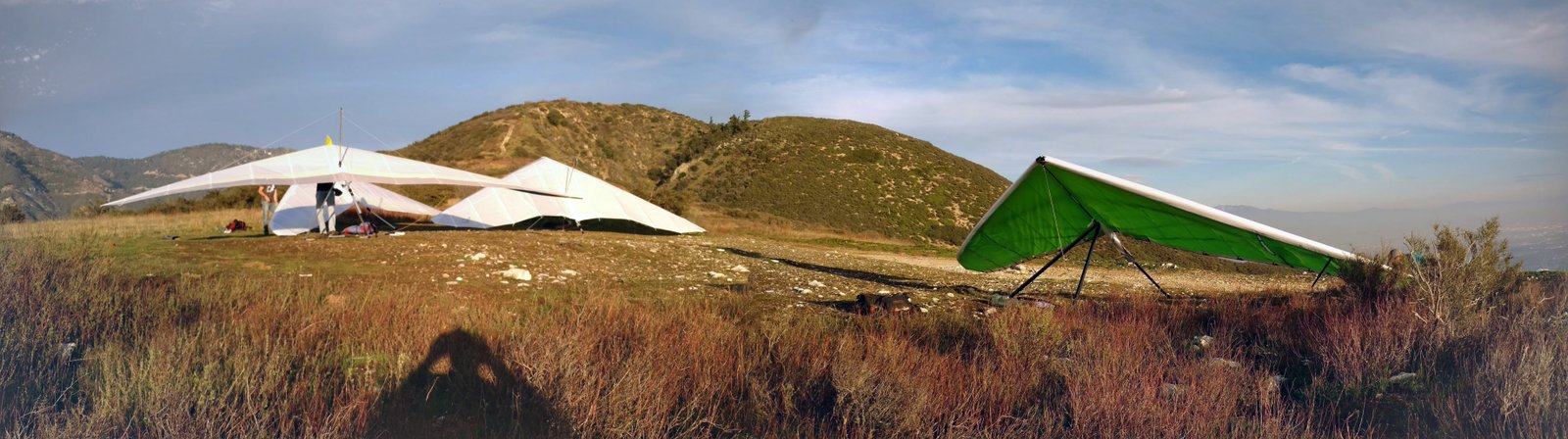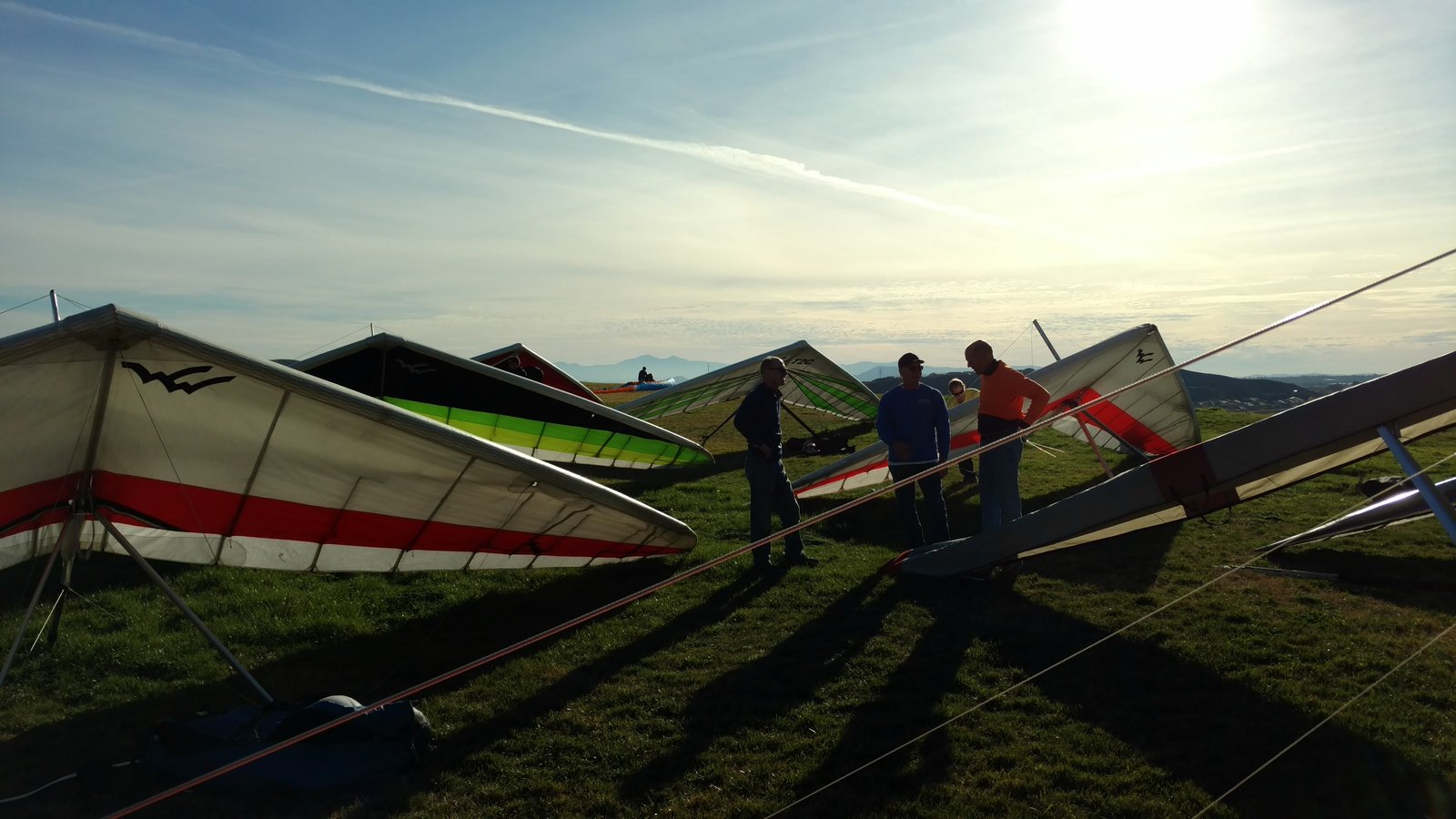 Good. Hot day, late-day boating. Top launch into a good cycle. Got a few hundred above launch after a while. Cloud and Regionals not on when I was there; also left when PG gaggles arrived. Scratched down by the 750, one last near-save. dove to land in a no-traffic period. Tight left-hand approach, milked the skim and hit a little puff at the end. Had a vertical wing no-stepper 6 feet short of the HG cone. |