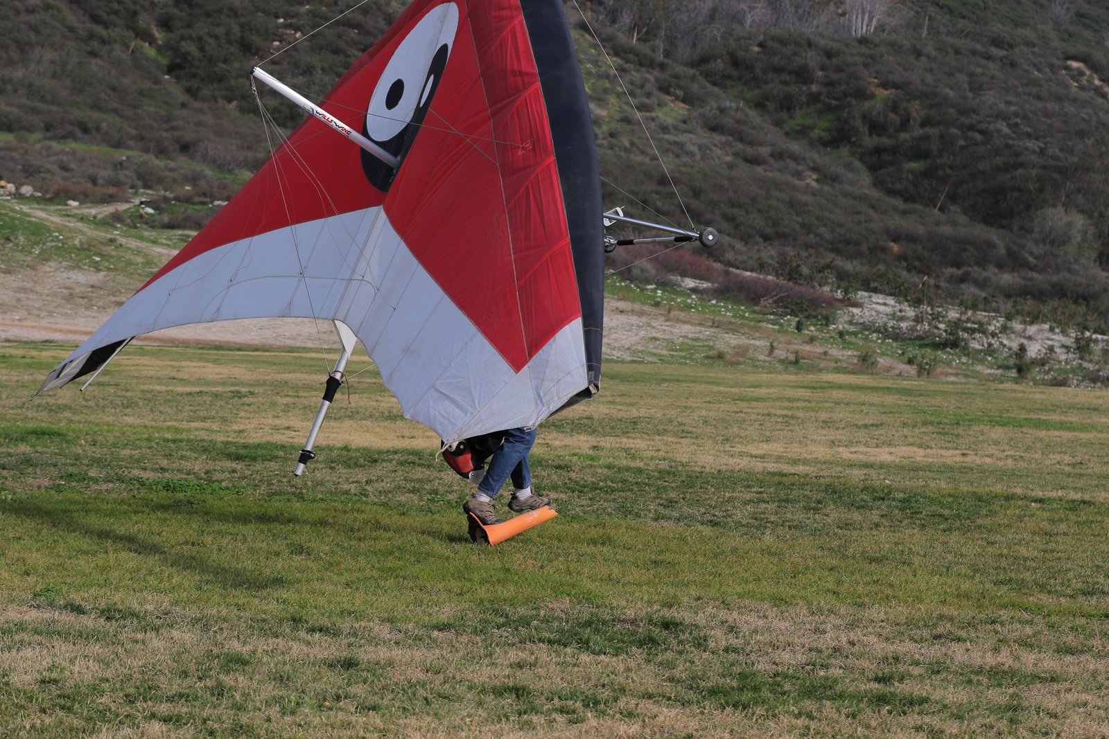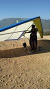 Hot and low inversion. Light 10-12 SSW at launch. F4 195 with 3-inch longer legs, fixed trike gear. My first flight with it. Rolled down the ramp very easily, lifted off about 3/5 of the way down. Harness comfortable. downtubes in easy reach. Punchy cores right off launch. I steered with hands on downtubes and feet on "basetube". Trim speed was about 19 in this position. Turning in the first thermal I was porposing for the first few circles because I'd push out with my feet a bit while shifting my butt to the side. Pitch pressure feedback diluted by legs while focused on arms. Was able to climb effectively but not as efficiently as I would have prone. After flying for about 20 minutes I tried letting my legs hang when entering a thermal (very comfortable, BTW) and found that I could map-out the thermal better by steering with just my hands for a couple of turns then putting the feet up and steering with both, which was less tiring. Comfortable fairly close to the hill and circling with PGs. Tried various foot positions - out on the steering pegs was OK but the pivoting made steering with legs much harder; on the bars out front worked. Feet on the basetube was effective and easy but I wouldn't want to have to have my legs that bent for an entire long flight. Trimmed 1 MPH faster with my feet out front. Could just reach the rear wheel struts with both hands and that seemed like an interesting steering option. Was just barely into a mush while holding the struts so roll was difficult. I did find that usually when drifting wide in a thermal and getting gently rolled out I would have to speed up and then roll and push out fractionally to make a crisp correction. Response to weight shift alone was too slow. Did a few roll reversals and it was consistently slower than a 195 prone but not too much. I did a set of very shallow wingover-type turns and had no surprises. Late in the flight I was down above the pond after flying from Last Chance with just my legs. Found a gentle thermal and worked it up to the 750 with just my legs - not difficult. Changed themalling direction mid-climb for the heck of it. At the 750 I was getting close tot he hill so I added the hands back in and climbed up the spine to below Cloud in that same thermal. Had the GoPro on the rear keel and got the whole flight. The angle isn't good for seeing what my feet are doing. I thought I had had my hands off the downtubes a lot up high in the rowdy air but the video shows it was always brief and tentative. In one sequence near Regionals I try to find a place to put my hands - the overhead spreader bar, the rear wires, my shoulder straps - kind of amusing. There was traffic, PG and HG, near the LZ so I did an extended fast dive to get down ahead of them, feet on the basetube and butt near my heels. Little effort, easy and predictable turning. Landing was smooth; experience with the McKenzie tandem wheel rig helped. I eased the bar out slowly during the short ground skim and still bounced the rear wheels a tiny bit - they're soft and the struts have some flex. Very short rollout in typical 5-10 SW on the grass. 30 feet short of the HG cone vicinity IIRC. |
